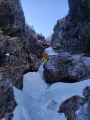 Percorrere canale fino a intercettare sosta a spit a destra scendendo. Da questa sosta doppia di 60 m fino pianoro innevato nei pressi S2.