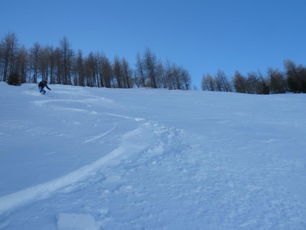 Da Podio Inf. 100 metri a piedi e poi si mettono gli sci. Le condizioni della strada sono buone per lo sci perchè la neve non è tanta ma ben pressata da passaggi di fuoristrada e per il momento si sale e si scende bene. Da Neraissa in sù abbiamo seguito una vecchia traccia che ha tenuto tutta la dorsale di dx su neve molto ventata. Raggiunta la cima di Varirosa abbiamo proseguito per il Monte Autes e da lì siamo scesi x un tratto sulla dorsale verso Podio Sup. (neve ventata morbida) x poi tuffarci nella farina del lariceto rivolto a nord. Il pendio offre delle bellissine radure su pendenze di tutto rispetto. Per arrotondare il dislivello siamo risaliti un tratto sul pendio assolato tra le 2 cime ma qui la neve in discesa è solo discreta. Molto scorrevole il rientro su strada da Neraissa all’auto.