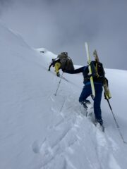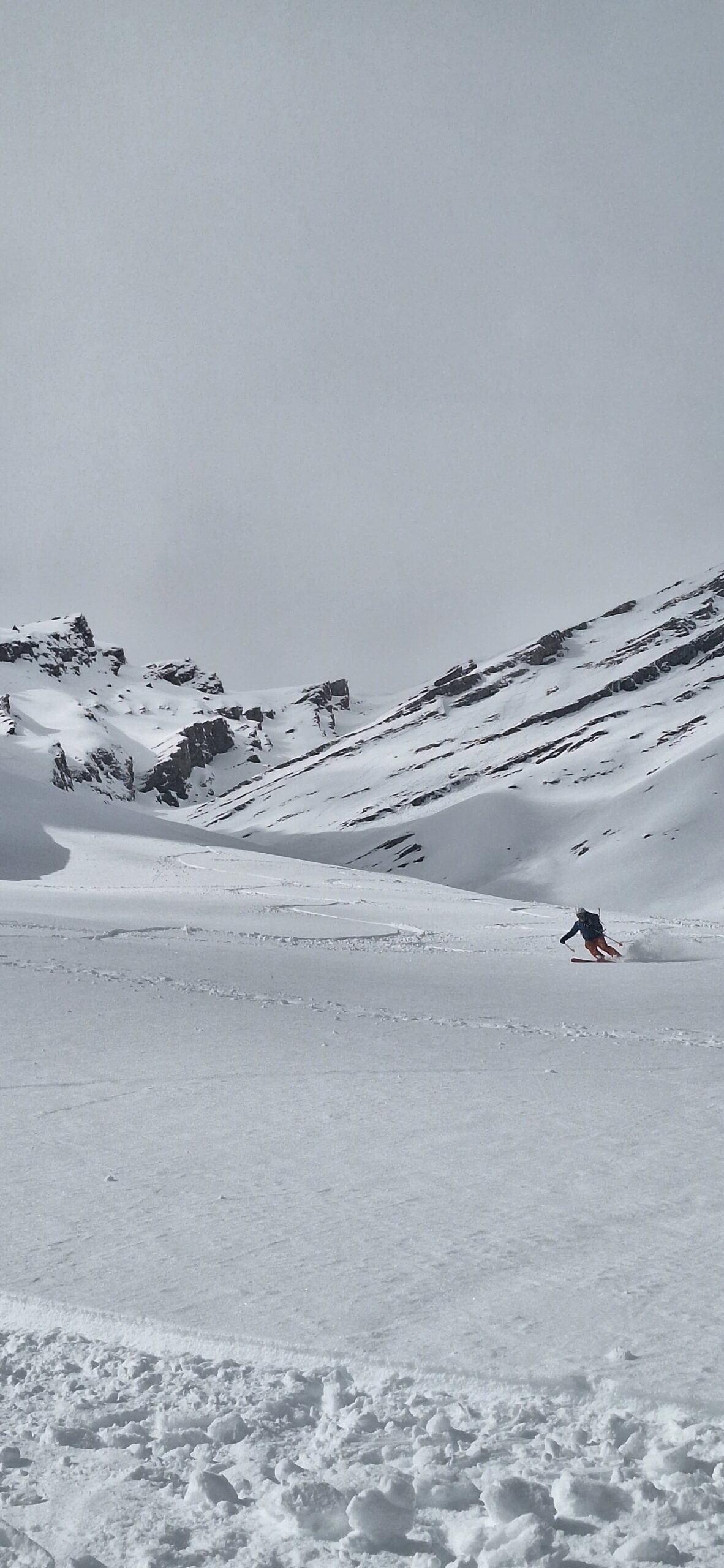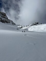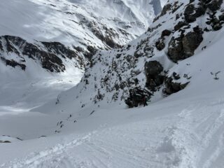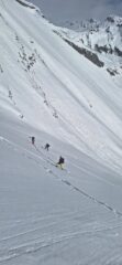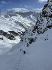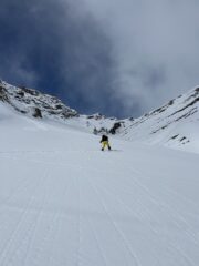 Capitati su questo bell’itinerario come ripiego, respinti da una strada chiusa dall’altra parte della valle, troviamo condizioni strepitose. I 20/25 cm di neve caduta verosimilmente martedì non sono toccati dal vento. L’innevamento qui, e direi su tutti gli itinerari della zona, è ottimo. Non abbiamo toccato pietre. La neve nel canalone che abbiamo percorso era molto abbondante , tanto da creare in me , animo delicato, un po’ di patemi. Tuttavia la neve era piuttosto compatta, nessun assestamento e alla fine ci ha regalato una sciata quasi perfetta fino alla macchina. Vorremmo dire che siamo stati astuti , ma è stata una gran botta di culo. Ci aspettavamo neve un po’ crostosa e invece….