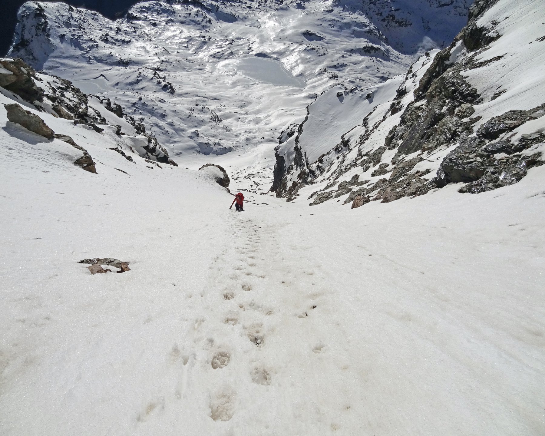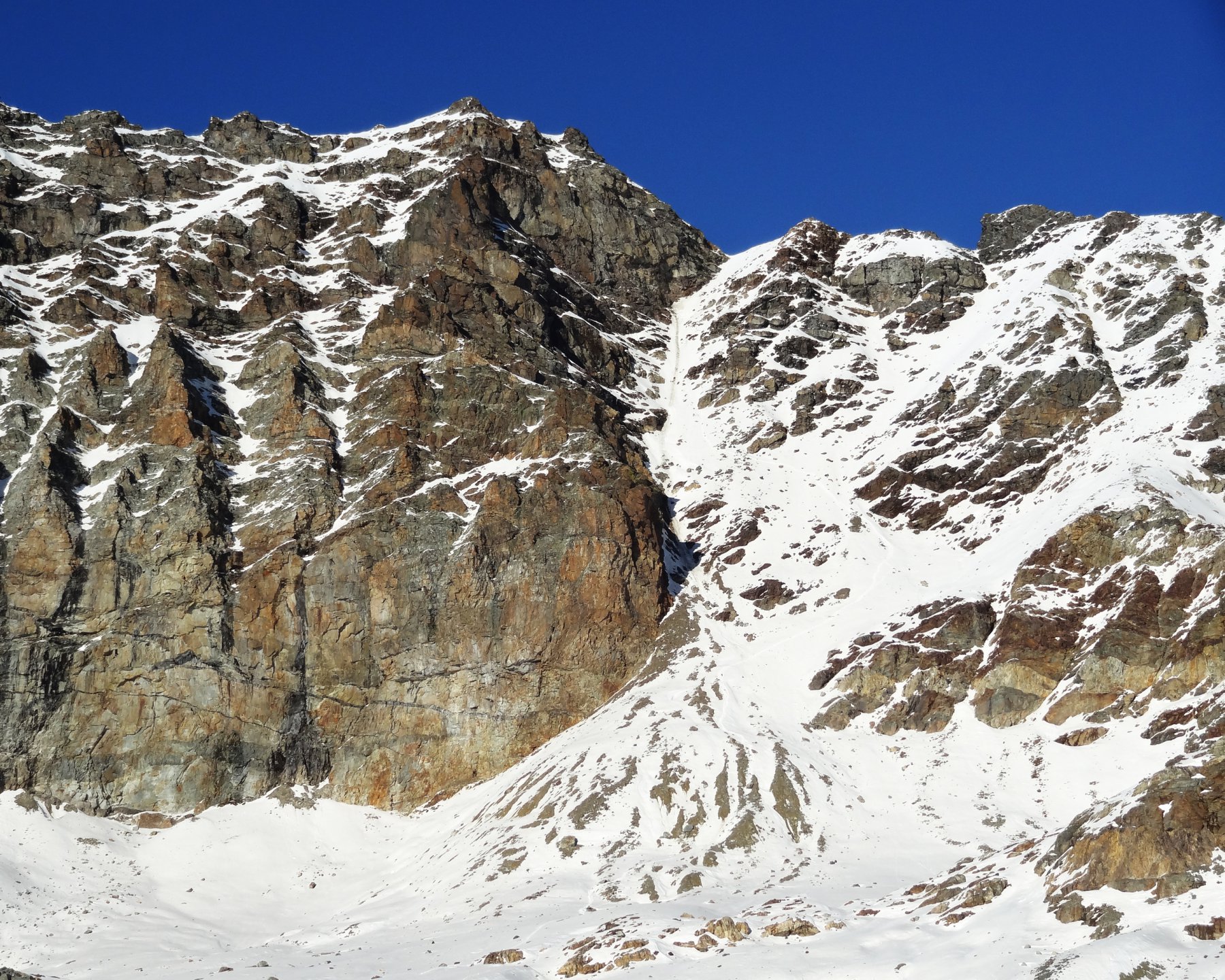 Da qui la bastionata del Piz Varuna appare nella sua grandezza. Portarsi nei pressi della bastionata rocciosa, puntando alla base del ripido canalone posto a destra della cima principale. Il canalone può essere innevato o composto da sfasciumi a seconda della stagione.