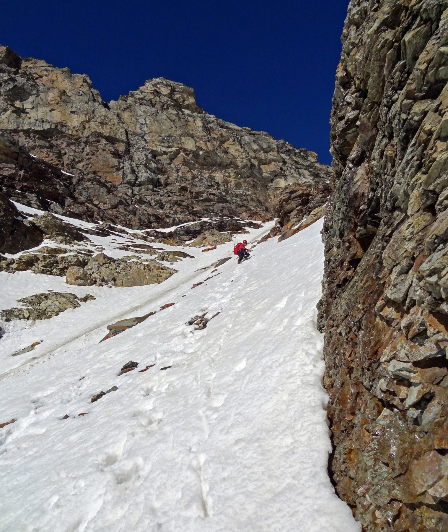 Percorrerlo con pendenza sempre maggiore (fino a 45°) fino alla sua parte più stretta che conduce ad una selletta molto esposta su entrambi i lati. Da qui salire verso ovest (sinistra) per i facili spalti di roccia non sempre solida fino alla cima pianeggiante.