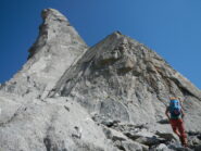 Proseguire sino alla evidente parete in corrispondenza del diedro inclinato verso dx dove inizia la via. circa 45 minuti dalla Giannetti.