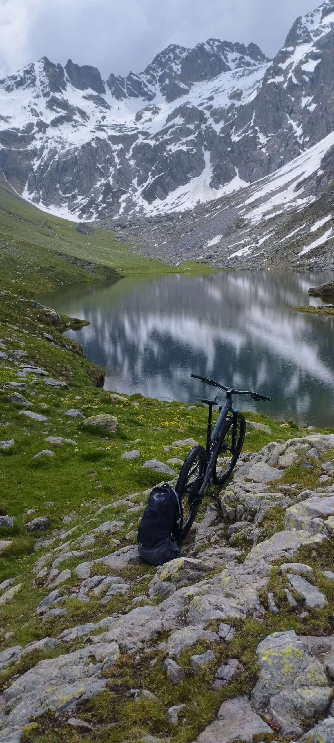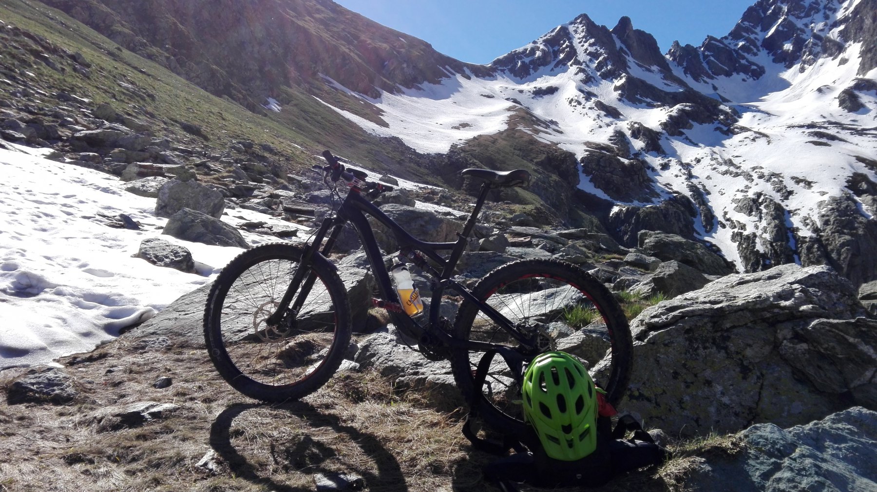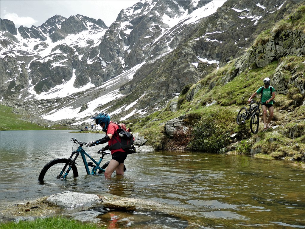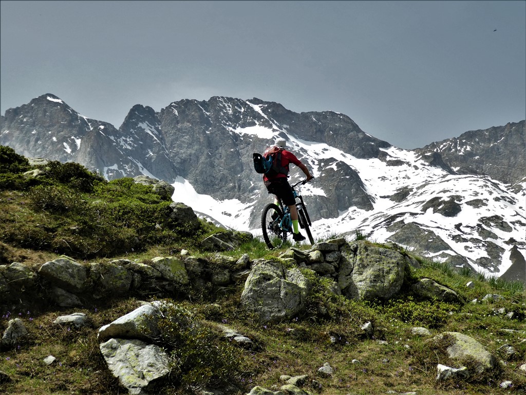 Volendo, dal lago si può proseguire verso il Col del Vej del Bouc: si pedala ancora per poco, poi è tutto portage /spintage su sentiero a volte esposto.