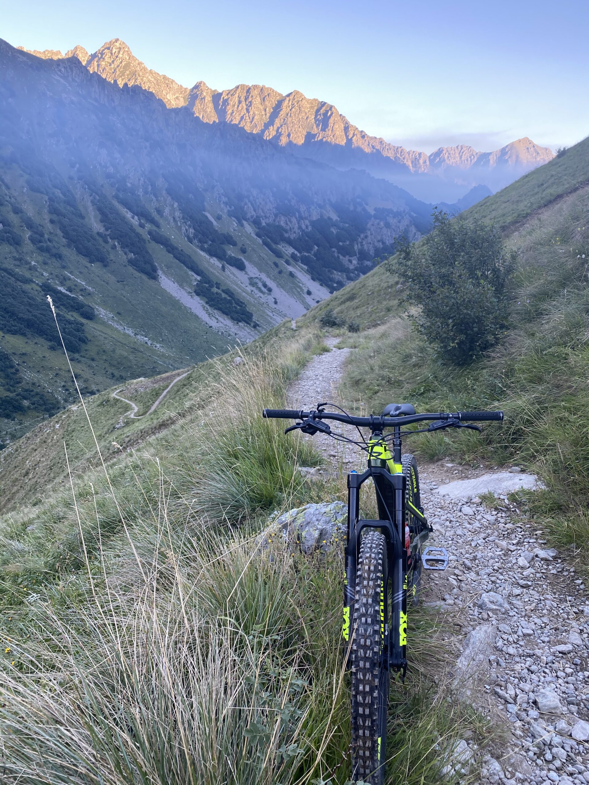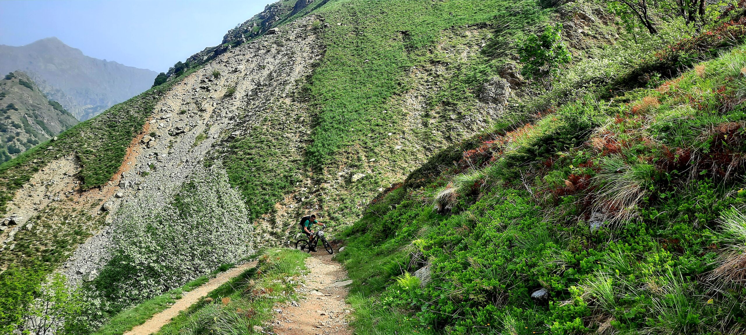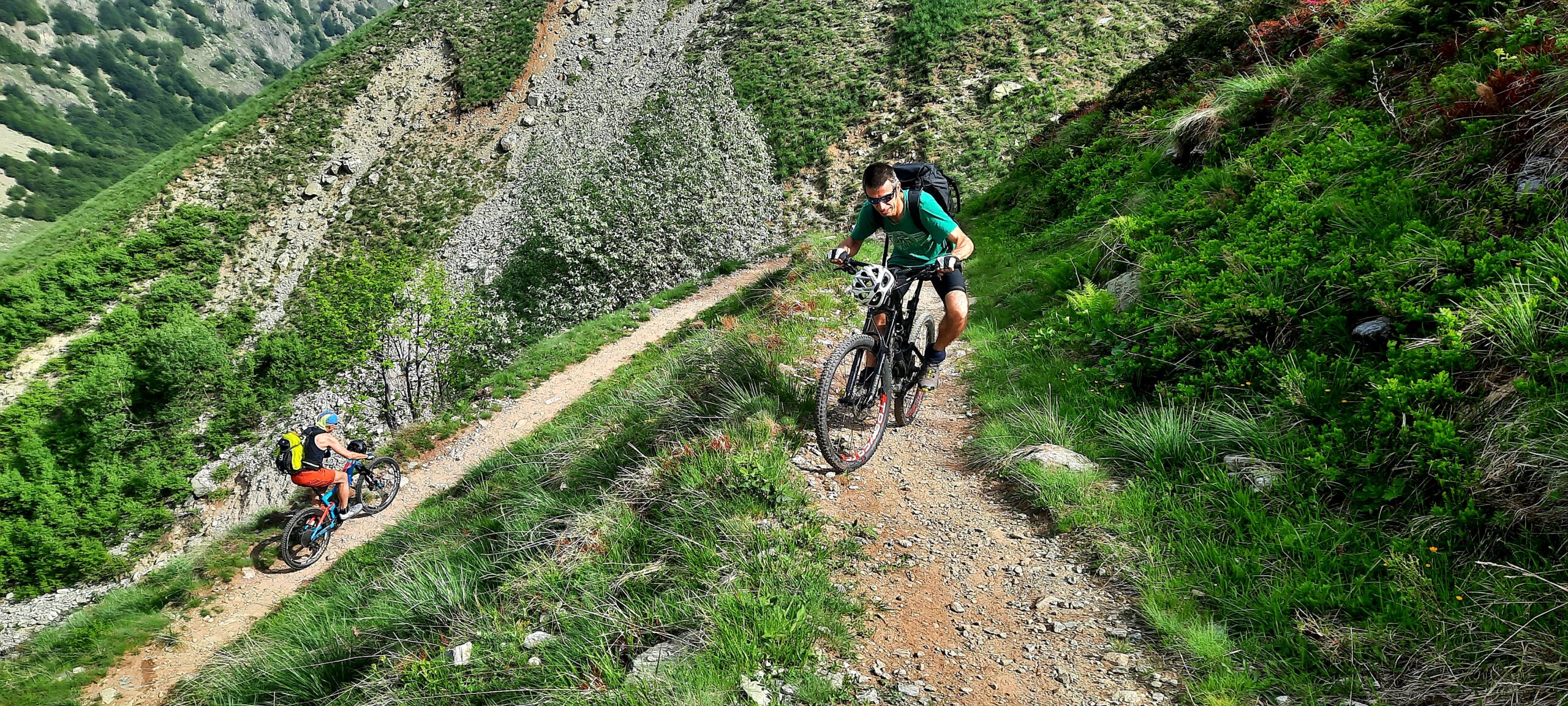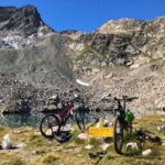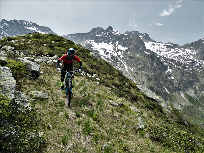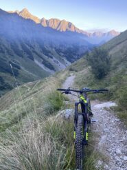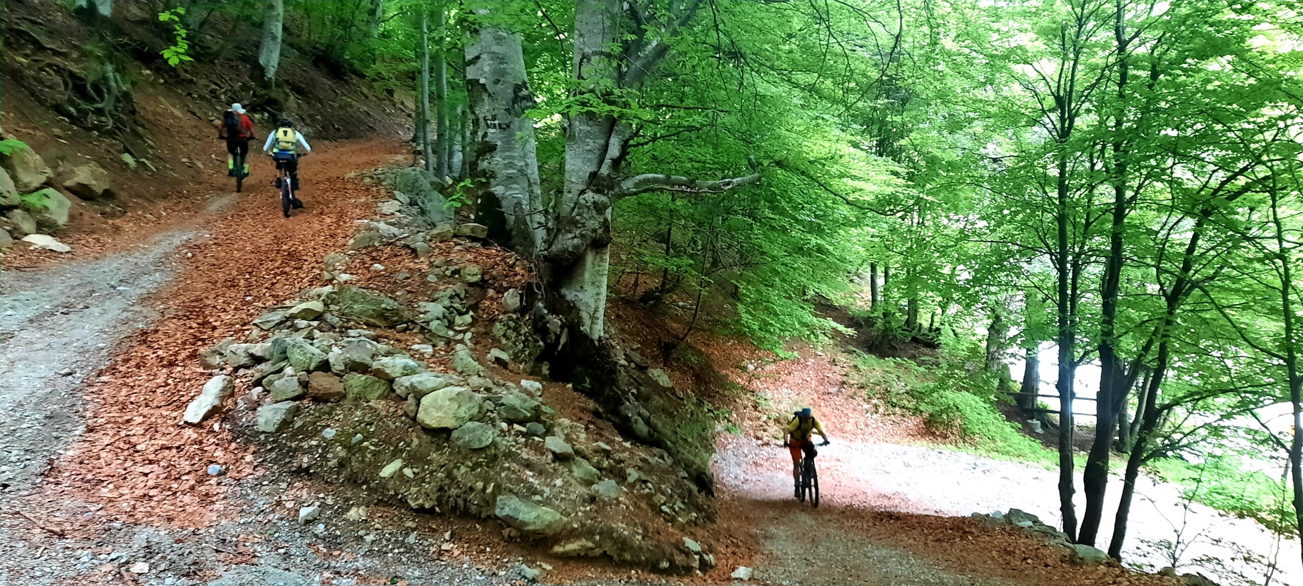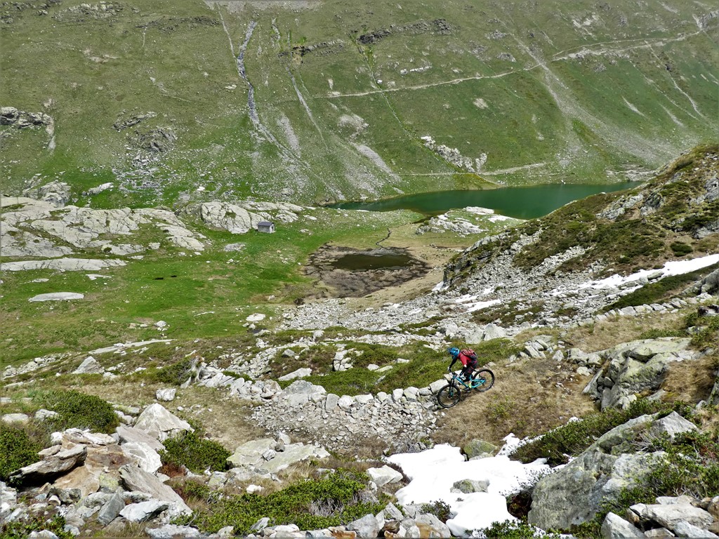 Discesa: lungo l’itinerario di salita. a parte i primo 800m dal lago che richiedono capacità trialistiche e equilibrio, il resto è un fantastico e scorrevole single-track fino all’auto.