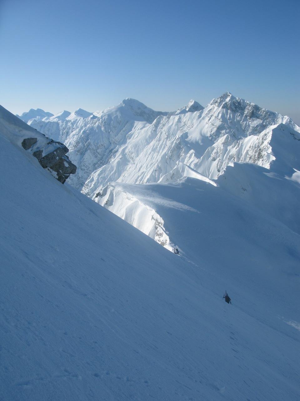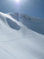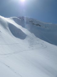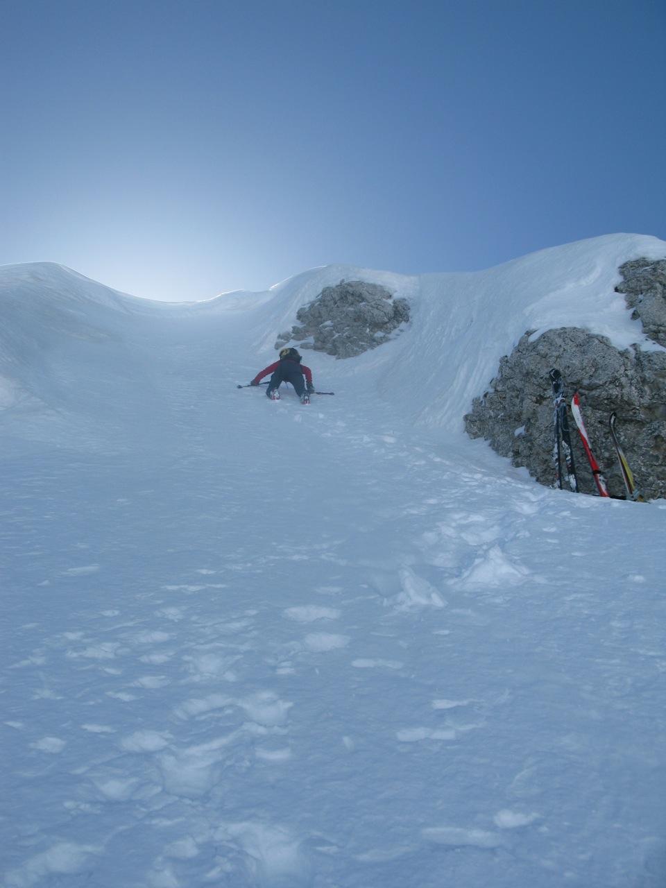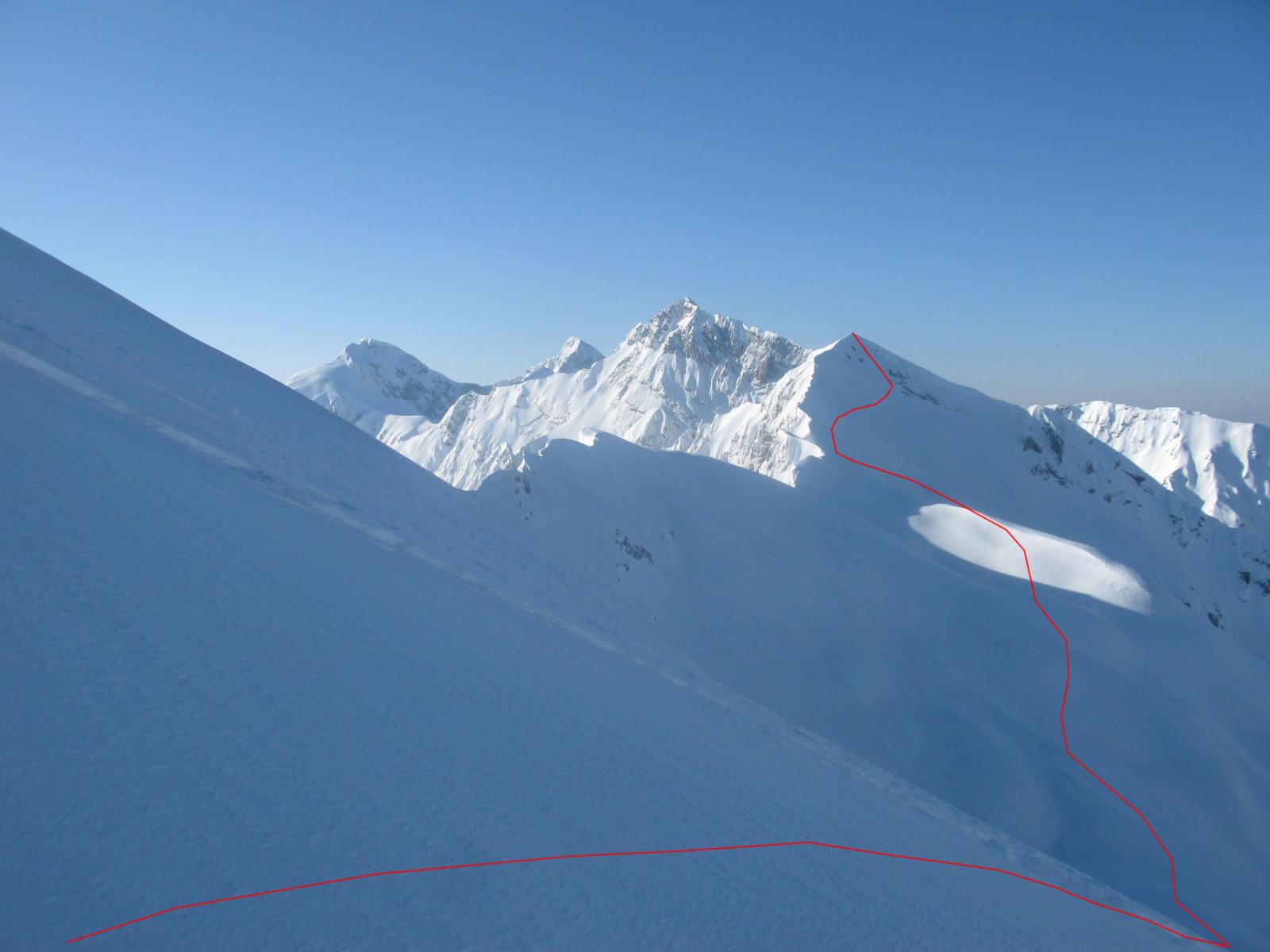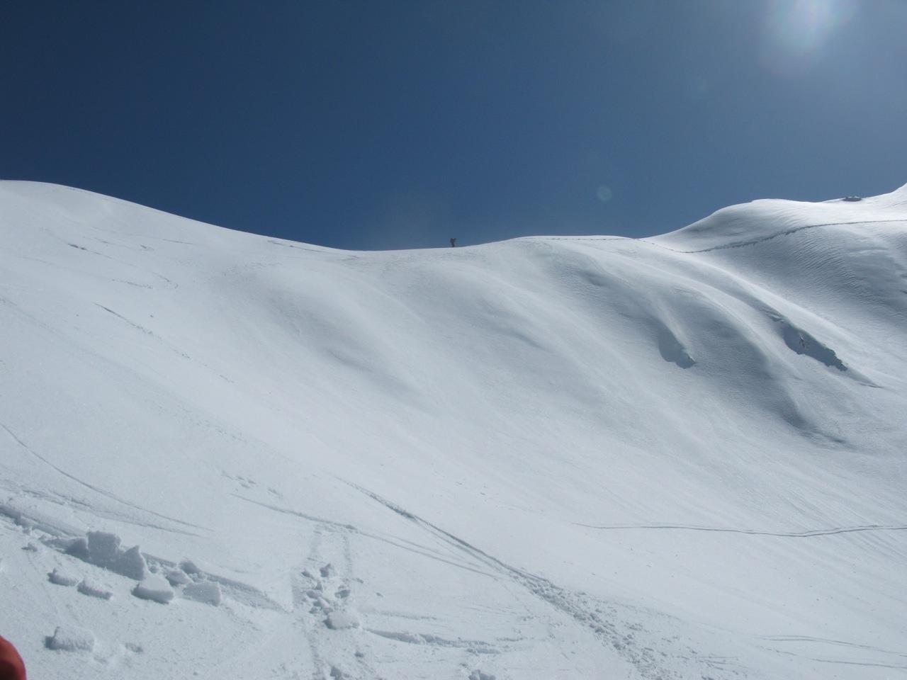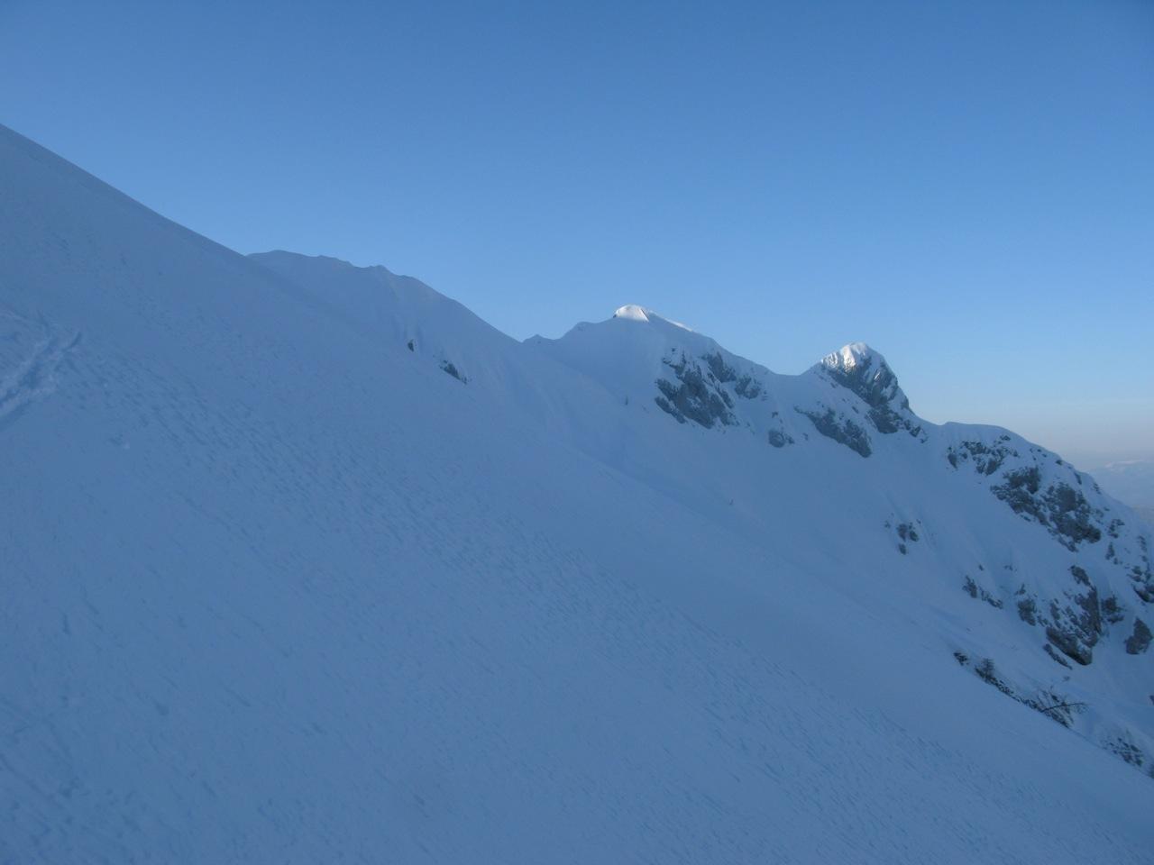 Dopo la cima si prosegue, senza mai abbandonare la cresta, in direzione N verso la vetta del Crep Nudo, che si raggiunge dopo un ultimo ripido pendio in direzione NO.