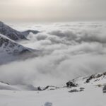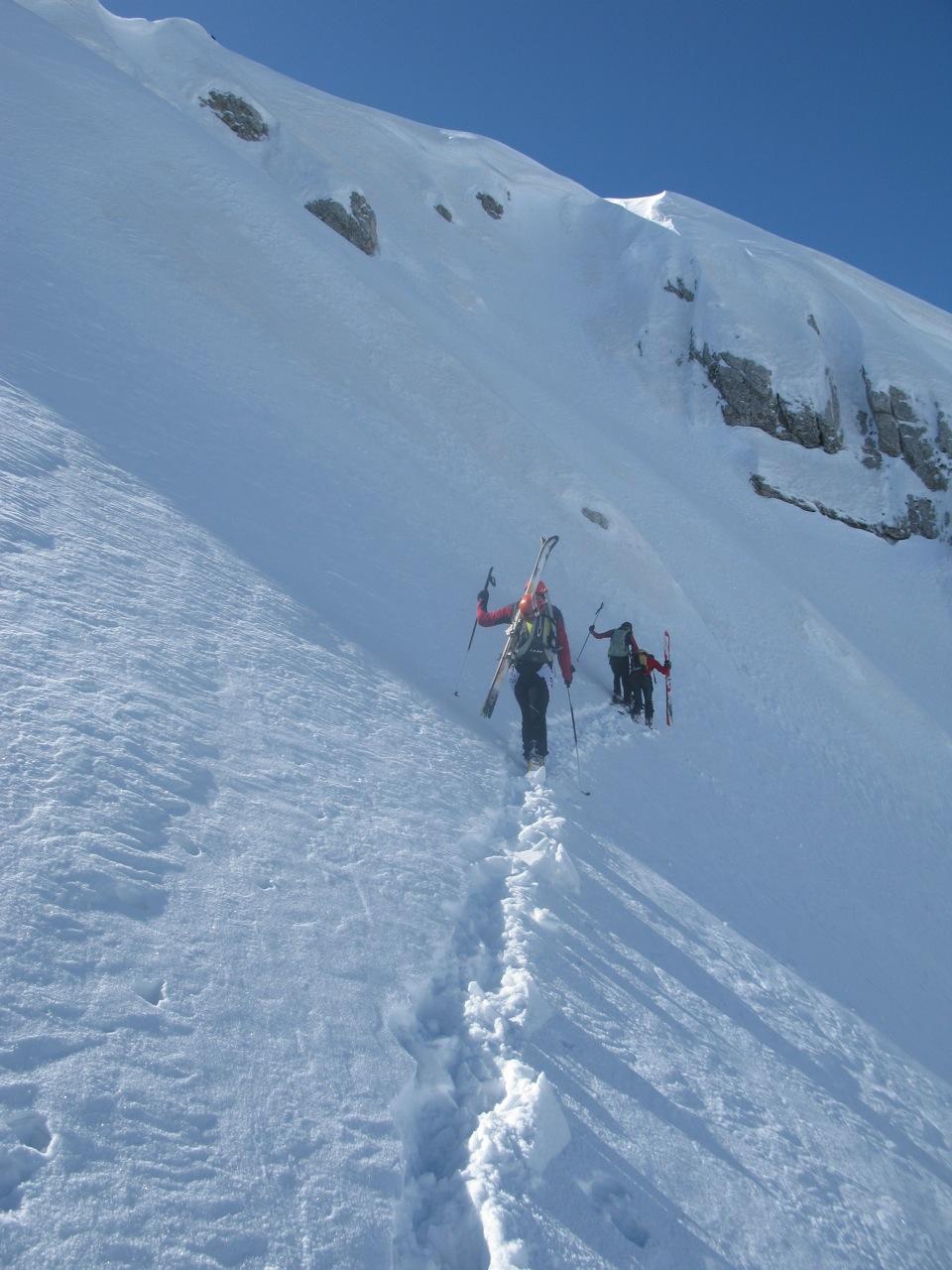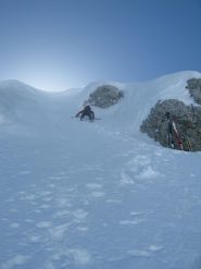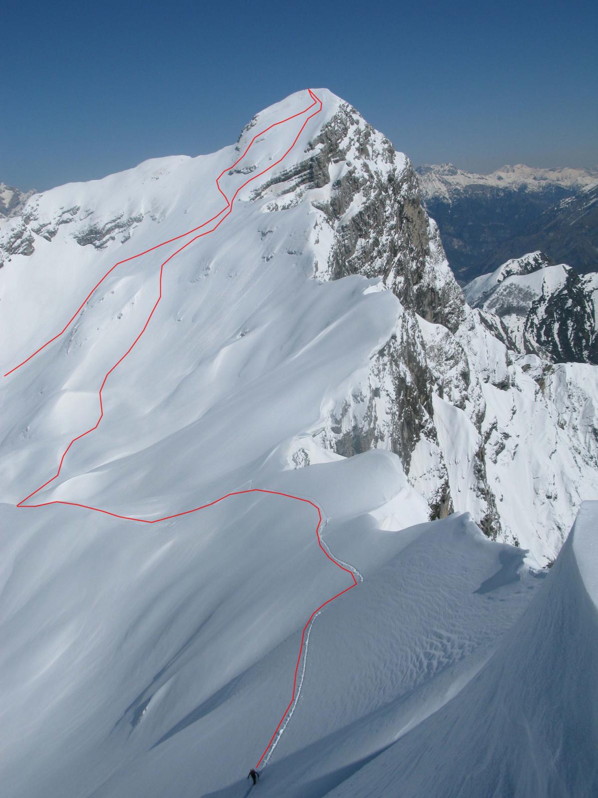 Da qui si inizia la discesa per l’itinerario di salita (prestare estrema attenzioni in caso di nevi ghiacciate, pendenza fino a 42°/45°), fino a quota 1700 circa, in corrispondenza di un evidente ripiano sotto il pendio che porta alla forcella Venal. Si risalgono quindi i pendii di destra (scendendo) in direzione NE fino alla cresta, e da questa verso sinistra fino in cima, per percorso di buon impegno alpinistico.