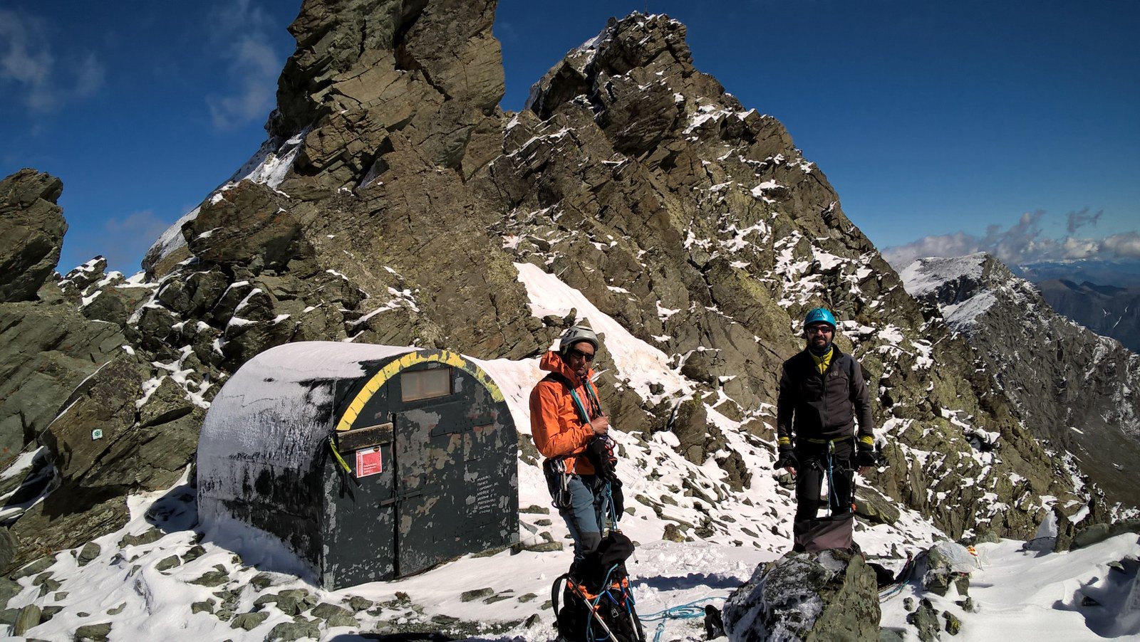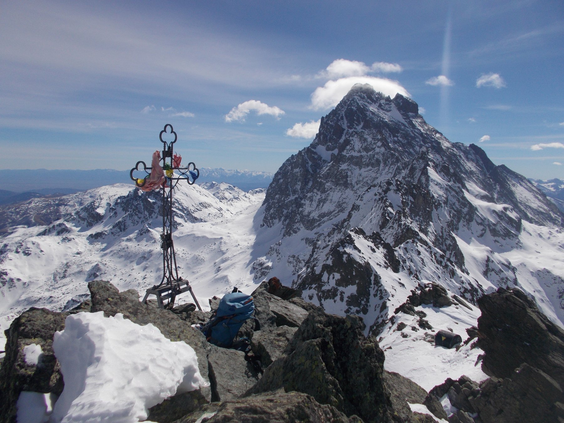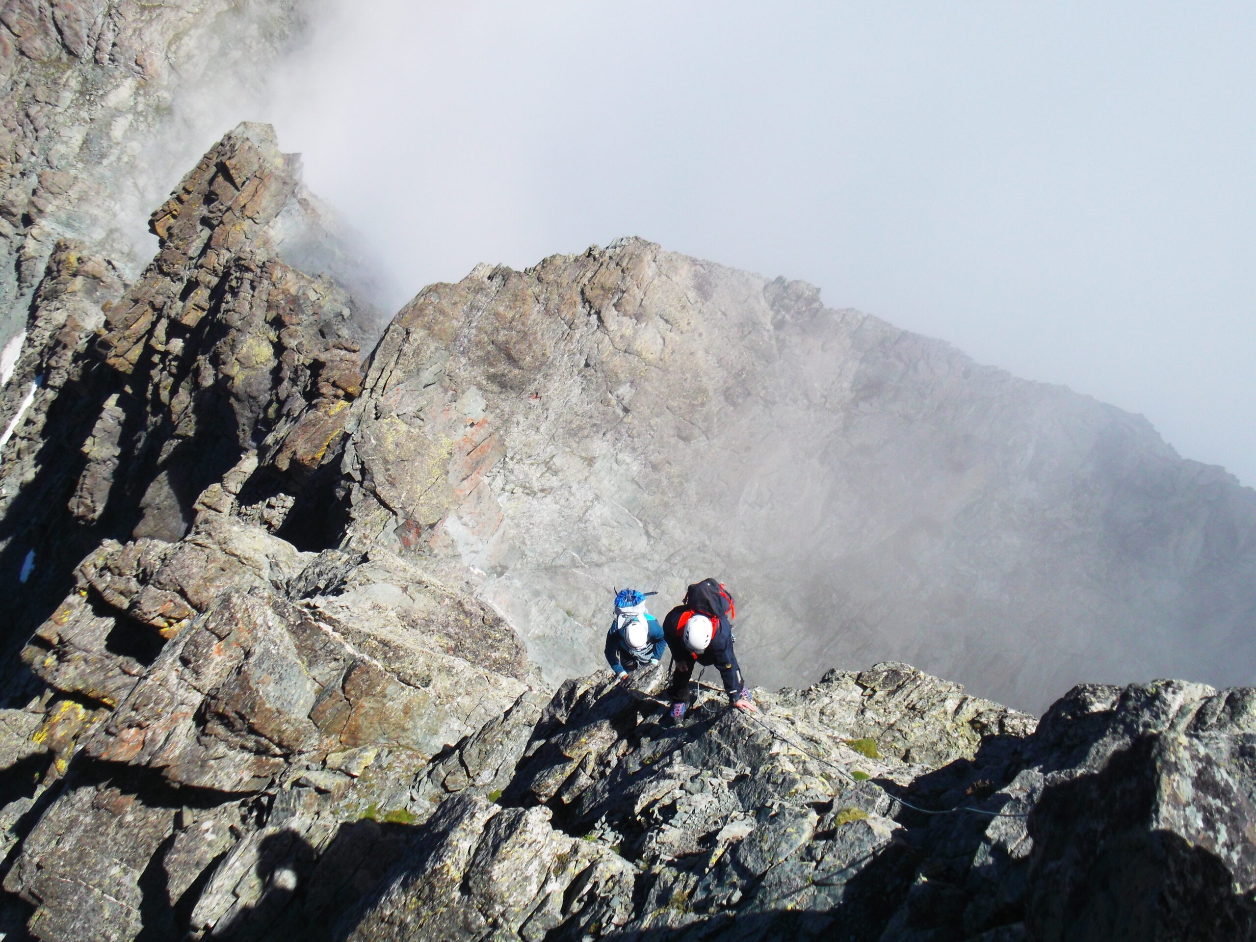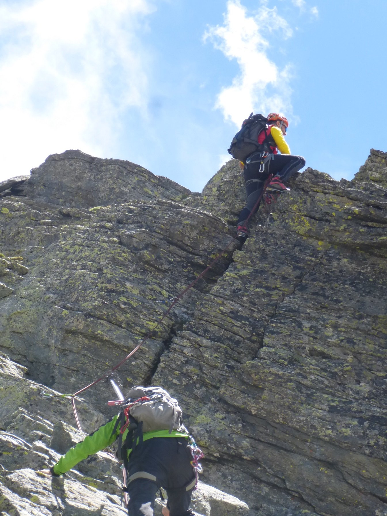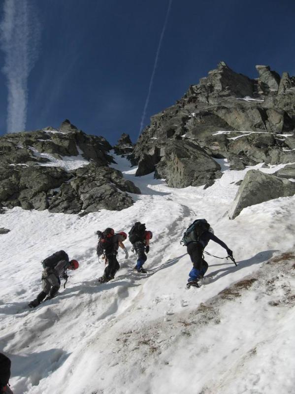 Discesa: Dalla via normale al colle del Couloir del Porco, quindi per il canale est di neve (40/45° possibile cornice al colle) o per la via attrezzata in sx orografica.