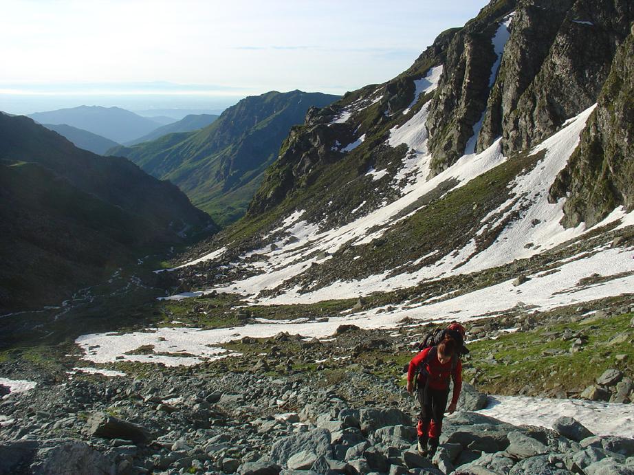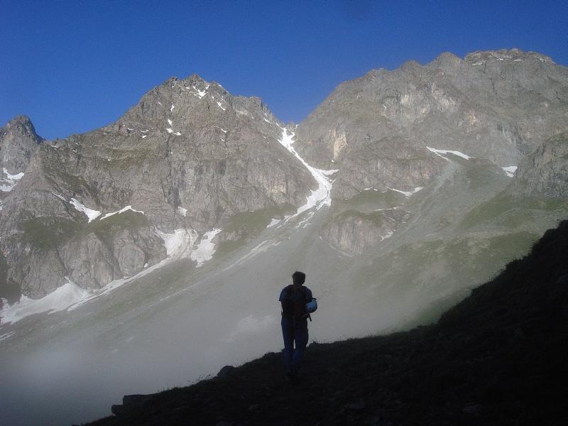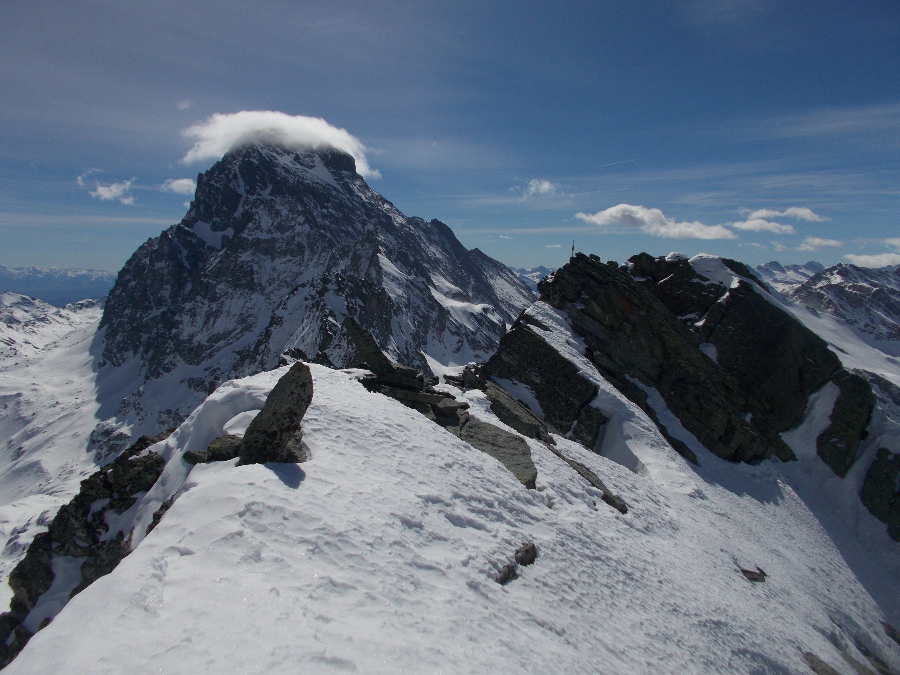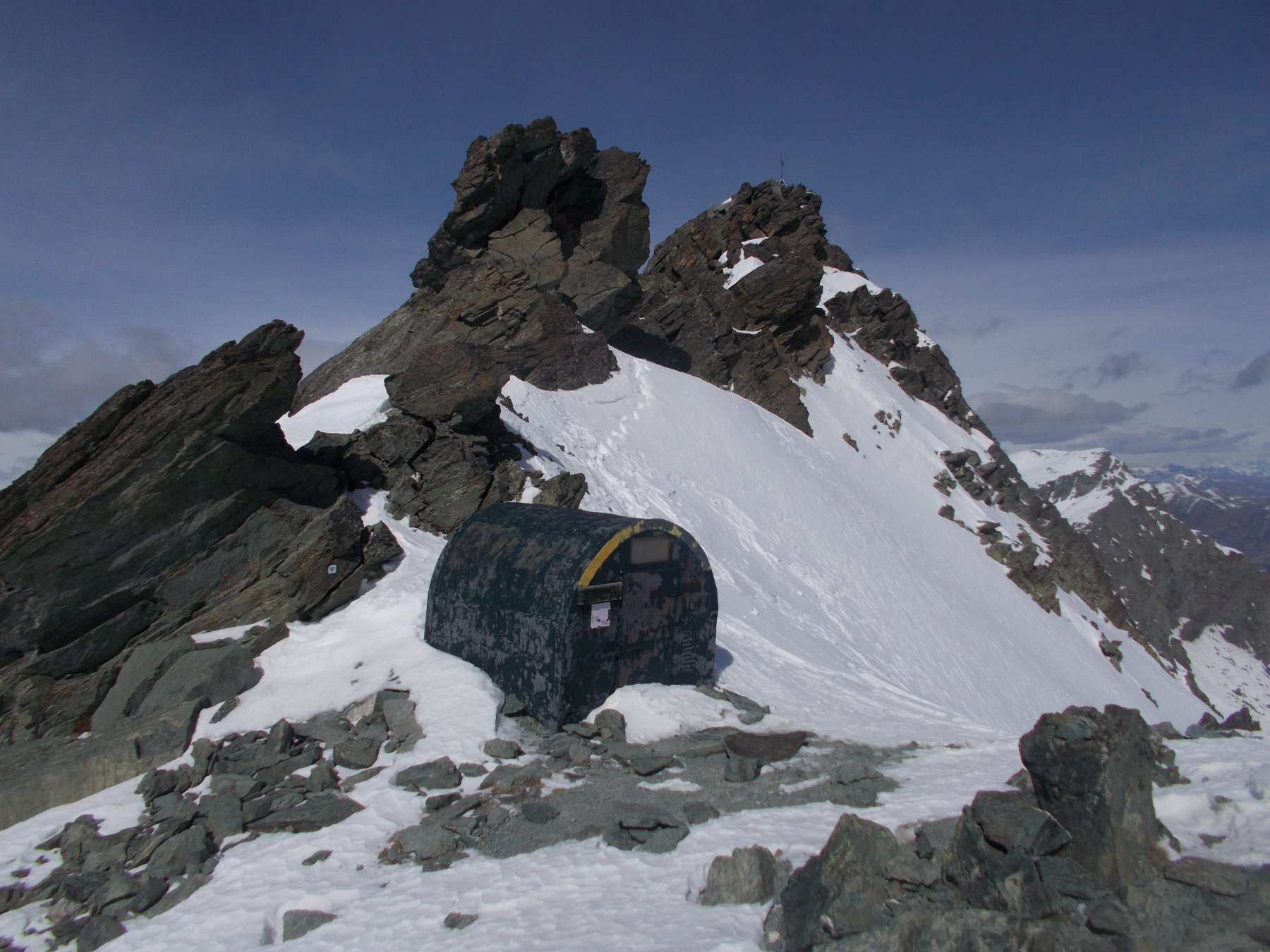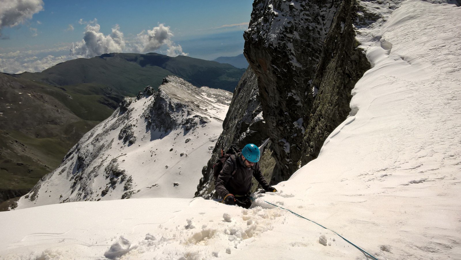 Discesa: Dalla via normale al colle del Couloir del Porco, quindi per il canale est di neve (40/45° possibile cornice al colle) o per la via attrezzata in sx orografica.