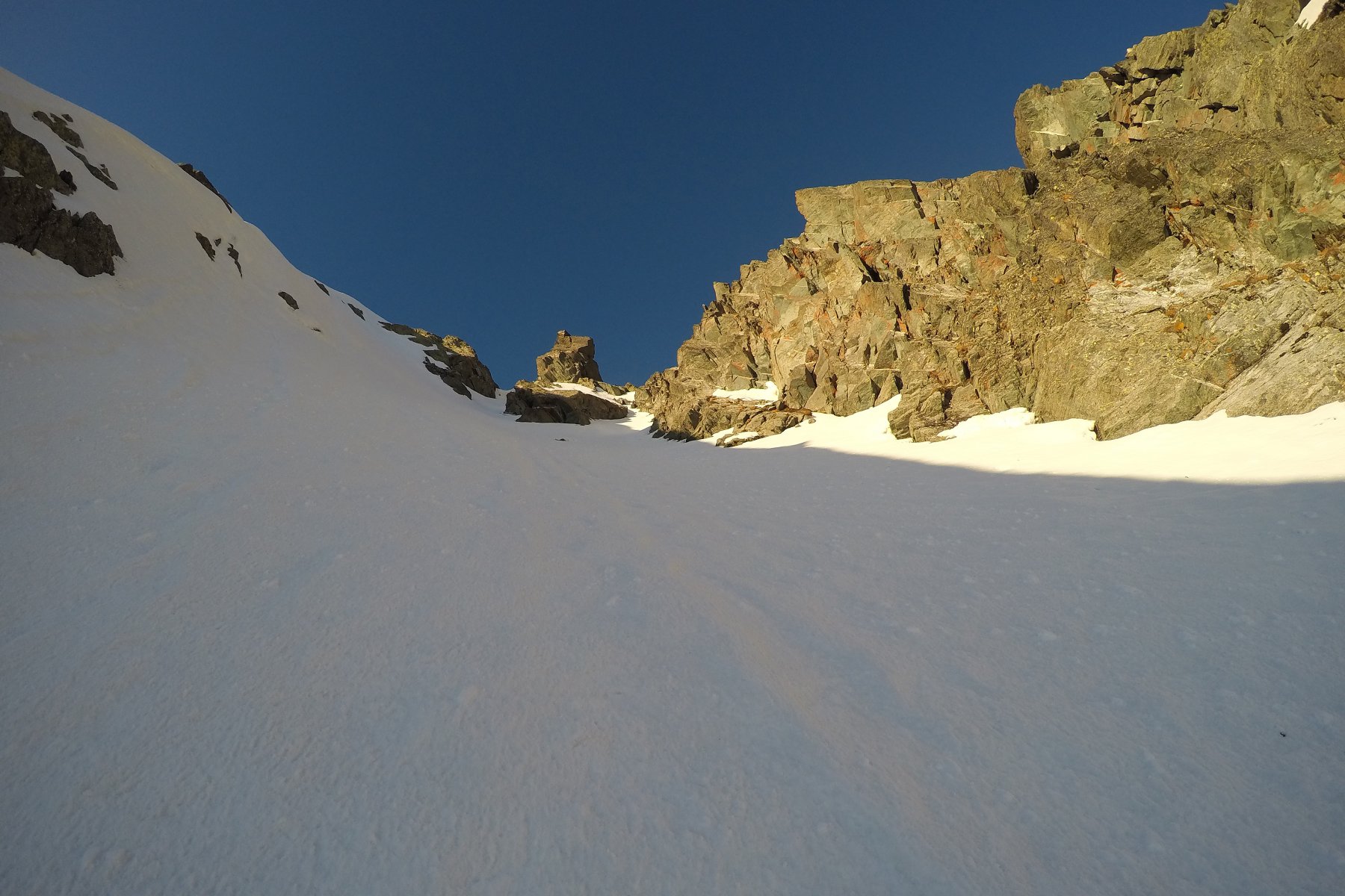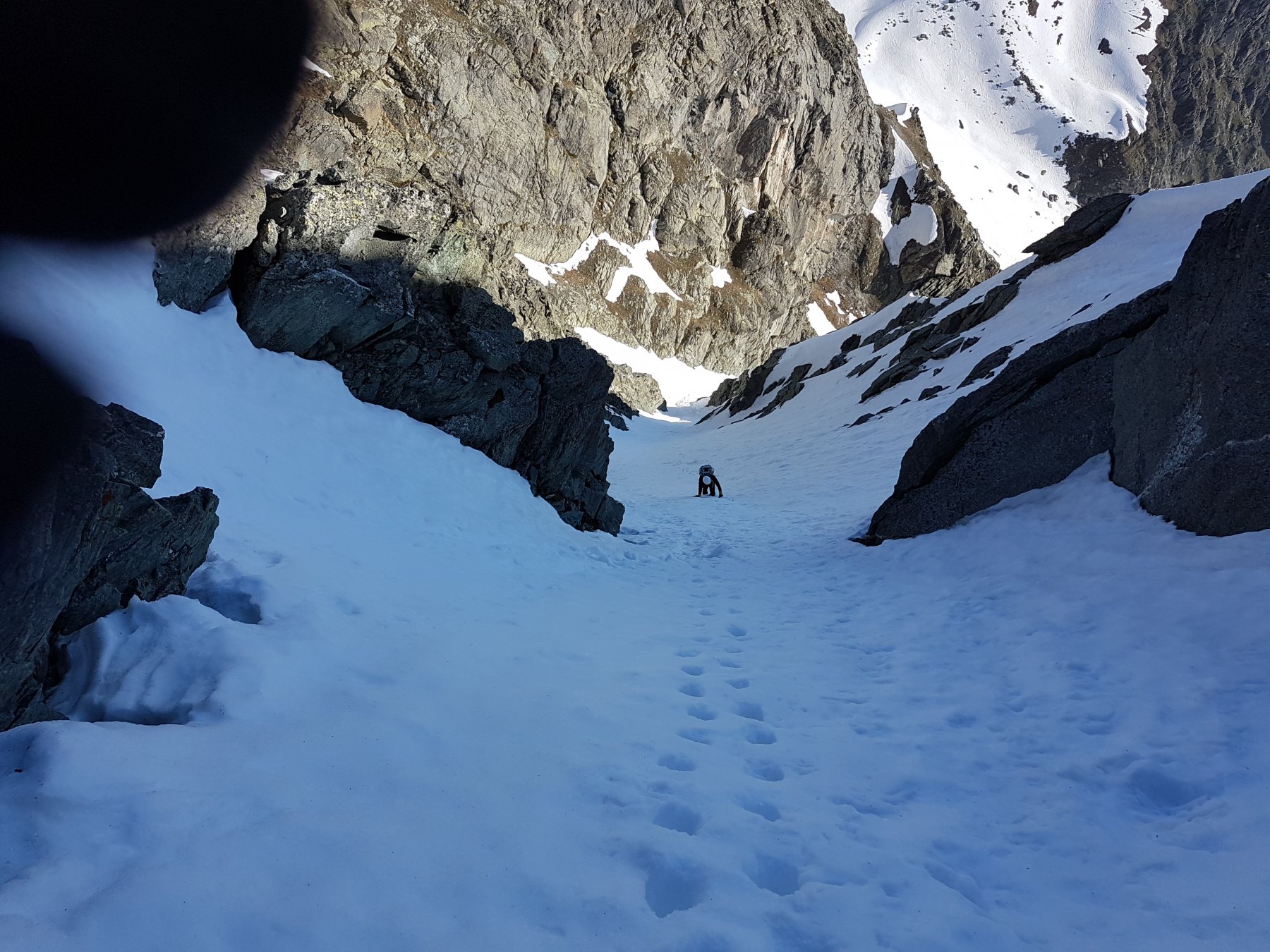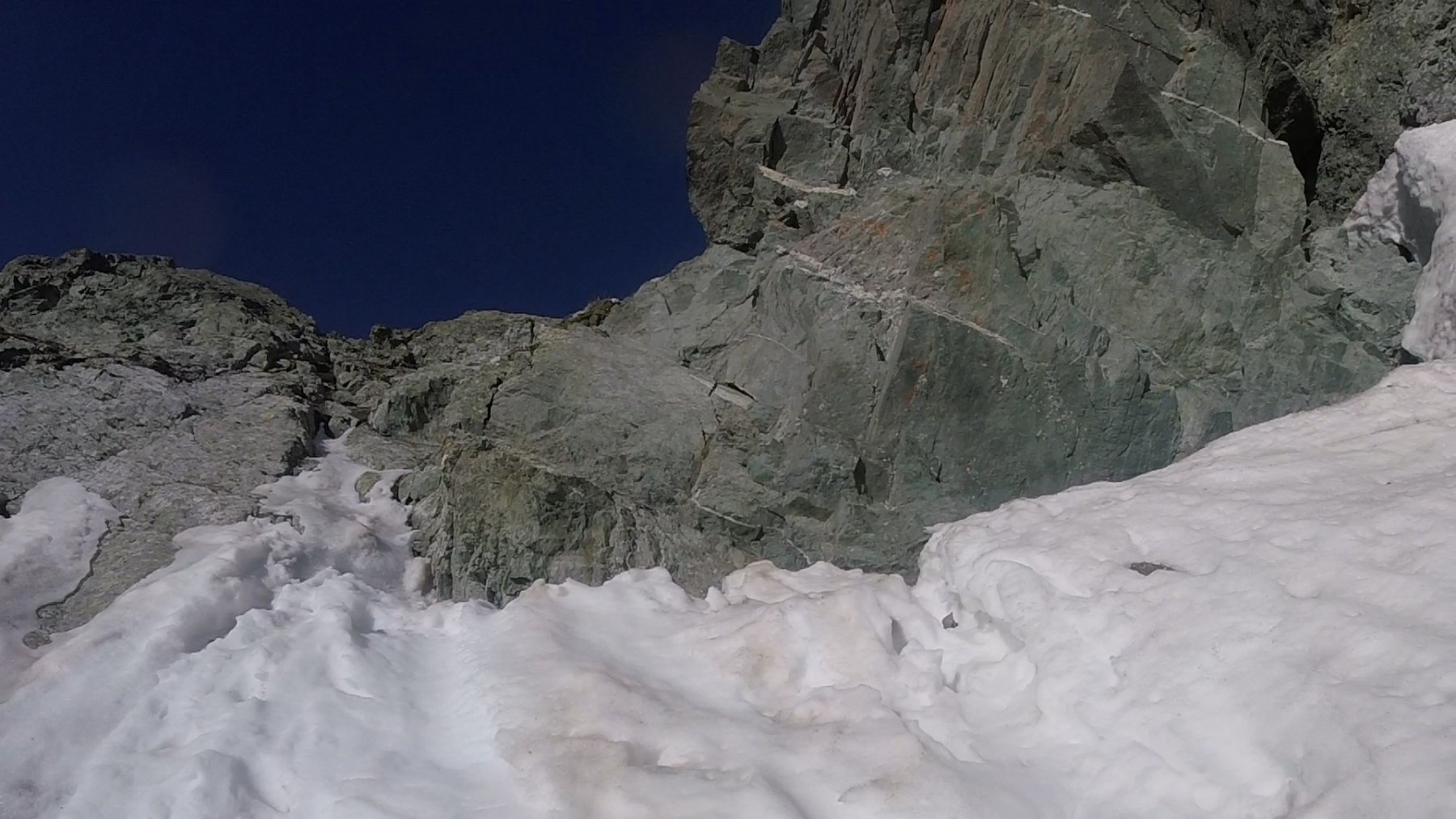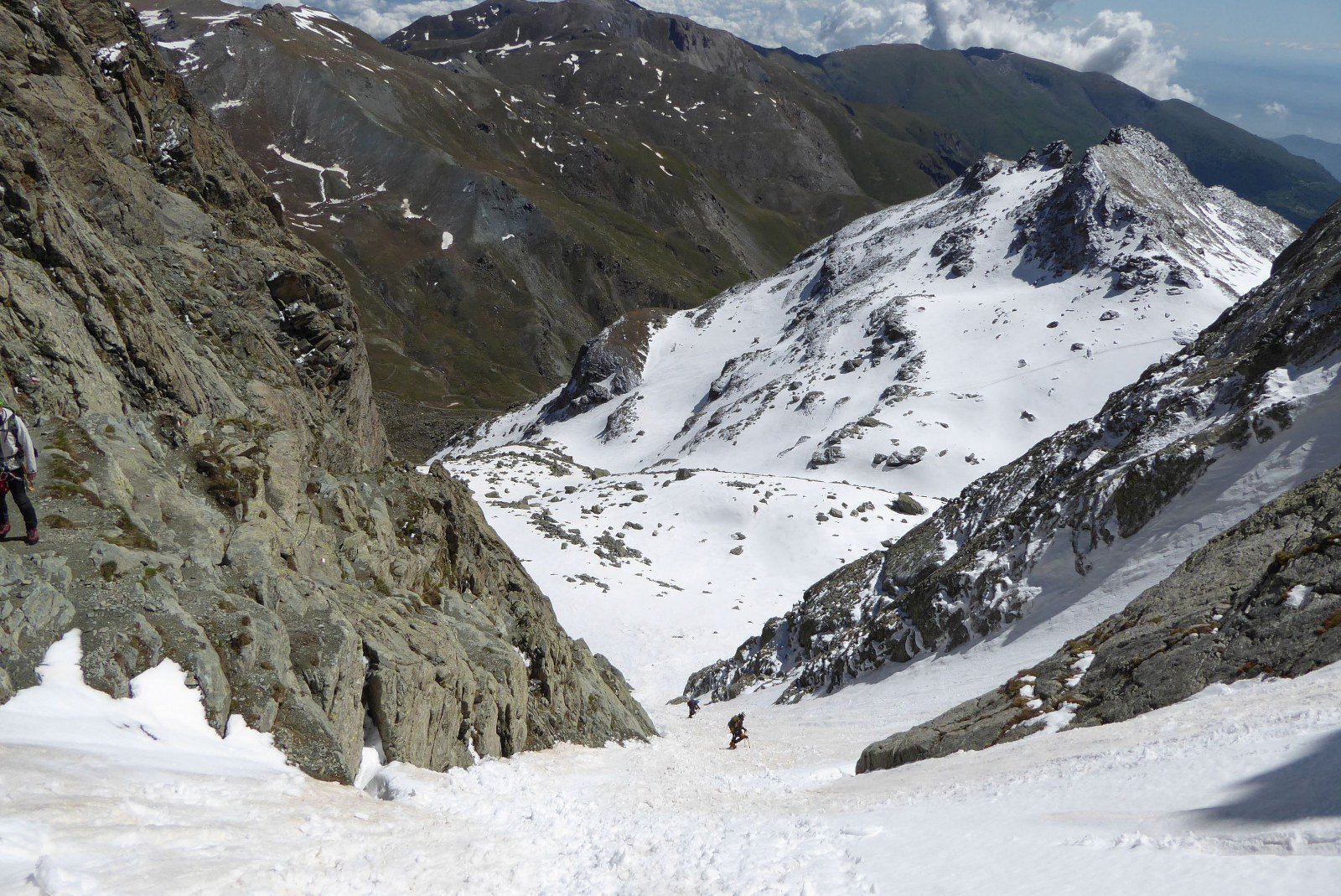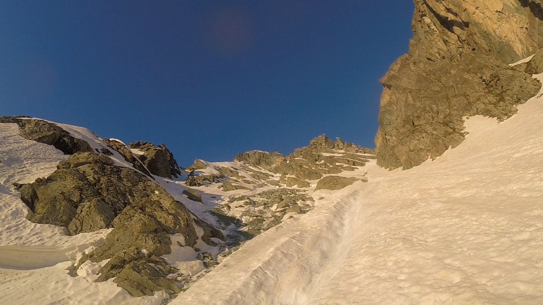 Possibile variante: proseguire a destra nel canale principale (40° – 45° con uscita possibile su cengette sulla dx) ed arrivare al colle del Couloir Bianco. Di qui possibile via di fuga sul versante francese su pendio di detriti/neve, per poi andare a risalire al passo del Porco. Dal colle si inizia la cresta, che risulta molto più lunga ed impegnativa (max 3°+) rispetto all’uscita dal canale di sin, ma anche molto divertente e su roccia ottima. Una doppia da 15-20 mt un po’ scomoda da un torrione dopo pochi minuti, probabilmente evitabile.