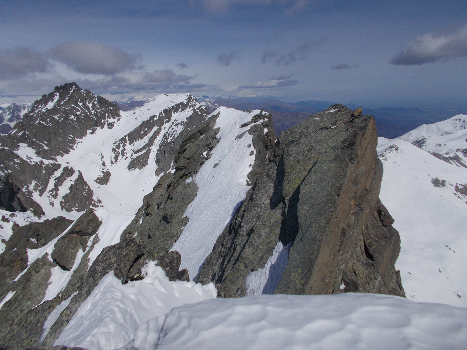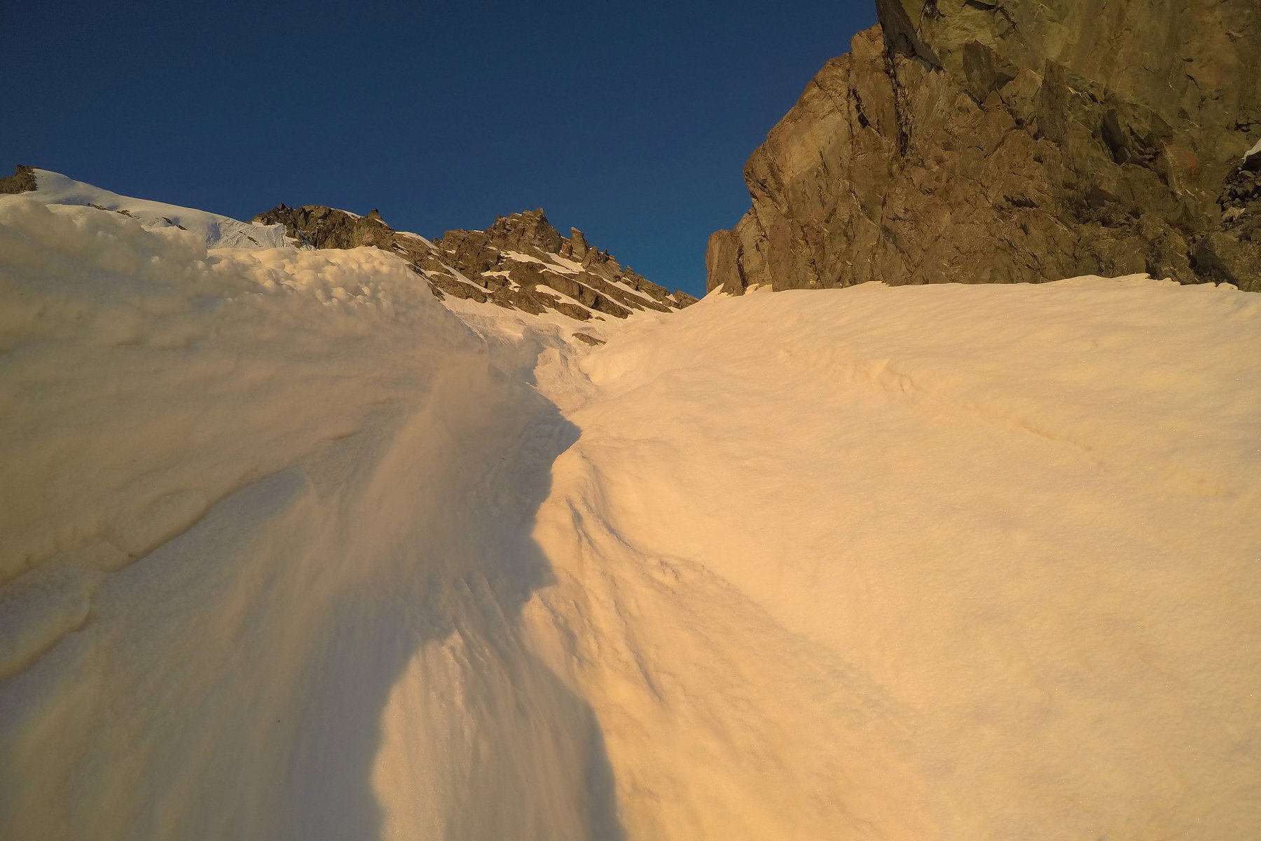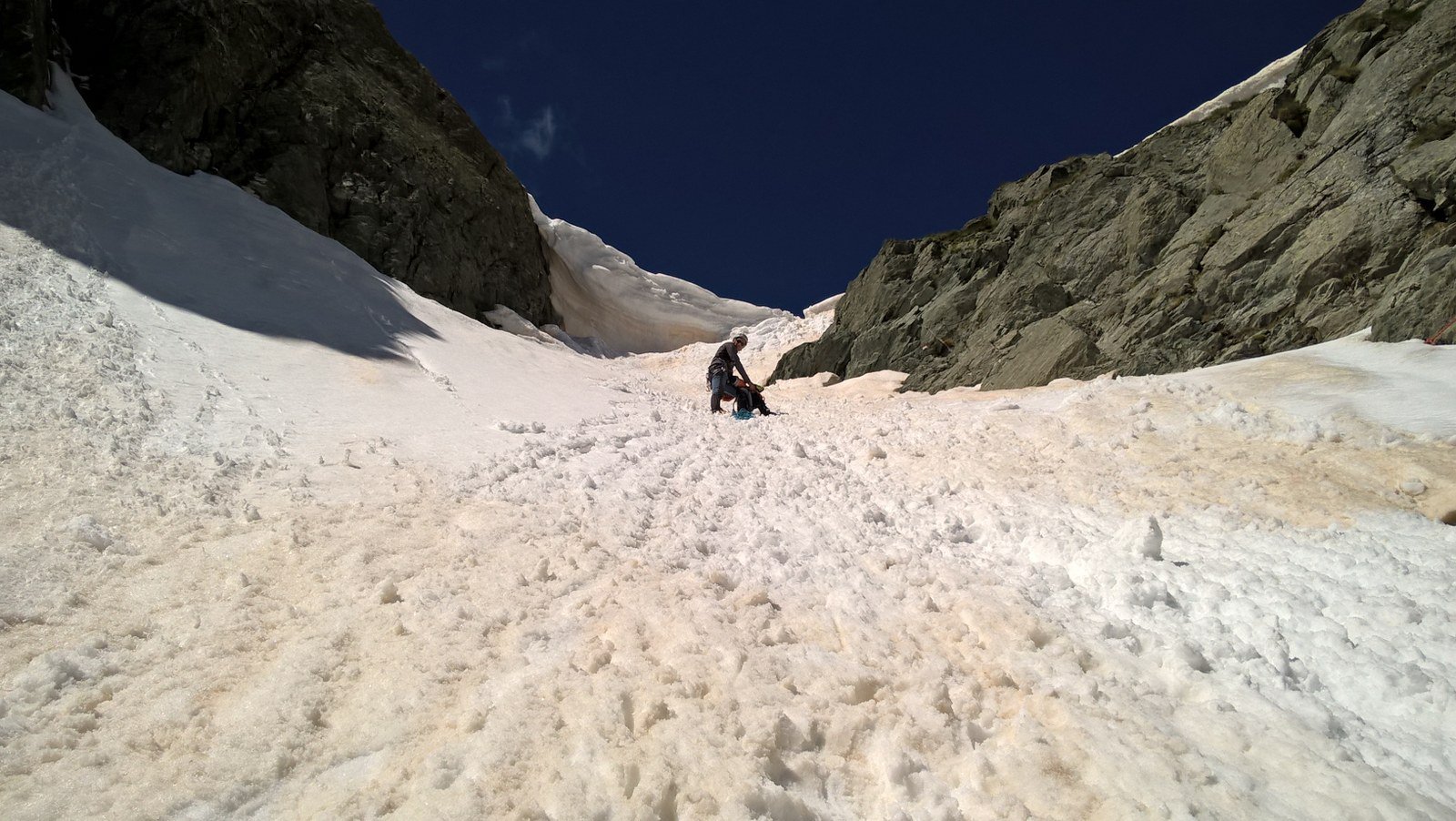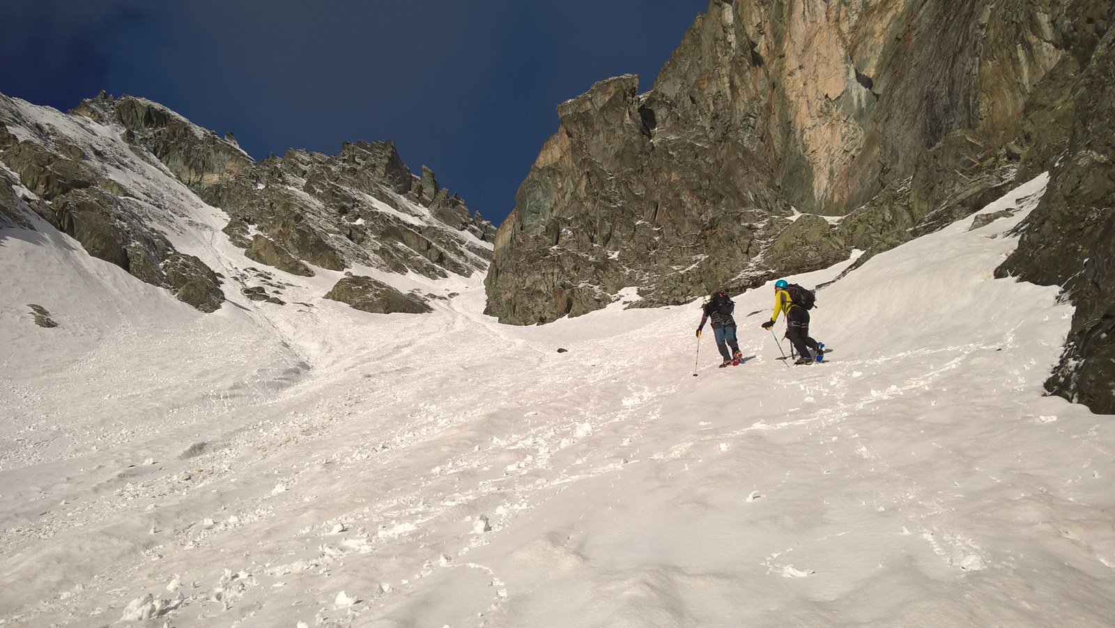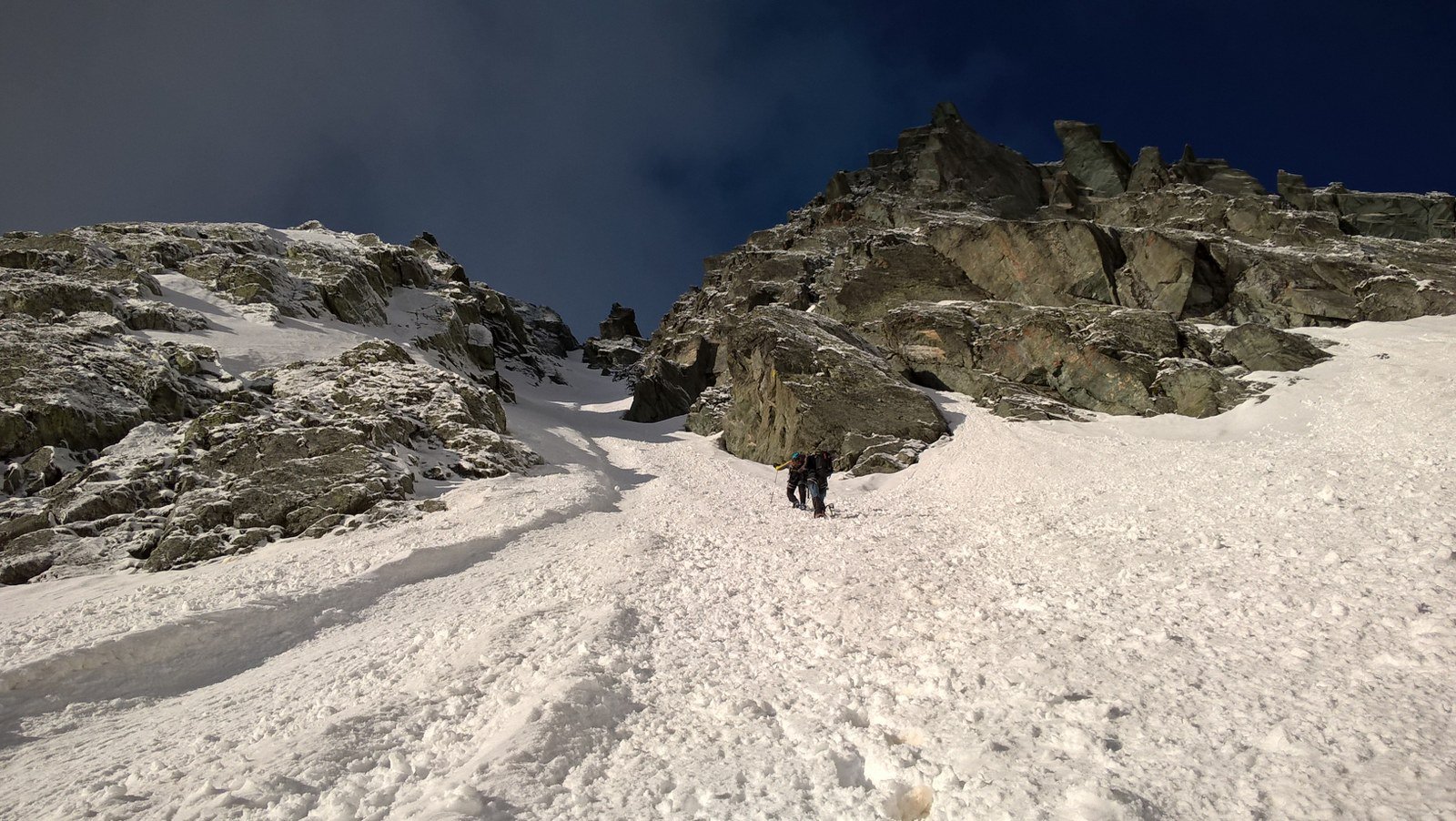 Possibile variante: proseguire a destra nel canale principale (40° – 45° con uscita possibile su cengette sulla dx) ed arrivare al colle del Couloir Bianco. Di qui possibile via di fuga sul versante francese su pendio di detriti/neve, per poi andare a risalire al passo del Porco. Dal colle si inizia la cresta, che risulta molto più lunga ed impegnativa (max 3°+) rispetto all’uscita dal canale di sin, ma anche molto divertente e su roccia ottima. Una doppia da 15-20 mt un po’ scomoda da un torrione dopo pochi minuti, probabilmente evitabile.
