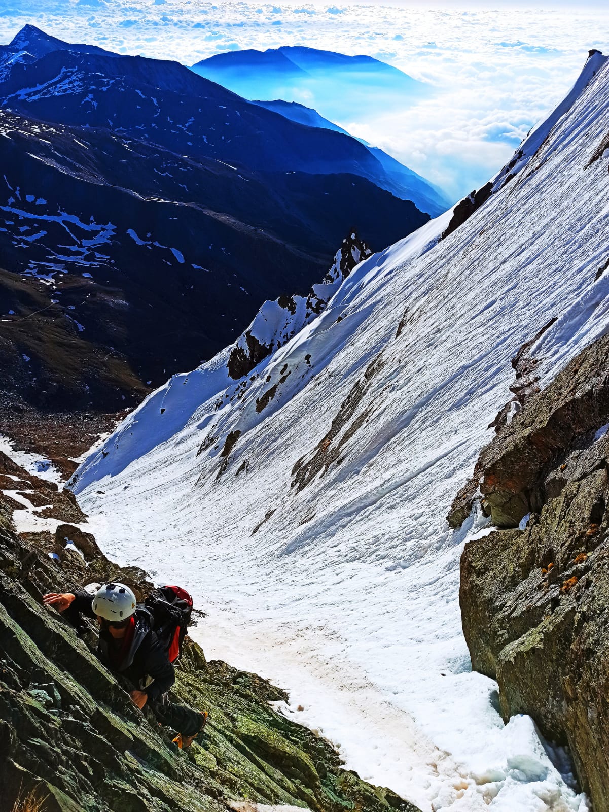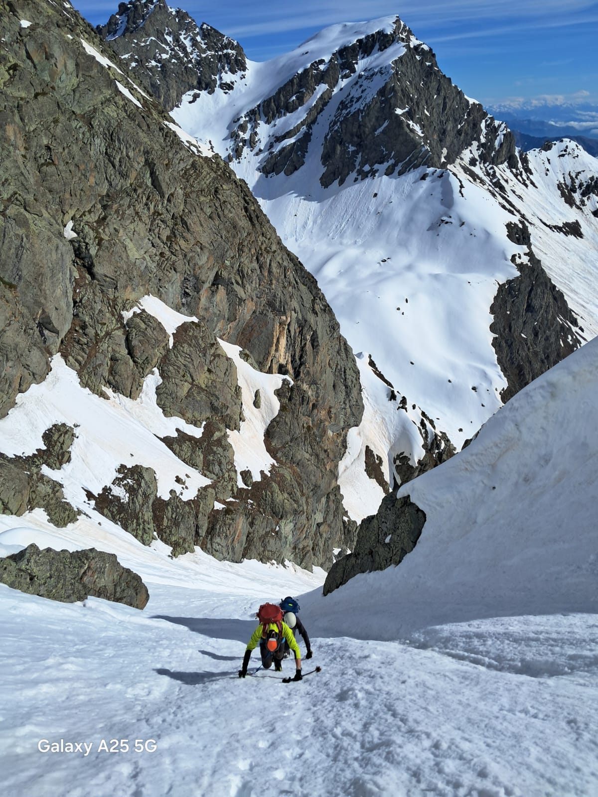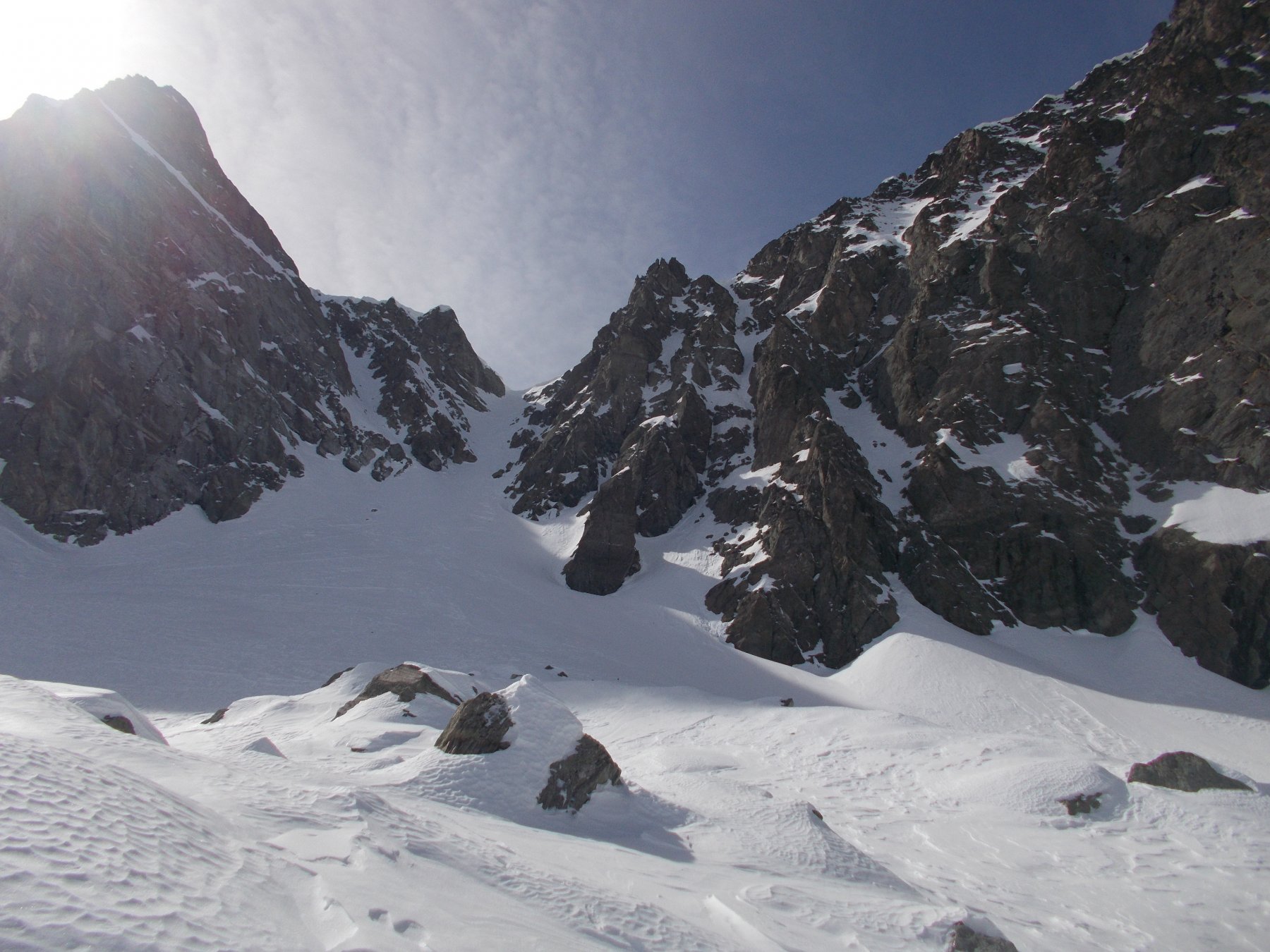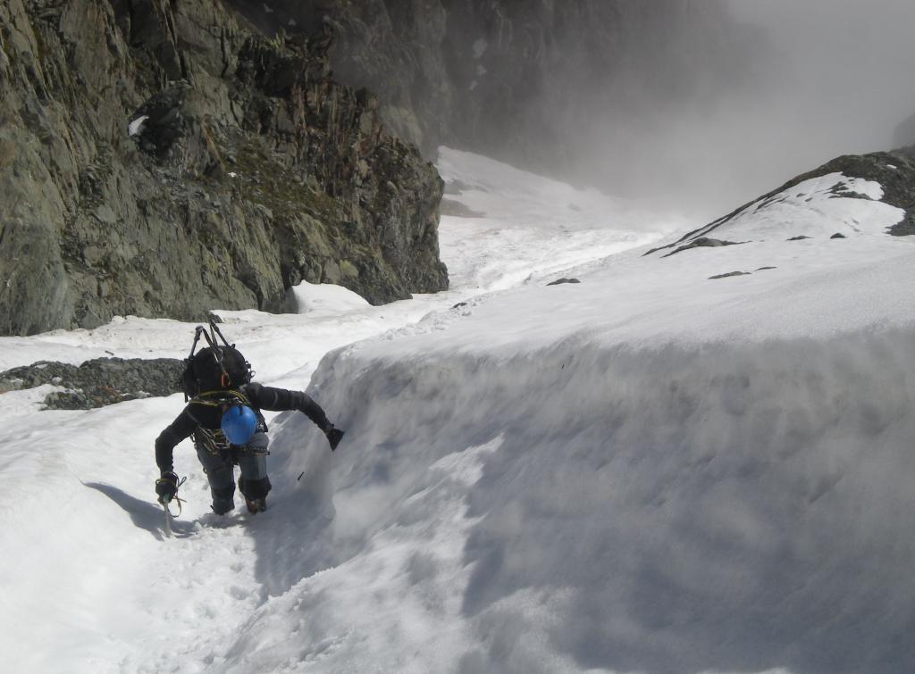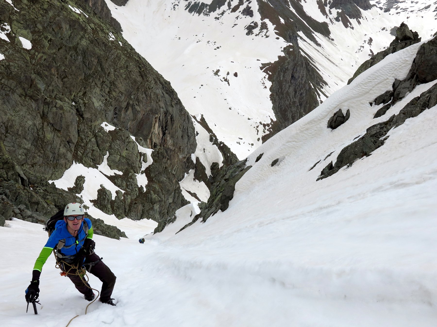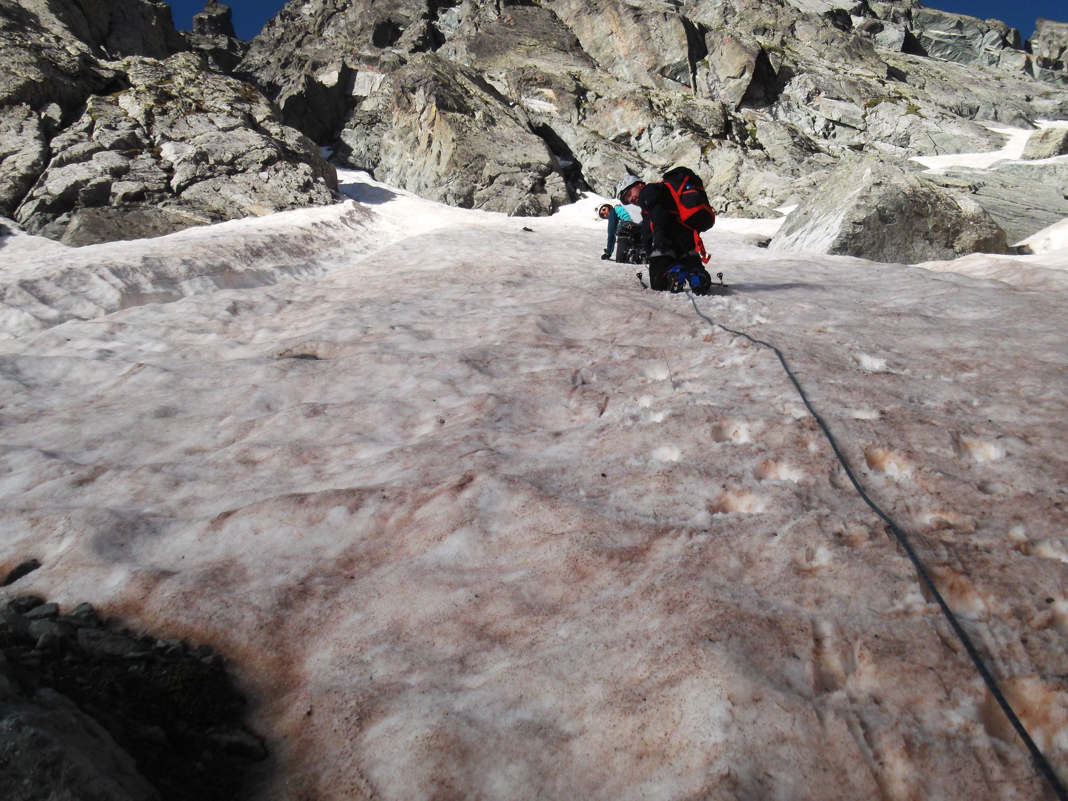 Possibile variante: proseguire a destra nel canale principale (40° – 45° con uscita possibile su cengette sulla dx) ed arrivare al colle del Couloir Bianco. Di qui possibile via di fuga sul versante francese su pendio di detriti/neve, per poi andare a risalire al passo del Porco. Dal colle si inizia la cresta, che risulta molto più lunga ed impegnativa (max 3°+) rispetto all’uscita dal canale di sin, ma anche molto divertente e su roccia ottima. Una doppia da 15-20 mt un po’ scomoda da un torrione dopo pochi minuti, probabilmente evitabile.