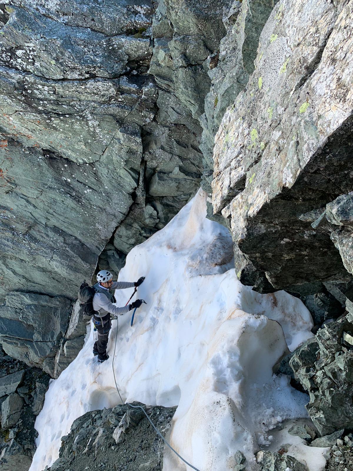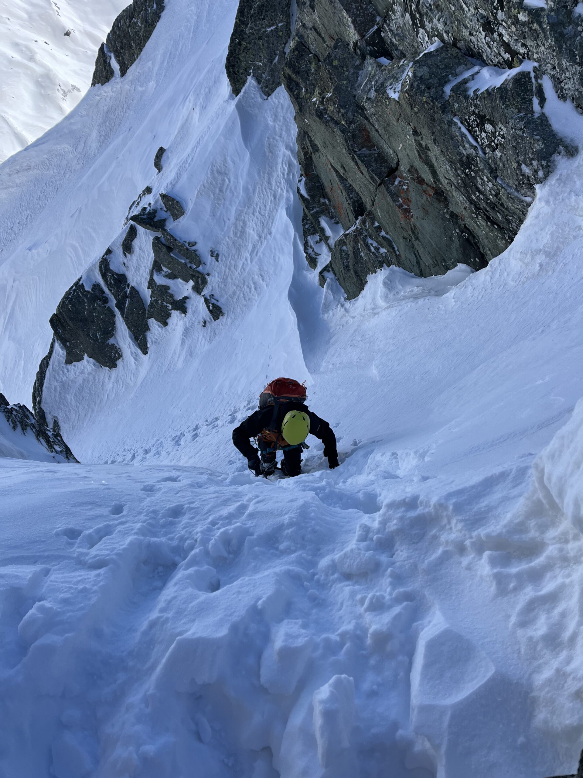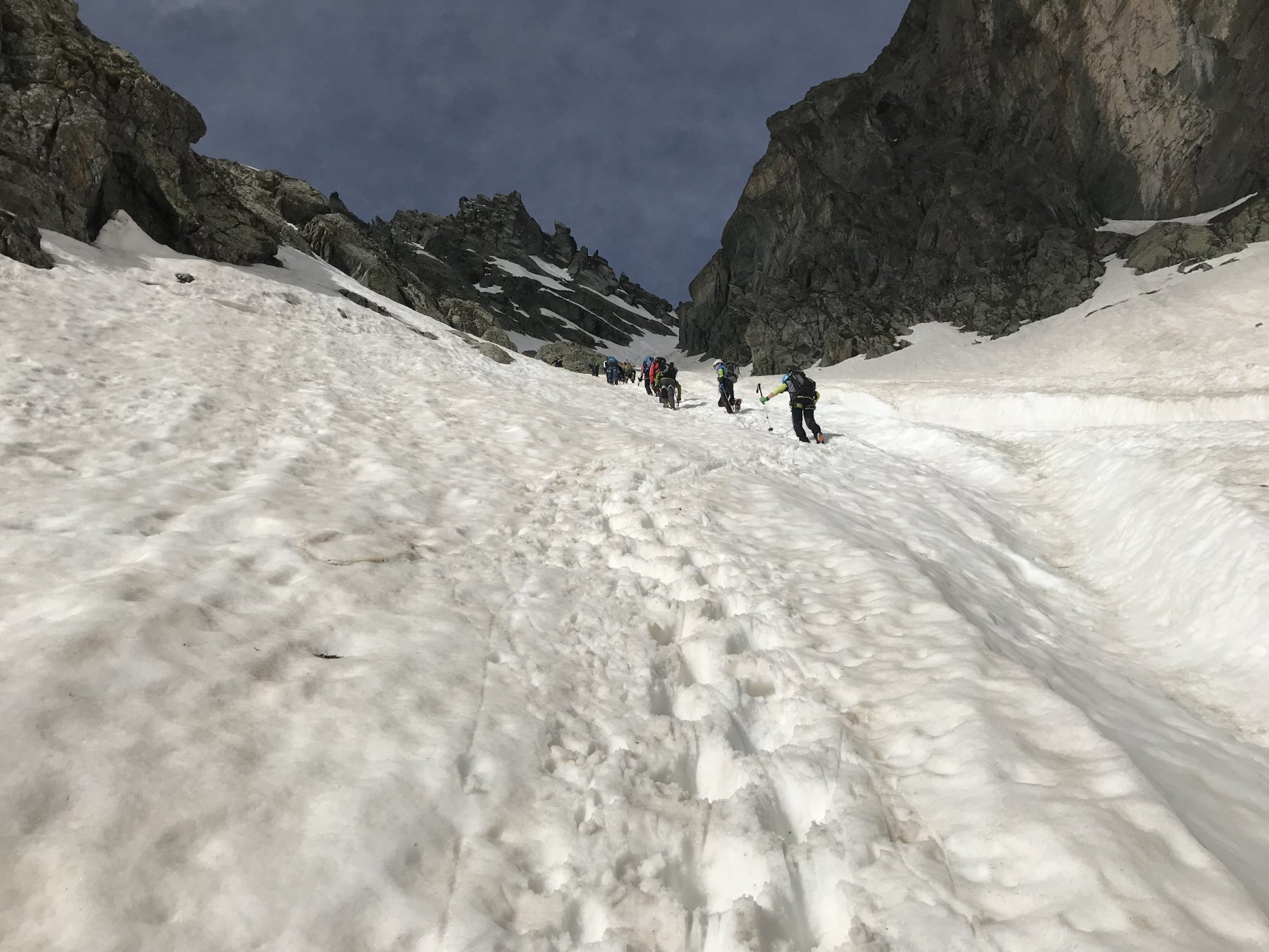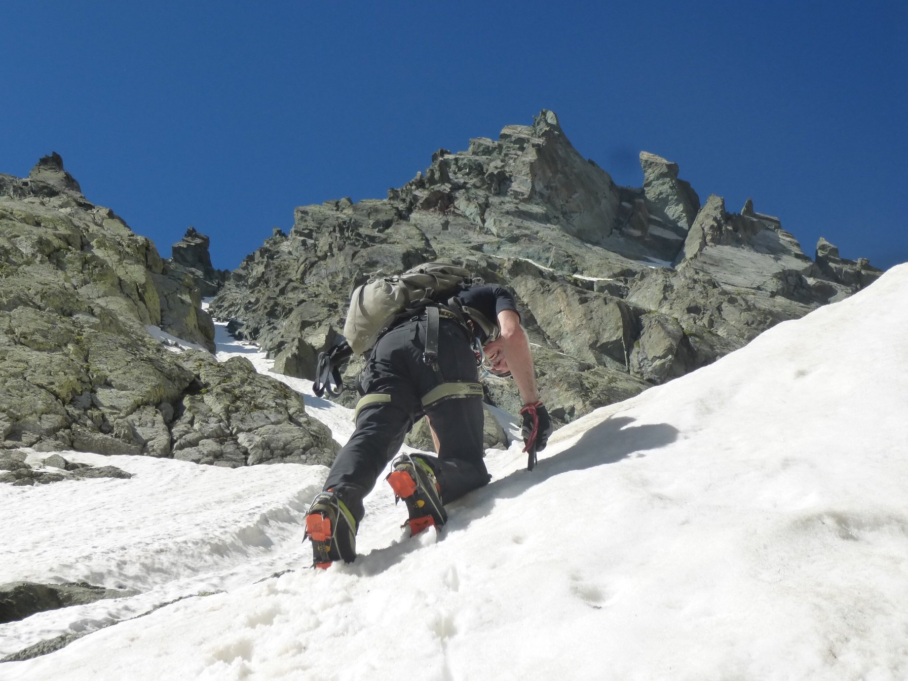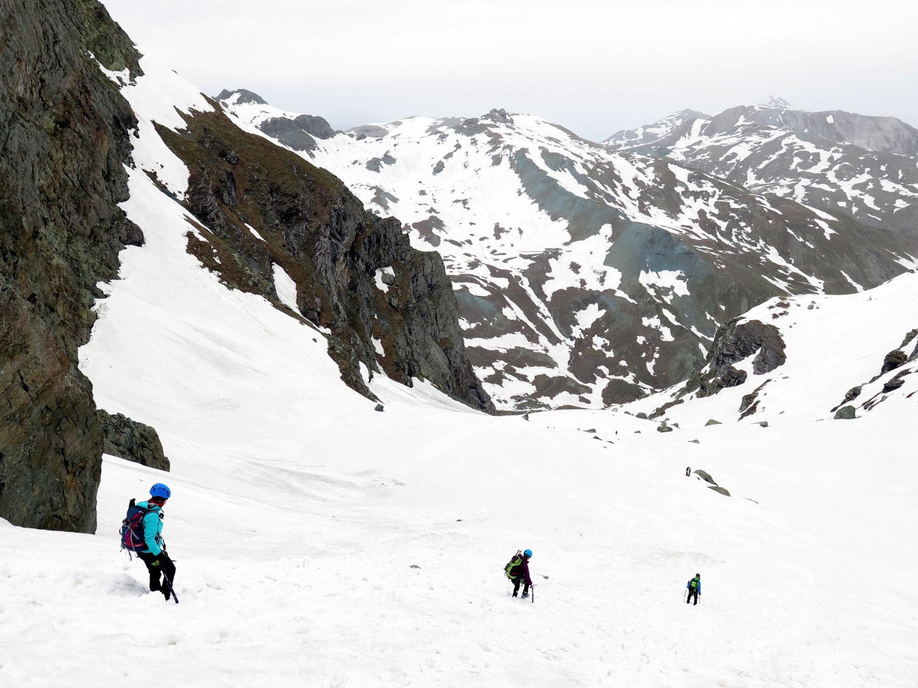 Possibile variante: proseguire a destra nel canale principale (40° – 45° con uscita possibile su cengette sulla dx) ed arrivare al colle del Couloir Bianco. Di qui possibile via di fuga sul versante francese su pendio di detriti/neve, per poi andare a risalire al passo del Porco. Dal colle si inizia la cresta, che risulta molto più lunga ed impegnativa (max 3°+) rispetto all’uscita dal canale di sin, ma anche molto divertente e su roccia ottima. Una doppia da 15-20 mt un po’ scomoda da un torrione dopo pochi minuti, probabilmente evitabile.