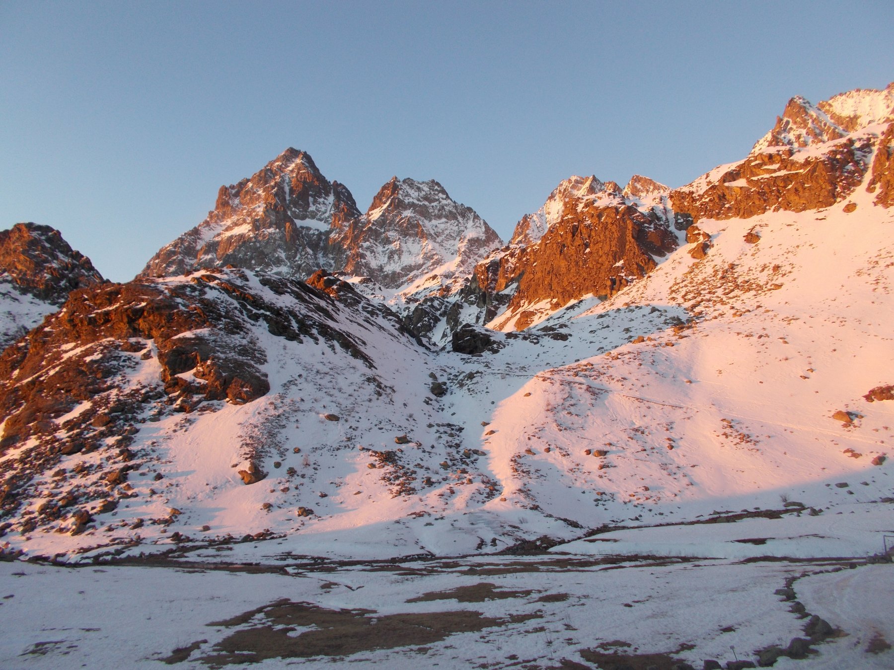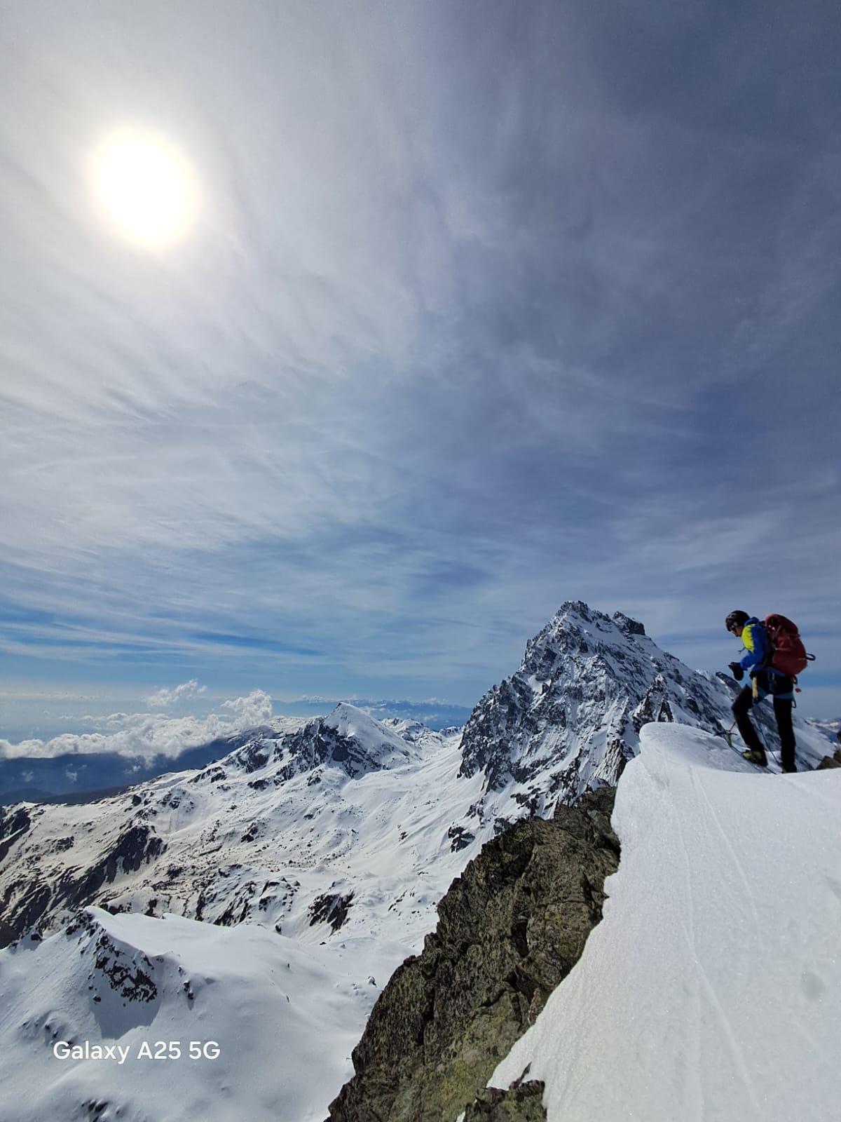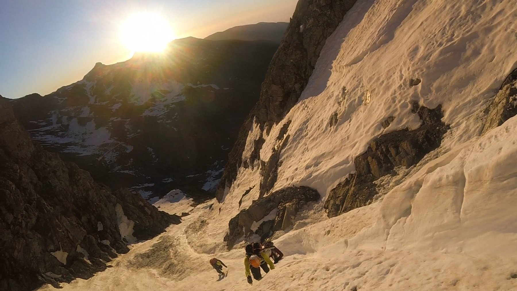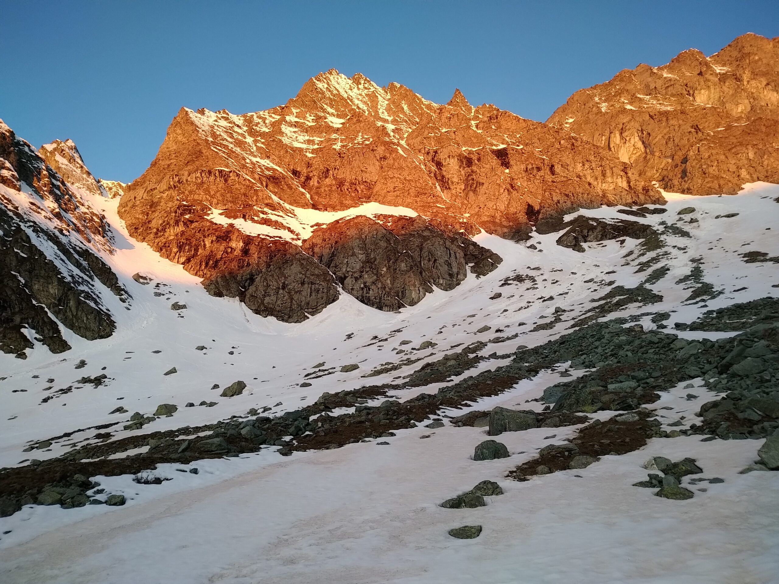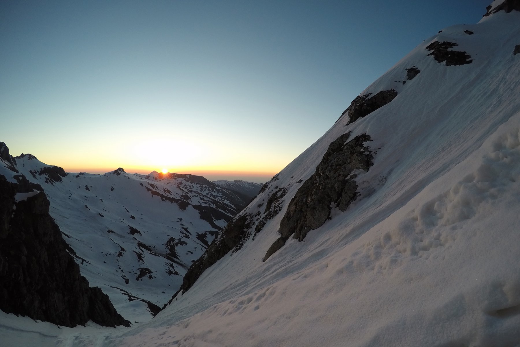 Possibile variante: proseguire a destra nel canale principale (40° – 45° con uscita possibile su cengette sulla dx) ed arrivare al colle del Couloir Bianco. Di qui possibile via di fuga sul versante francese su pendio di detriti/neve, per poi andare a risalire al passo del Porco. Dal colle si inizia la cresta, che risulta molto più lunga ed impegnativa (max 3°+) rispetto all’uscita dal canale di sin, ma anche molto divertente e su roccia ottima. Una doppia da 15-20 mt un po’ scomoda da un torrione dopo pochi minuti, probabilmente evitabile.