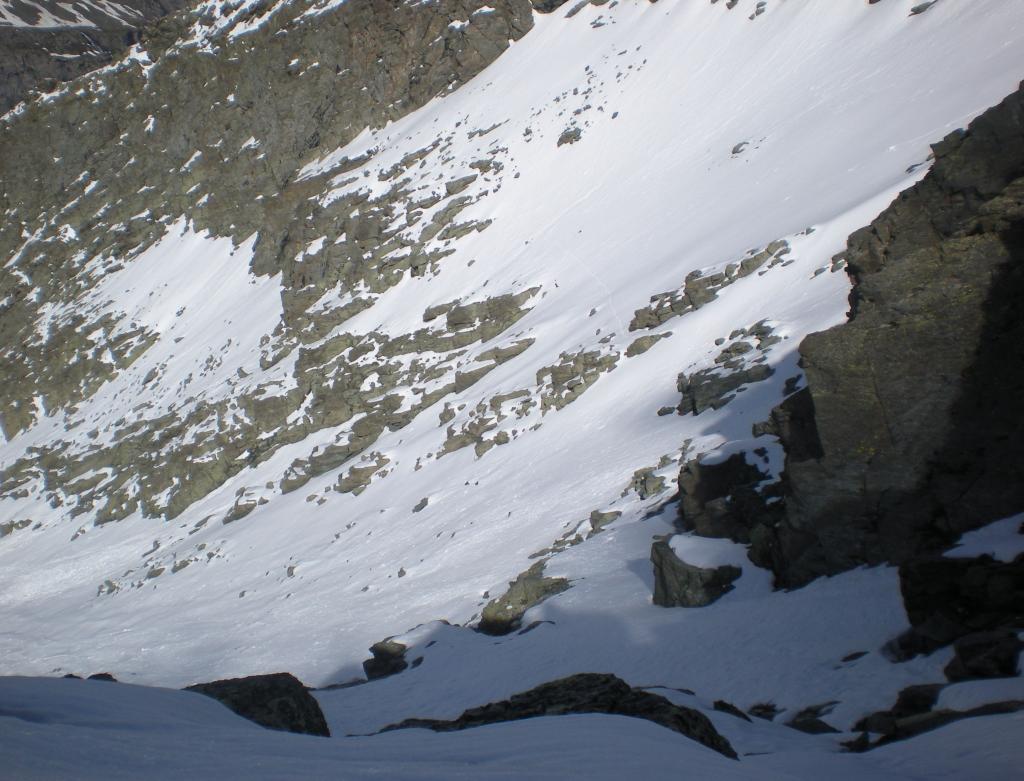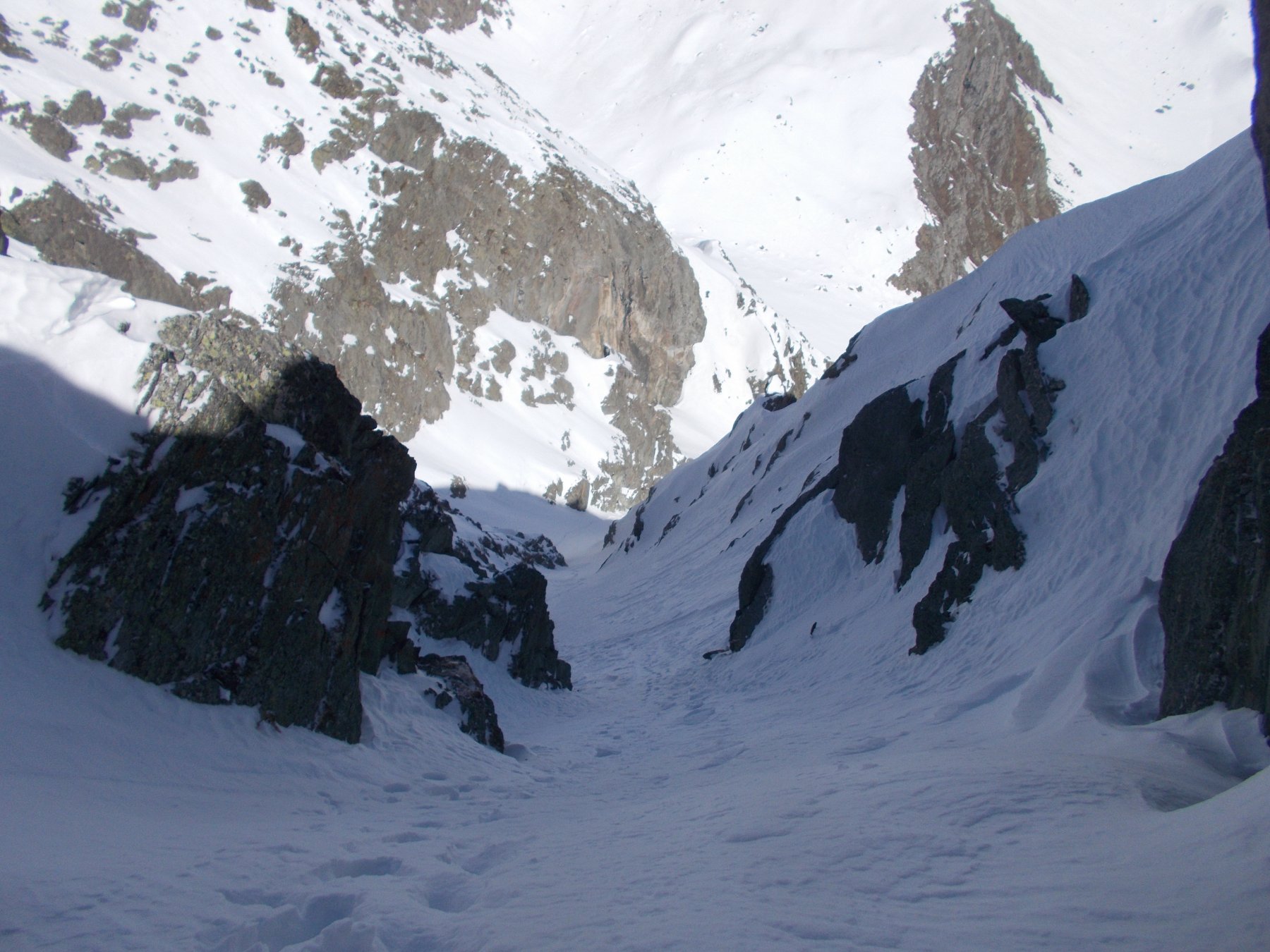 Da qui si vede, in direzione sud ovest, il colle del Couloir Bianco; si prosegue (40°) fino a dove sulla sinistra (quota 2825 circa) si stacca il canale Nord più ripido, più stretto e incassato, con un evidente torrione al suo termine.