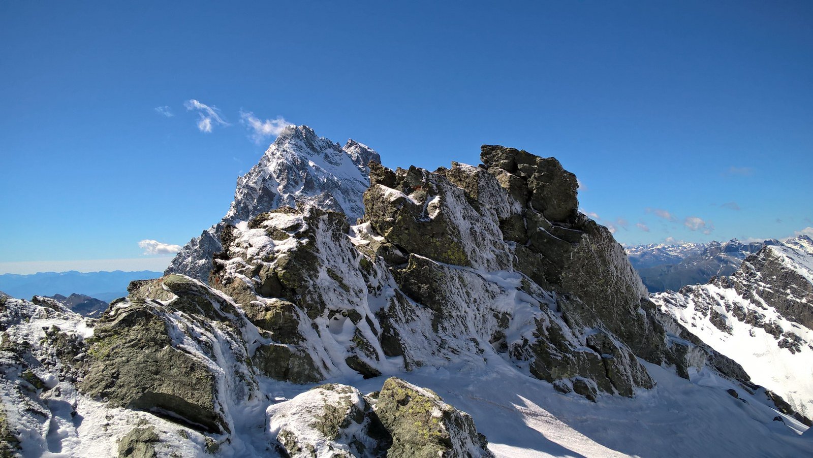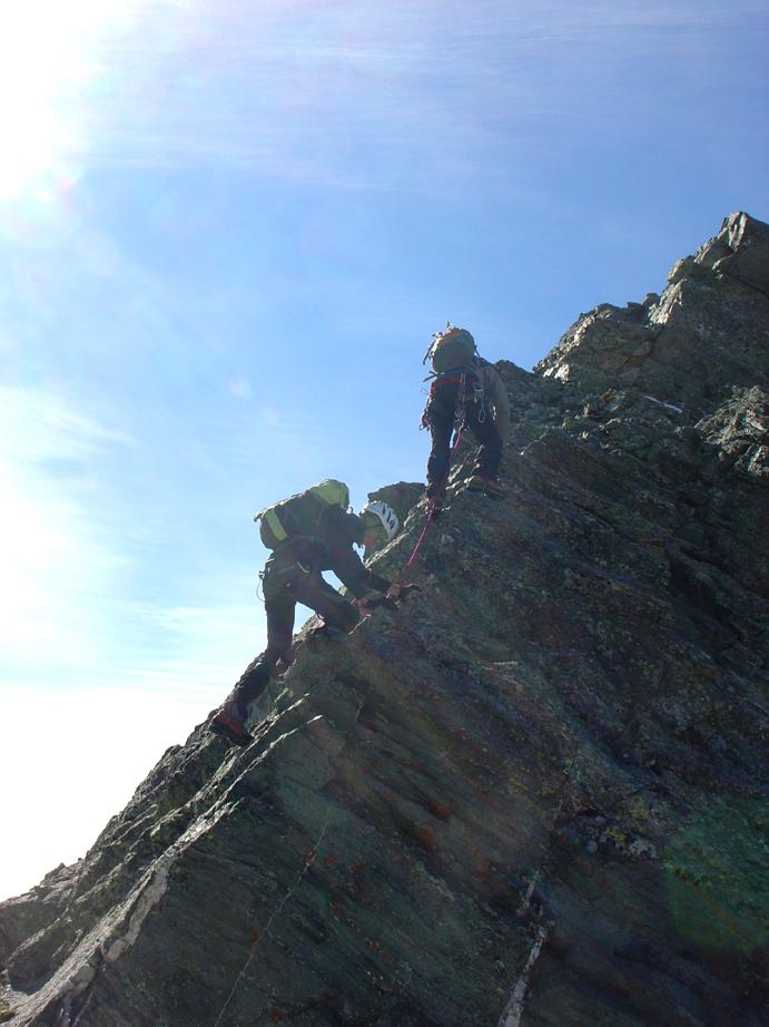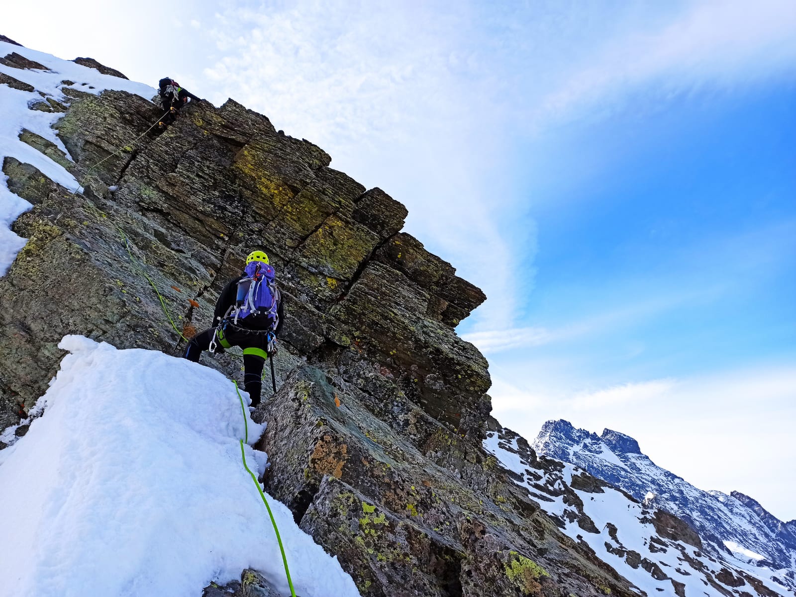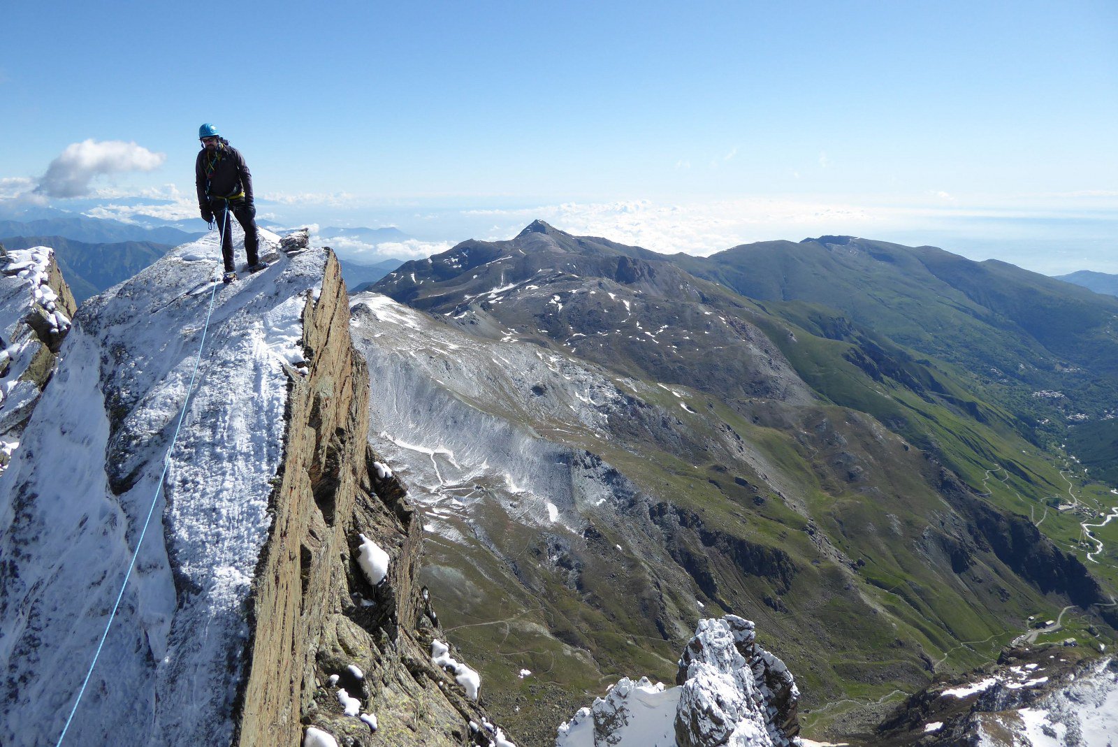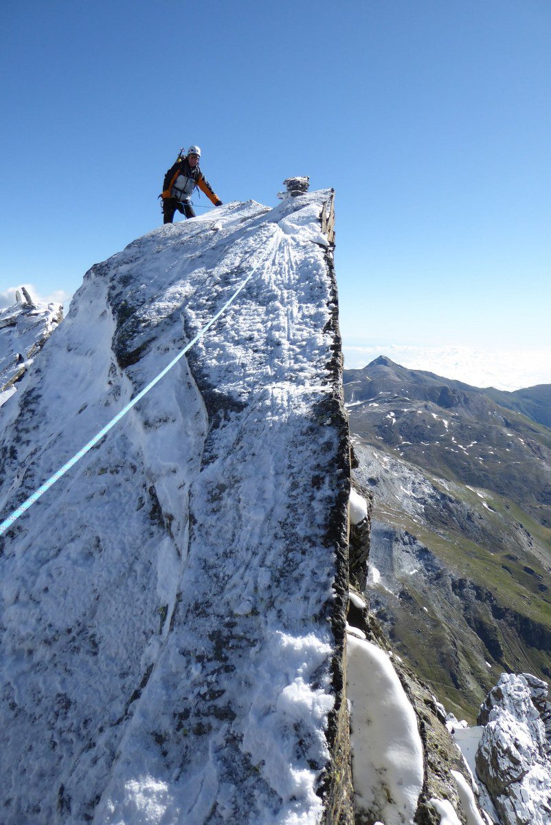 Tutta la cresta è protetta da spit nei punti più impegnativi ed esposti per essere percorsa in conserva lunga. Gli spit sono posizionati lungo il filo. Il primo tratto di cresta conviene comunque aggirarlo sul lato francese per evitare di salire e un torrione che poi va disceso per un’areo spigolo, soprattutto se la roccia è ancora innevata. Raggiunto il collettino oltre questo torrione, si prosegue sul filo su rocce articolate e spigoli rocciosi (II°+) raggiungendo l’anticima parallela alla vetta; con breve tratto in leggera discesa su una cornice rocciosa decisamente esposta, superato un ultimo muretto, si raggiunge la vetta.