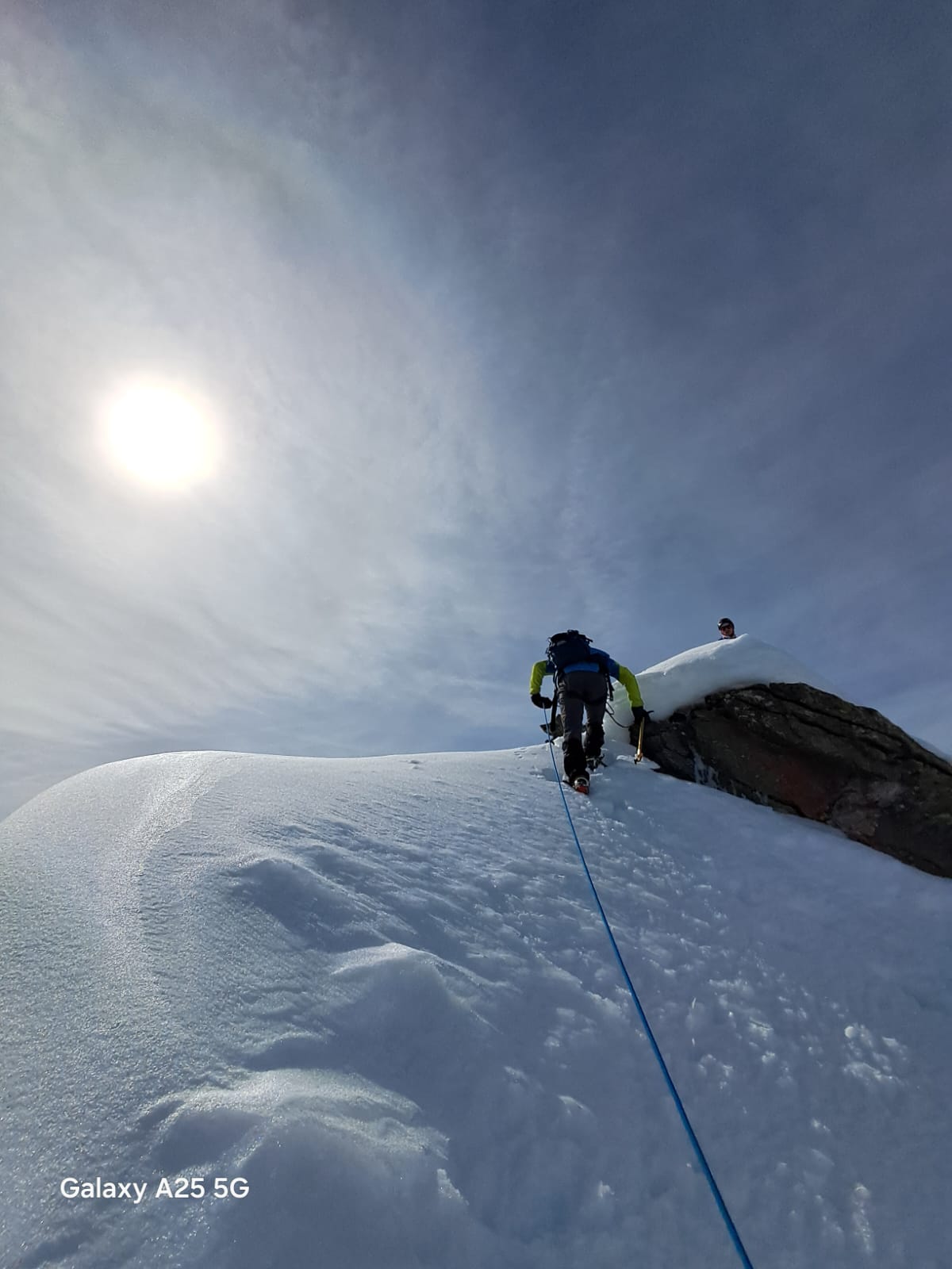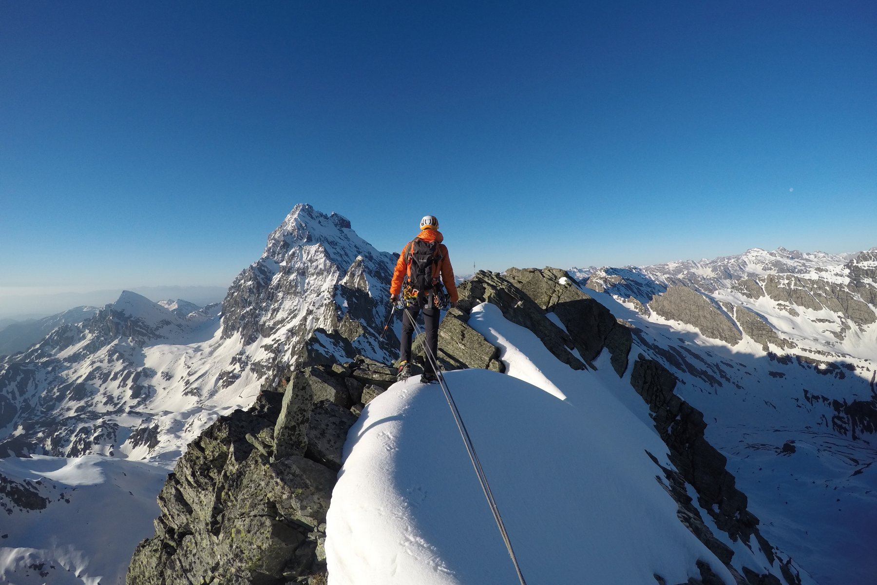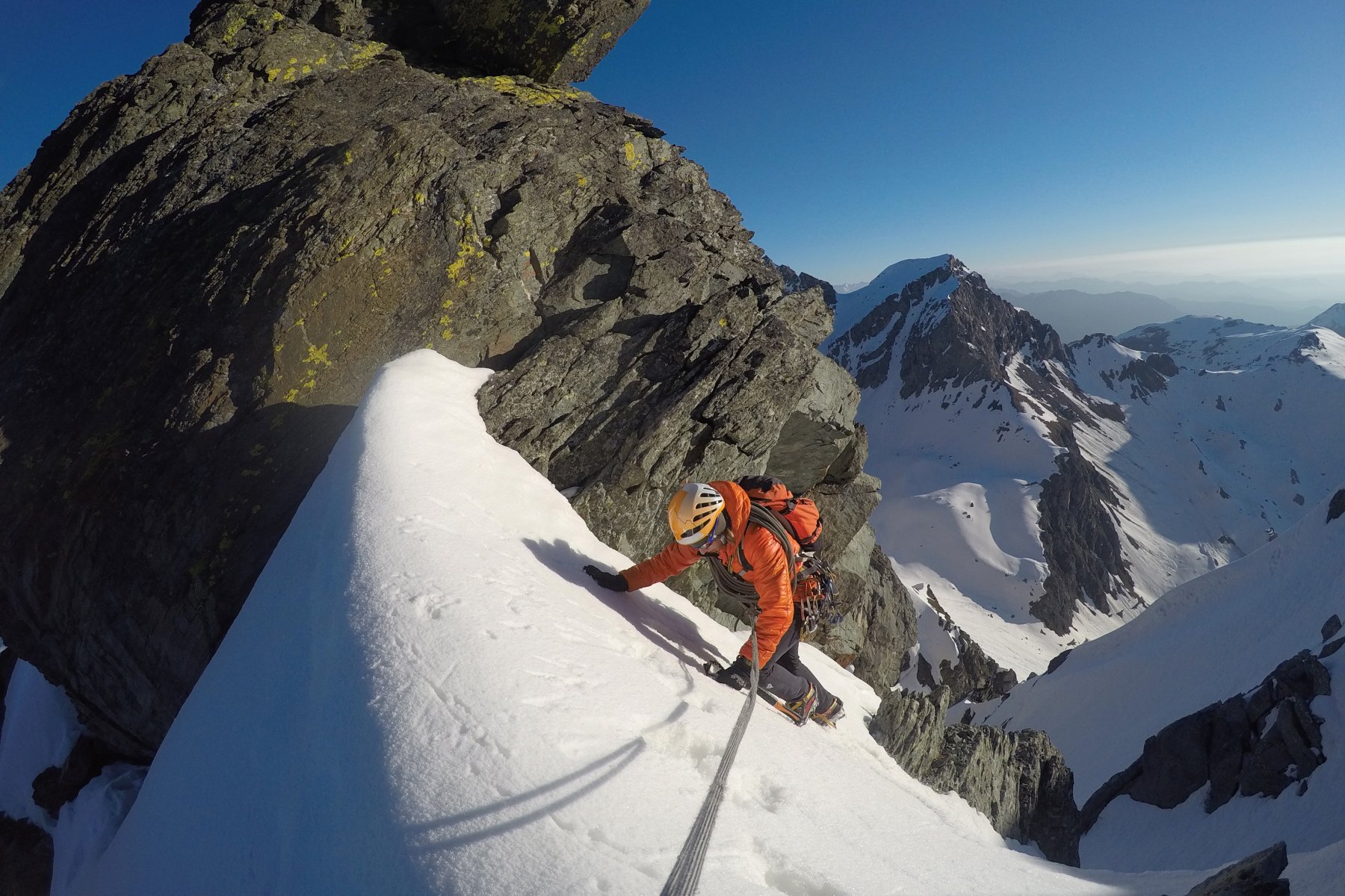 Tutta la cresta è protetta da spit nei punti più impegnativi ed esposti per essere percorsa in conserva lunga. Gli spit sono posizionati lungo il filo. Il primo tratto di cresta conviene comunque aggirarlo sul lato francese per evitare di salire e un torrione che poi va disceso per un’areo spigolo, soprattutto se la roccia è ancora innevata. Raggiunto il collettino oltre questo torrione, si prosegue sul filo su rocce articolate e spigoli rocciosi (II°+) raggiungendo l’anticima parallela alla vetta; con breve tratto in leggera discesa su una cornice rocciosa decisamente esposta, superato un ultimo muretto, si raggiunge la vetta.