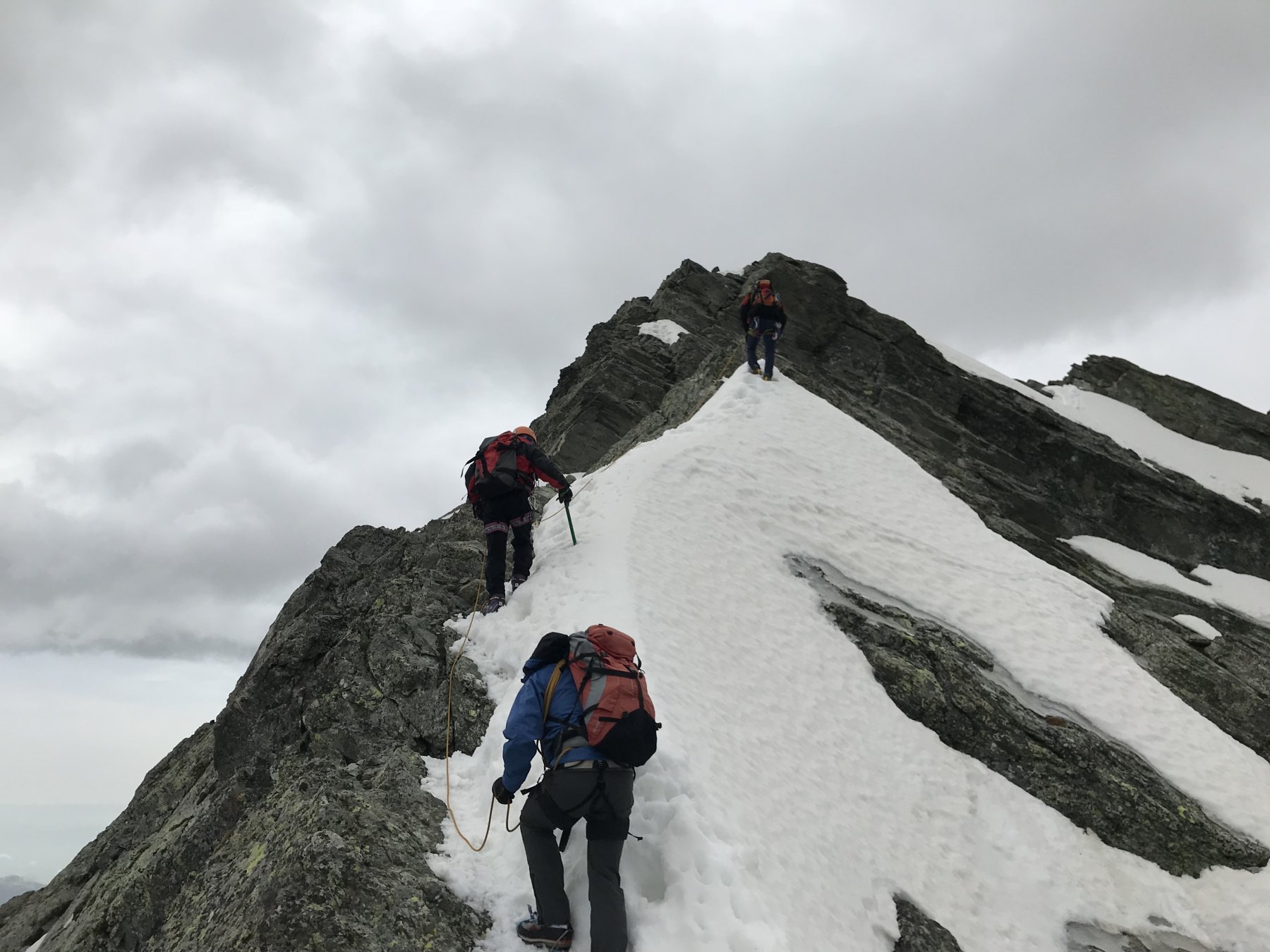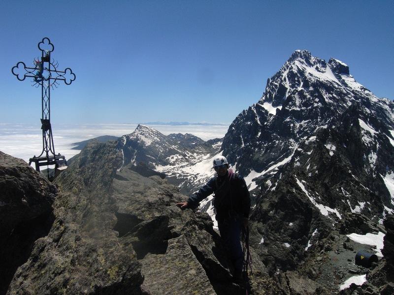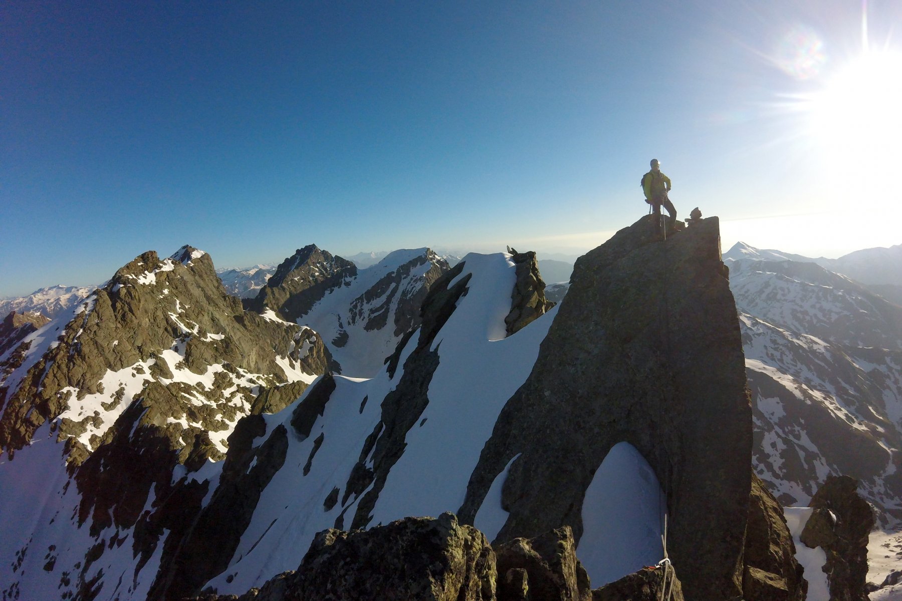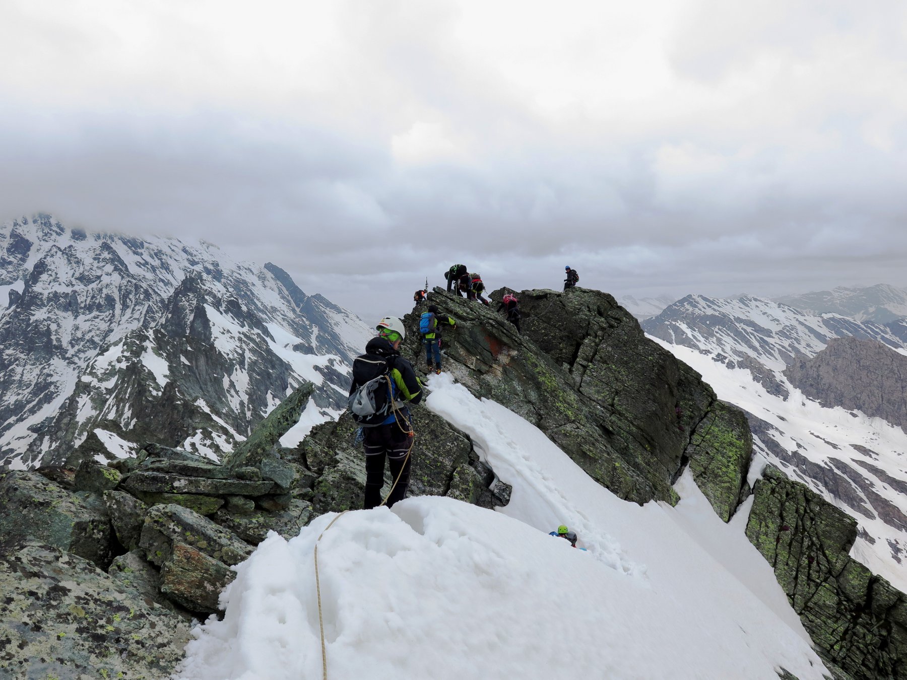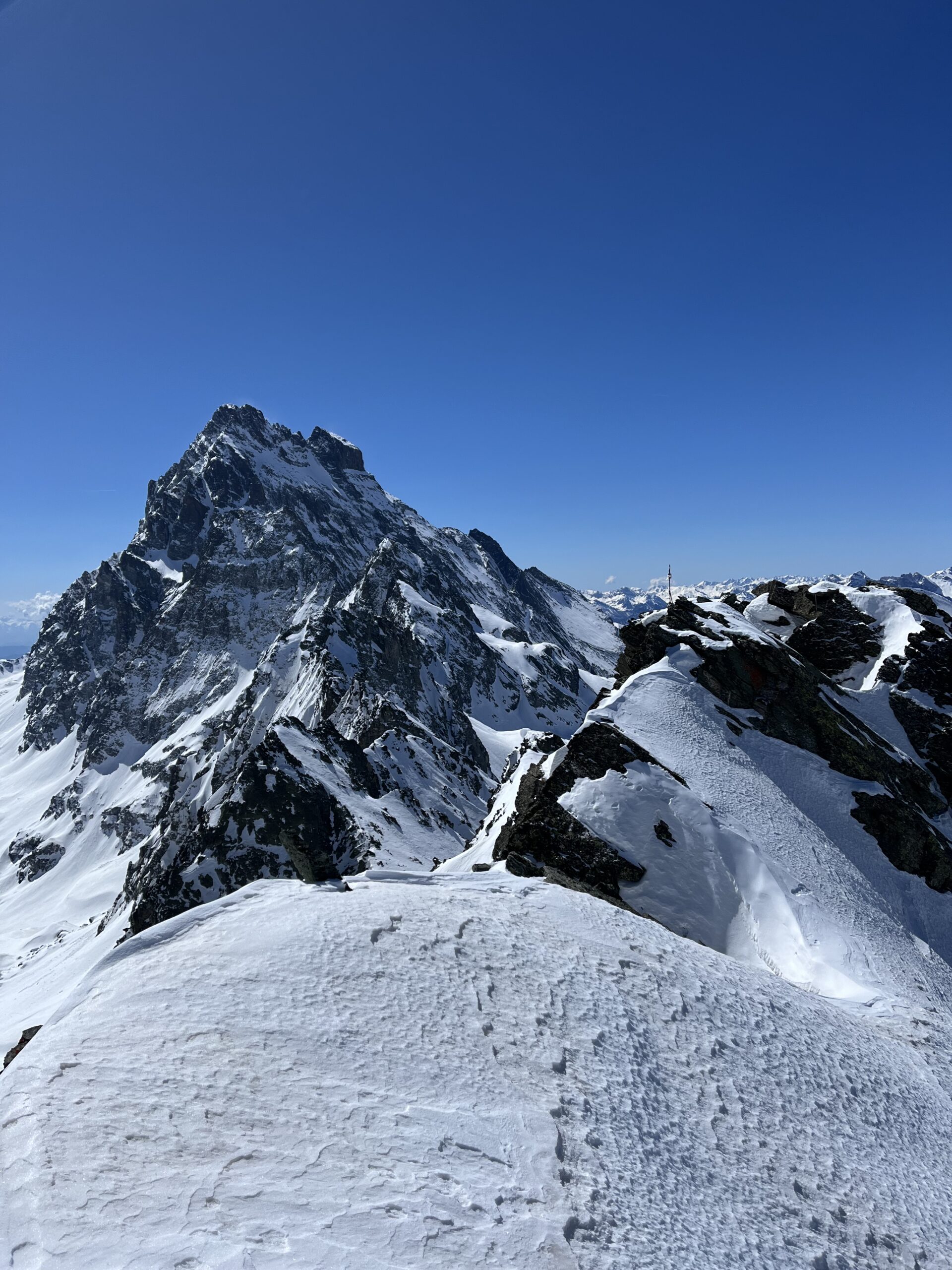 Tutta la cresta è protetta da spit nei punti più impegnativi ed esposti per essere percorsa in conserva lunga. Gli spit sono posizionati lungo il filo. Il primo tratto di cresta conviene comunque aggirarlo sul lato francese per evitare di salire e un torrione che poi va disceso per un’areo spigolo, soprattutto se la roccia è ancora innevata. Raggiunto il collettino oltre questo torrione, si prosegue sul filo su rocce articolate e spigoli rocciosi (II°+) raggiungendo l’anticima parallela alla vetta; con breve tratto in leggera discesa su una cornice rocciosa decisamente esposta, superato un ultimo muretto, si raggiunge la vetta.