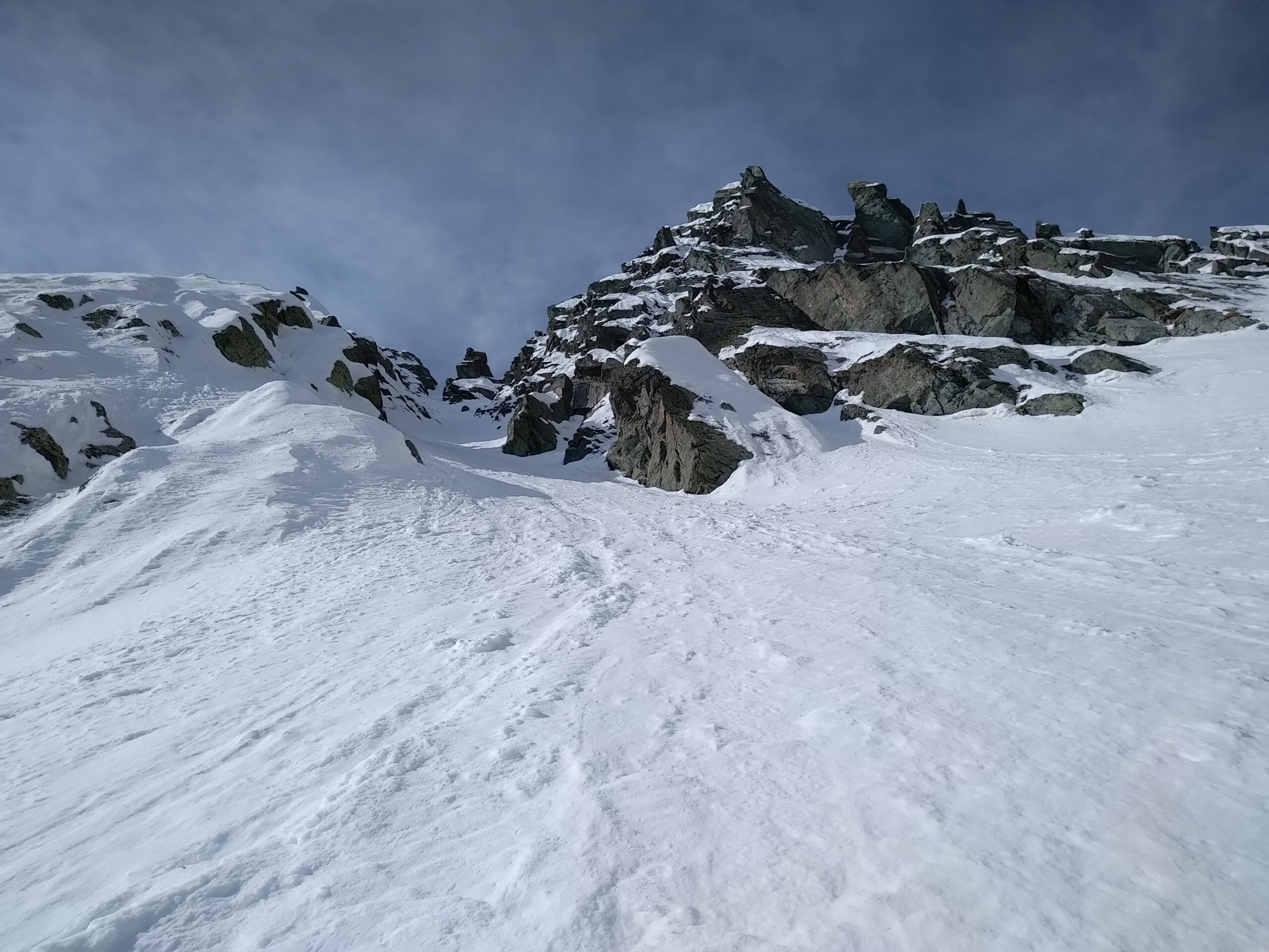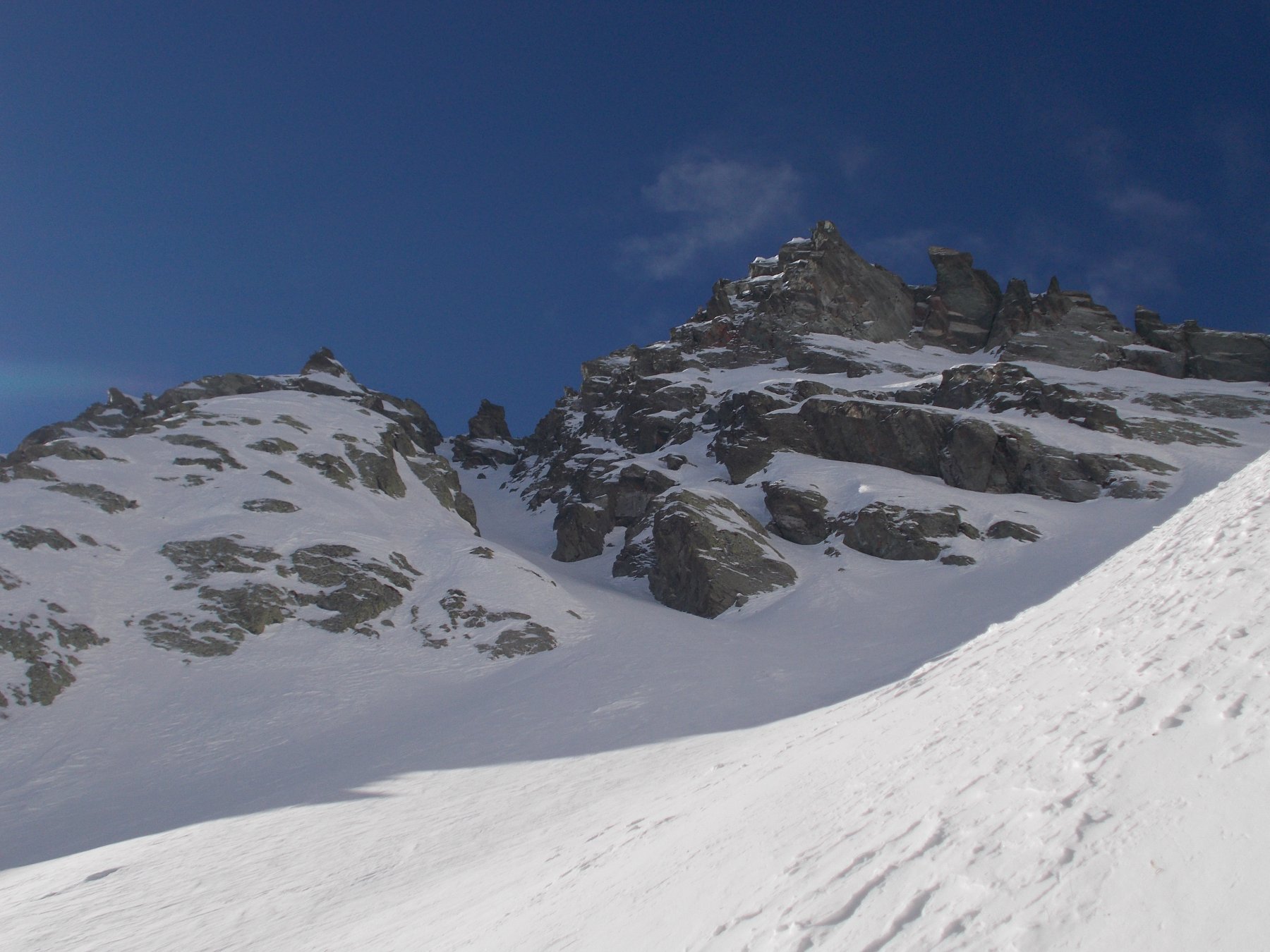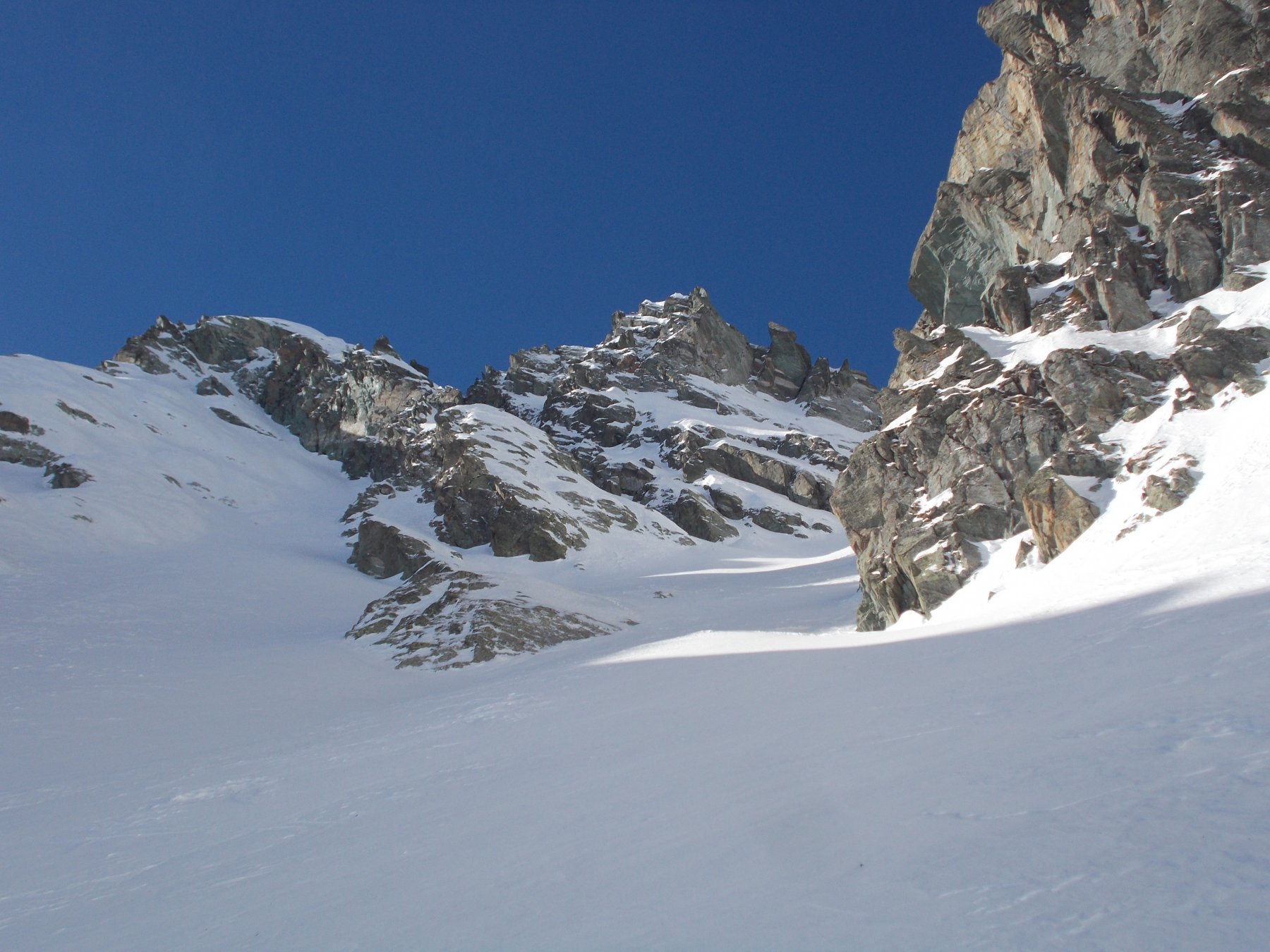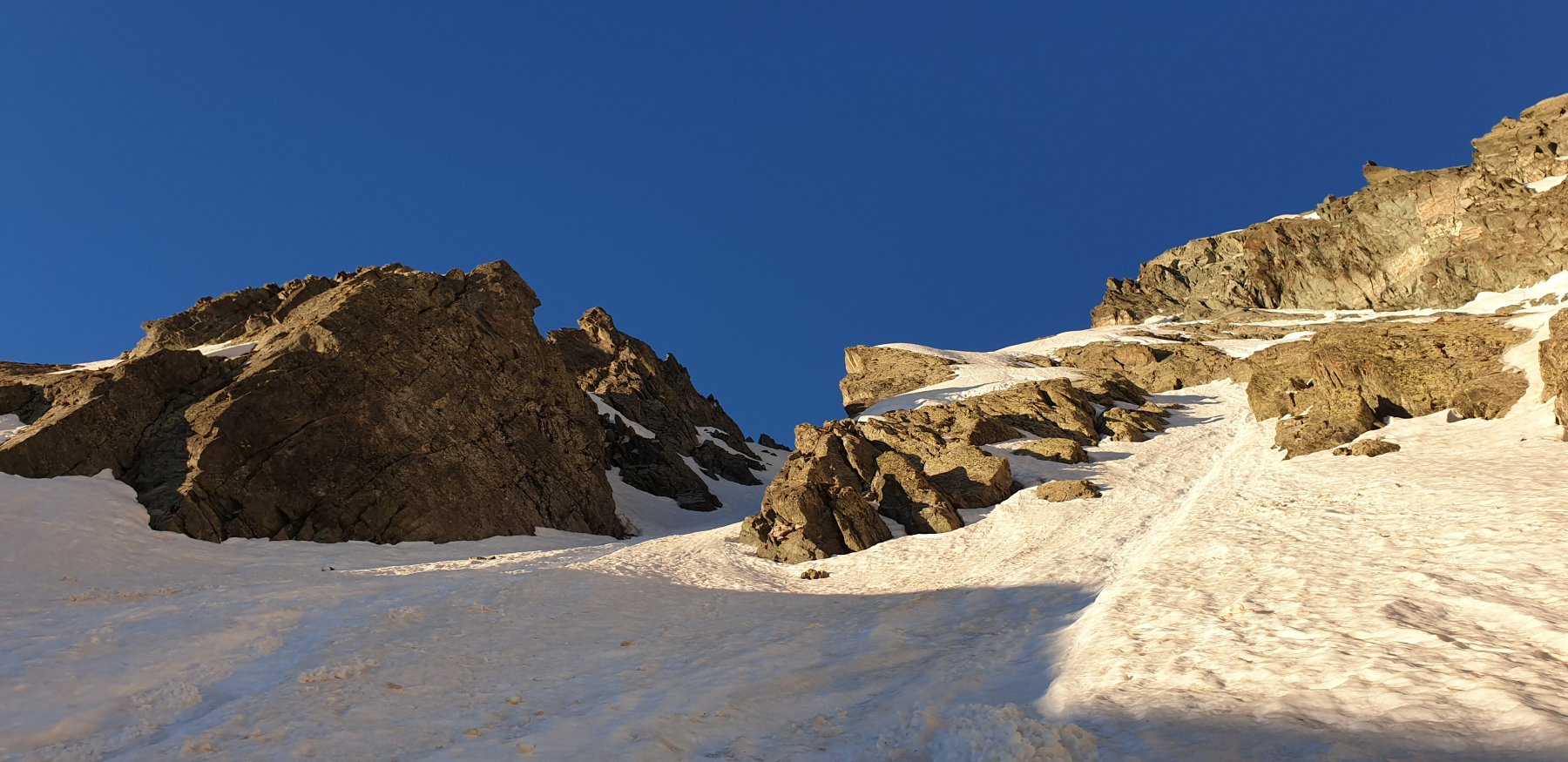Lasciato il percorso del Couloir Bianco sulla destra si risale il canale che si insinua tra gli speroni rocciosi, diventando man mano più stretto e ripido (45° e oltre) giungendo sotto il torrione; qui due possibilità, risalire a sinistra l’ultima parte del canalino dove l’inclinazione aumenta o aggirando a destra salendo con breve arrampicata su misto le asperità rocciose coperte dalla neve (II°+) arrivando in cresta (3025 m).