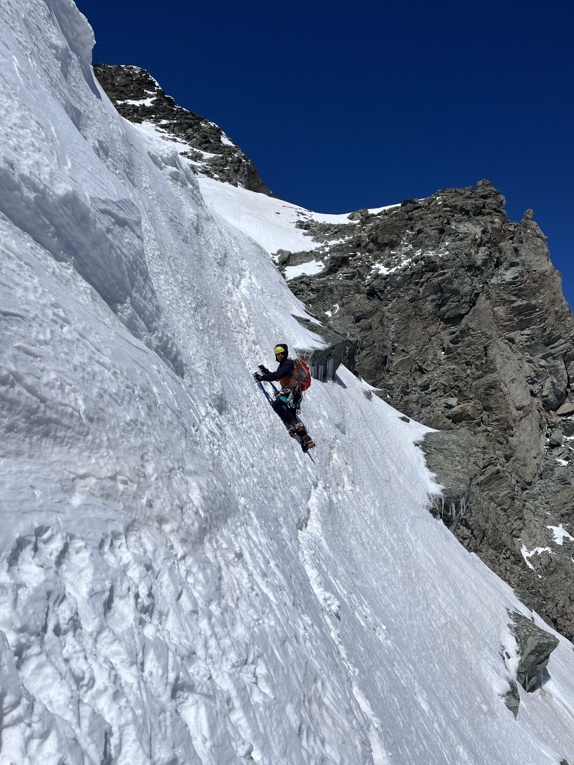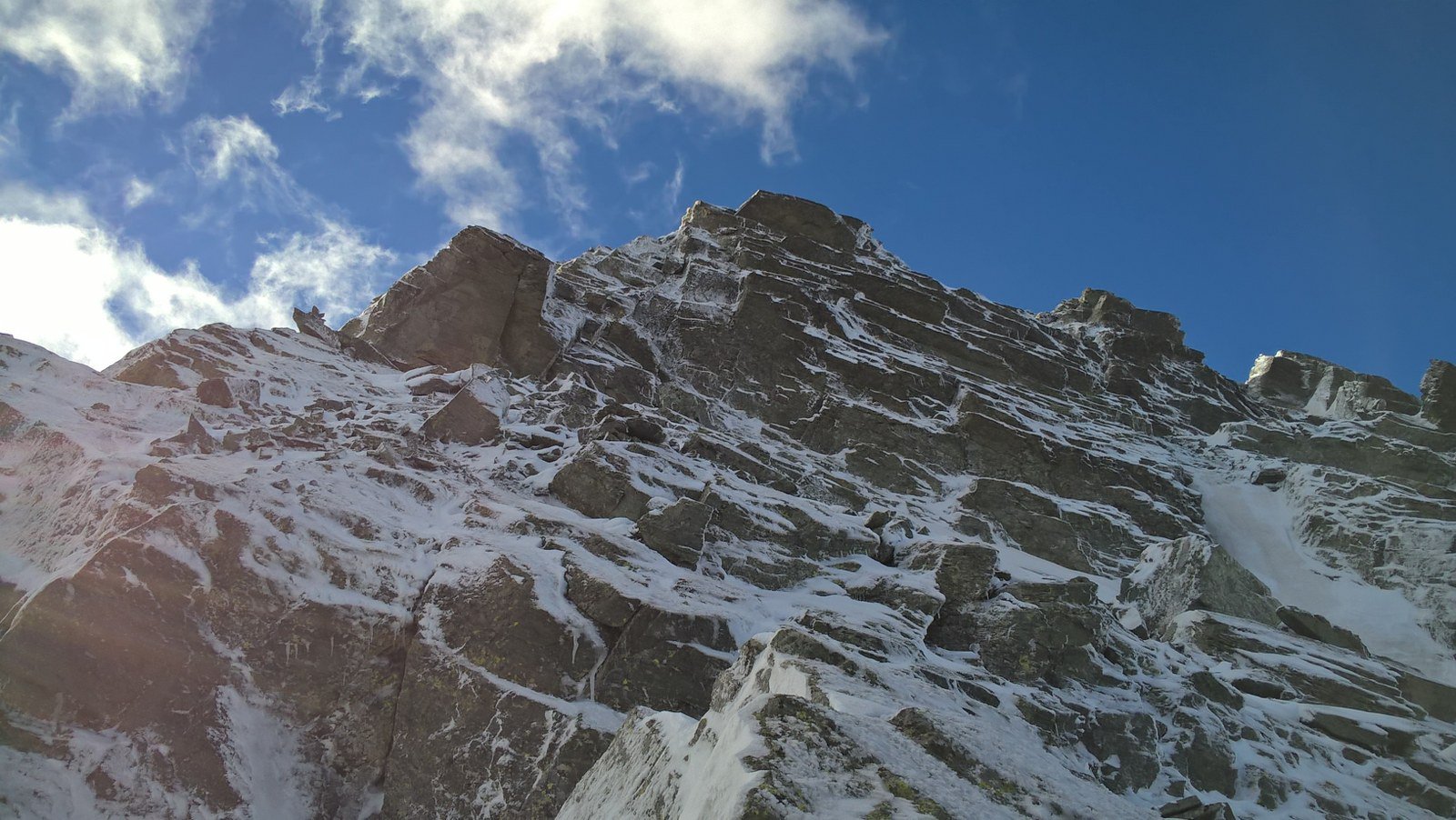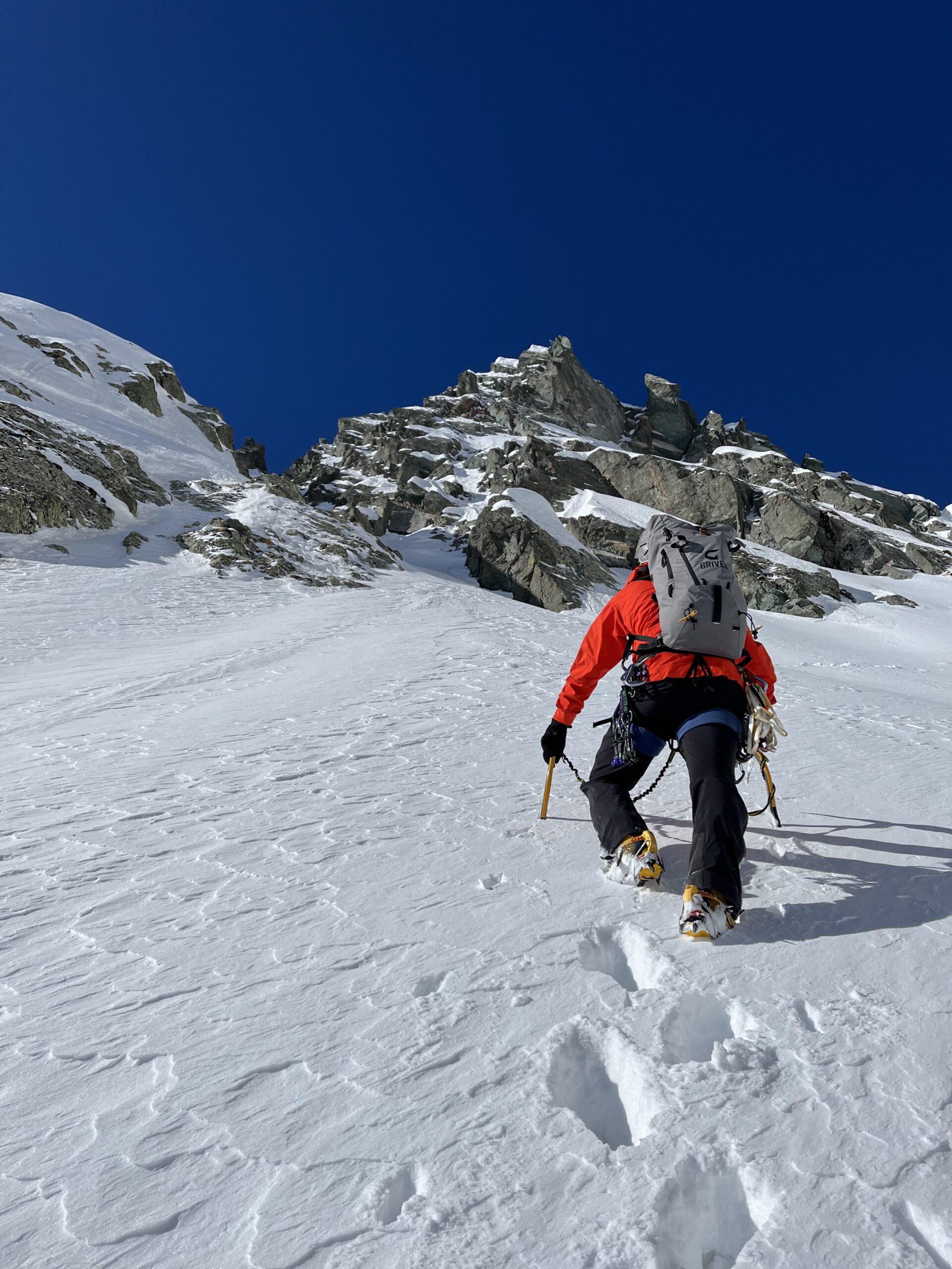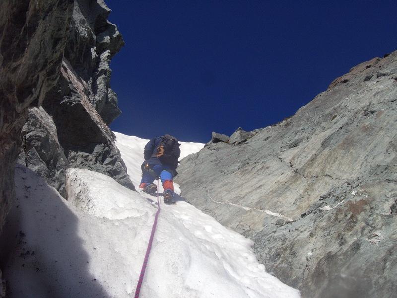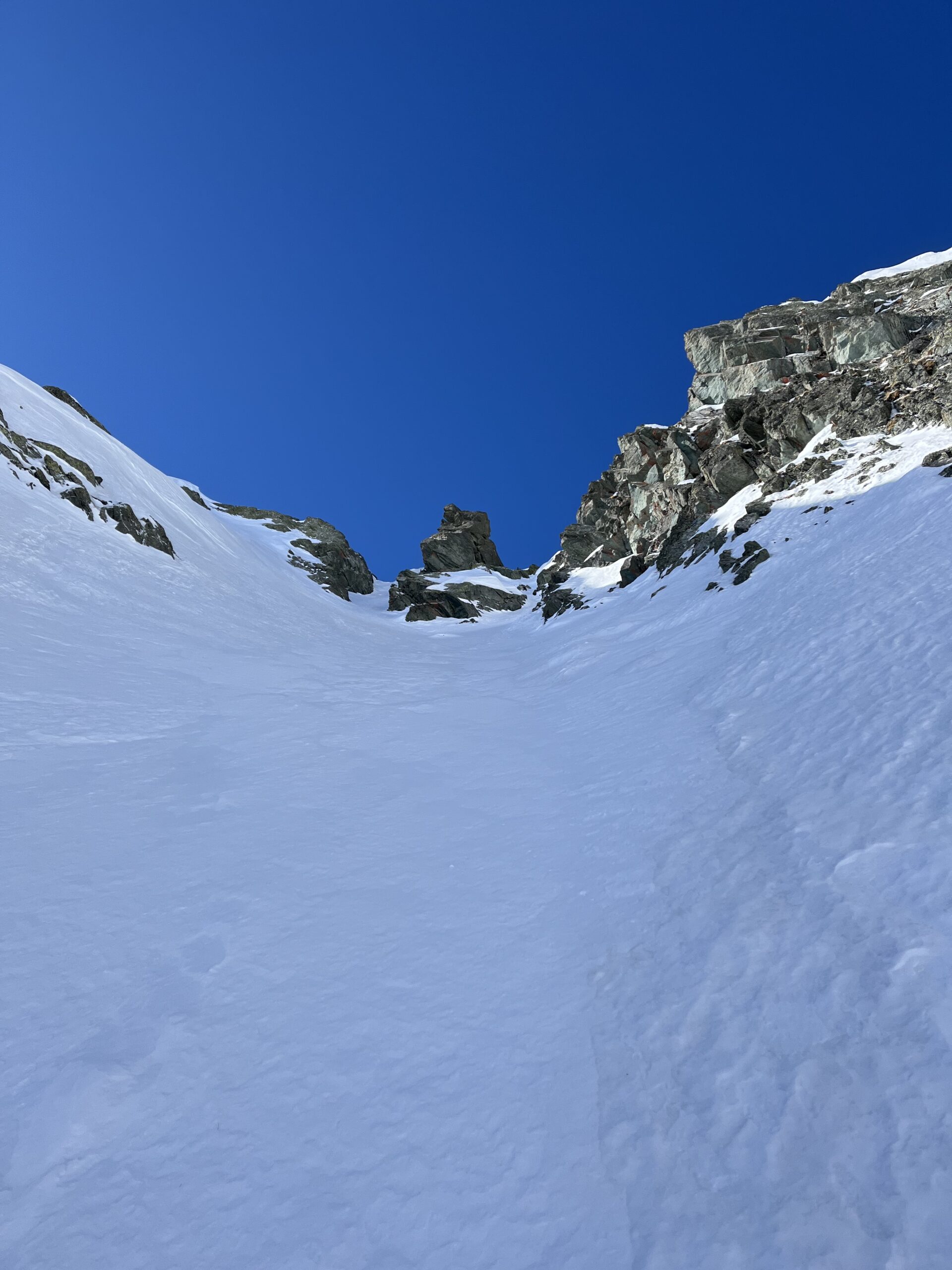 Lasciato il percorso del Couloir Bianco sulla destra si risale il canale che si insinua tra gli speroni rocciosi, diventando man mano più stretto e ripido (45° e oltre) giungendo sotto il torrione; qui due possibilità, risalire a sinistra l’ultima parte del canalino dove l’inclinazione aumenta o aggirando a destra salendo con breve arrampicata su misto le asperità rocciose coperte dalla neve (II°+) arrivando in cresta (3025 m).