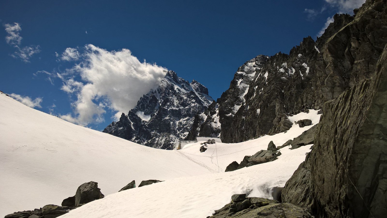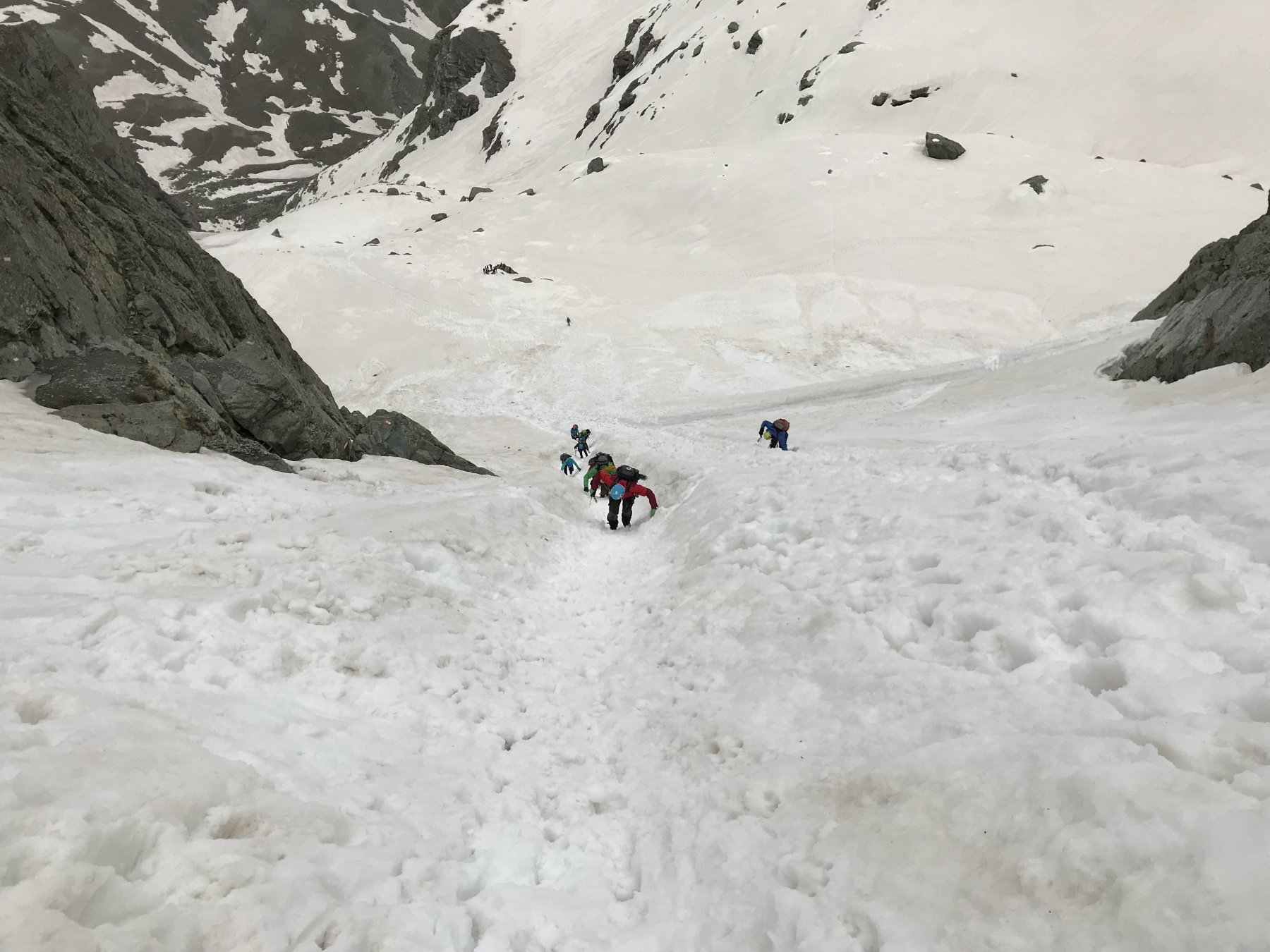 Dirigersi a sinistra incrociando il sentiero del Postino, si salgono le lingue di neve raggiungendo il conoide (quota 2600 m circa) che scende dal colle del Couloir Bianco situato tra la punta Venezia e le Rocce Fourion.