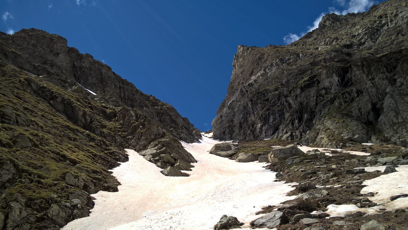 Si abbandona la traccia che scende al Pian del Re per salire a sinistra la balza rocciosa attrezzata con quattro pioli di ferro e alcuni metri di catena, “Sentiero del Postino”. Si percorre con diversi saliscendi un’aerea cengia erbosa passando sotto degli strapiombi di roccia. Il sentiero si innalza con alcune svolte fra detriti e tracce nevose di valanghe, si risale puntando all’evidente conoide nevoso che conduce all’inizio del canale del Couloir Bianco a quota 2600 circa.