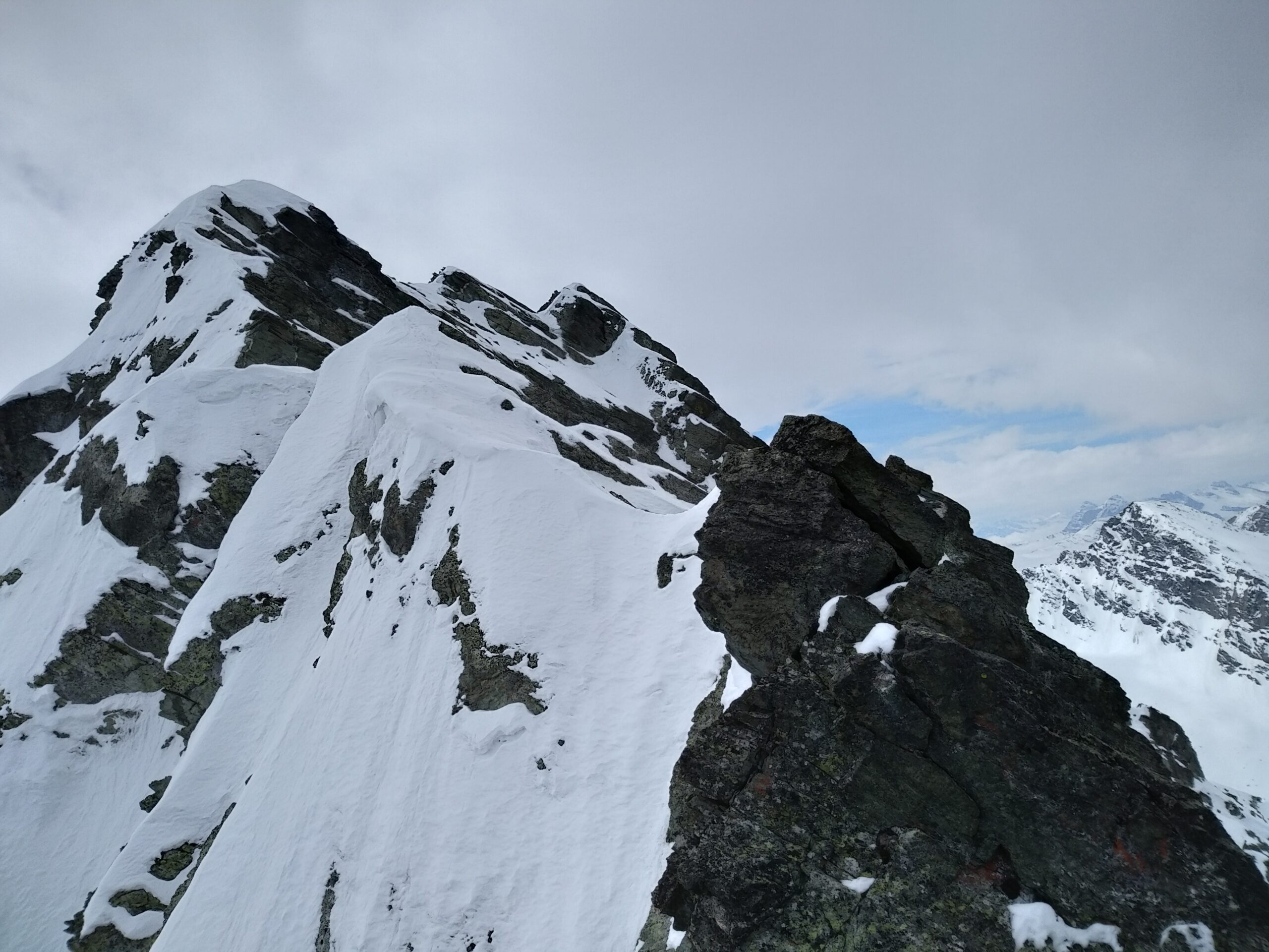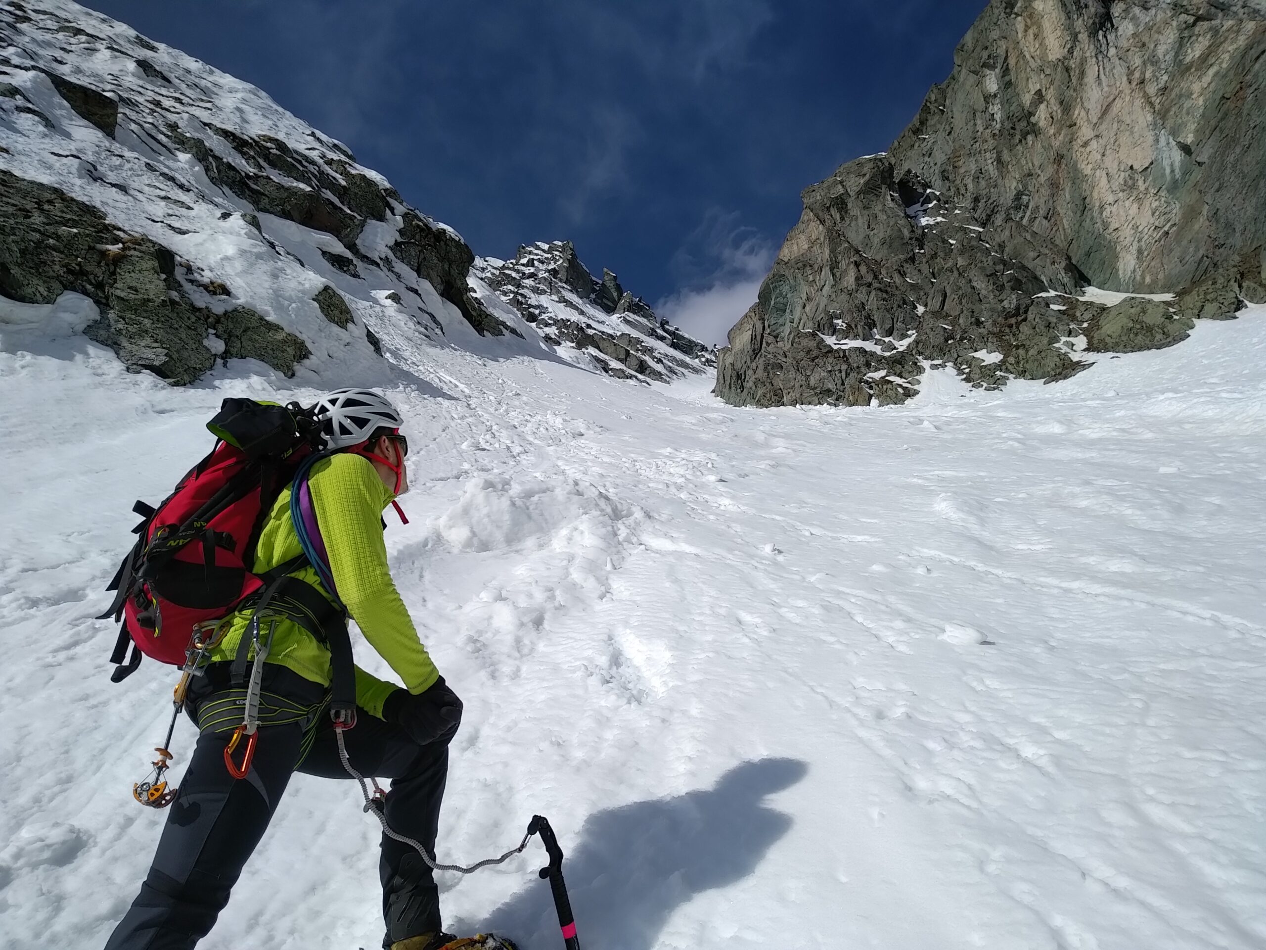 Prima parte di canale in buone condizioni con pendenza sui 45° costanti, abbiamo poi imboccato sulla sx(150m prima del colle del couloir bianco) il canale N vero e proprio, più stretto e incassato con pendenza sui 50° circa. Uscita delicata su neve verticale inconsistente (fatto un breve tiro),seguito poi la cresta fino in vetta (spit nei tratti più esposti). Discesa rapida su neve dal couloir del porco.