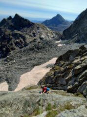 Nevaio presente ma non servono ramponcini, attacco a sinistra della catena (scritta sbiadita bianco/rossa). L1 un pò liscio ma abbastanza pulito, L2 che si azzera bene 🙂 e dopo bel muro continuo; eccetto L8 e L9 facili, tutti gli altri sono sempre carini e piacevoli da scalare, belli i tratti in cresta dal sapore alpinistico.