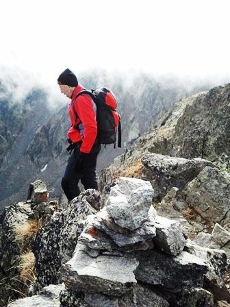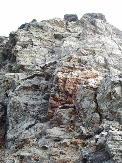 Siamo arrivati al passo, facile arrampicata fino al terrazzo, poi seguito gli ometti che andavano verso la cresta. Con arrampicata sempre di base ma roccia non solidissima, continuiamo la progressione e sulla via incontriamo Beppe e Marco, già incontrati sulla Valcuca domenica scorsa, che combinazione!! Così tutti e quattro procediamo seguendo gli ometti (posso dire.. troppi?? ti mandano dappertutto, non si sa più dove passare…) e le indicazioni di InCima. In effetti seguendo la cresta sembra che i passaggi siano quelli descritti nel libro e la difficoltà può essere identificata in PD- , però secondo me si allunga e ci si incasina di più; oltretutto anche le tempistiche lette (40′ dal passo alla Cima) sembrano strette passando di qua. Siamo stati pochissimo in punta perché eravamo parecchio di fretta, poi giù velocemente passando sulla cengiona lato Laghi, che tecnicamente è più facile.