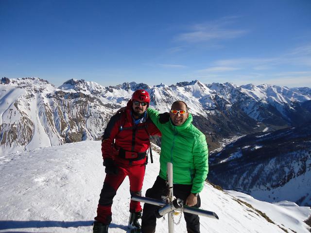 Per esigenze lavorative e il poco tempo a disposizione oggi si ripete. L’innevamento in quota almeno in Valle Stura è ancora accettabile. Si parte comodamente sia dal lago che dal colle indistintamente. Noi oggi abbiamo preferito salire direttamente dal lago. Temperatura alla partenza circa -5 ma il sole faceva già capolino e ci ha accompagnato per tutto l’itinerario, meno male, niente vento come le altre volte. Traccia di salita come sempre autostradale e nel pendio finale abbastanza dura e gelata e per tranquillità messo i coltelli. Comunque utili ma non indispensabili, come ha dimostrato il mio compagno di gita. Discesa tutto sommato accettabile su neve crostosa comunque sempre portante e sciabile che ci ha dato la possibilità di fare comunque qualche bella curva. Pendii tutti molto lavorati dai frequenti passaggi dato la stagione avara di precipitazioni. Non si tocca da nessuna parte. Un saluto ad Antoine skialper francese di Barcelonette giunto in vetta poco dopo noi.
