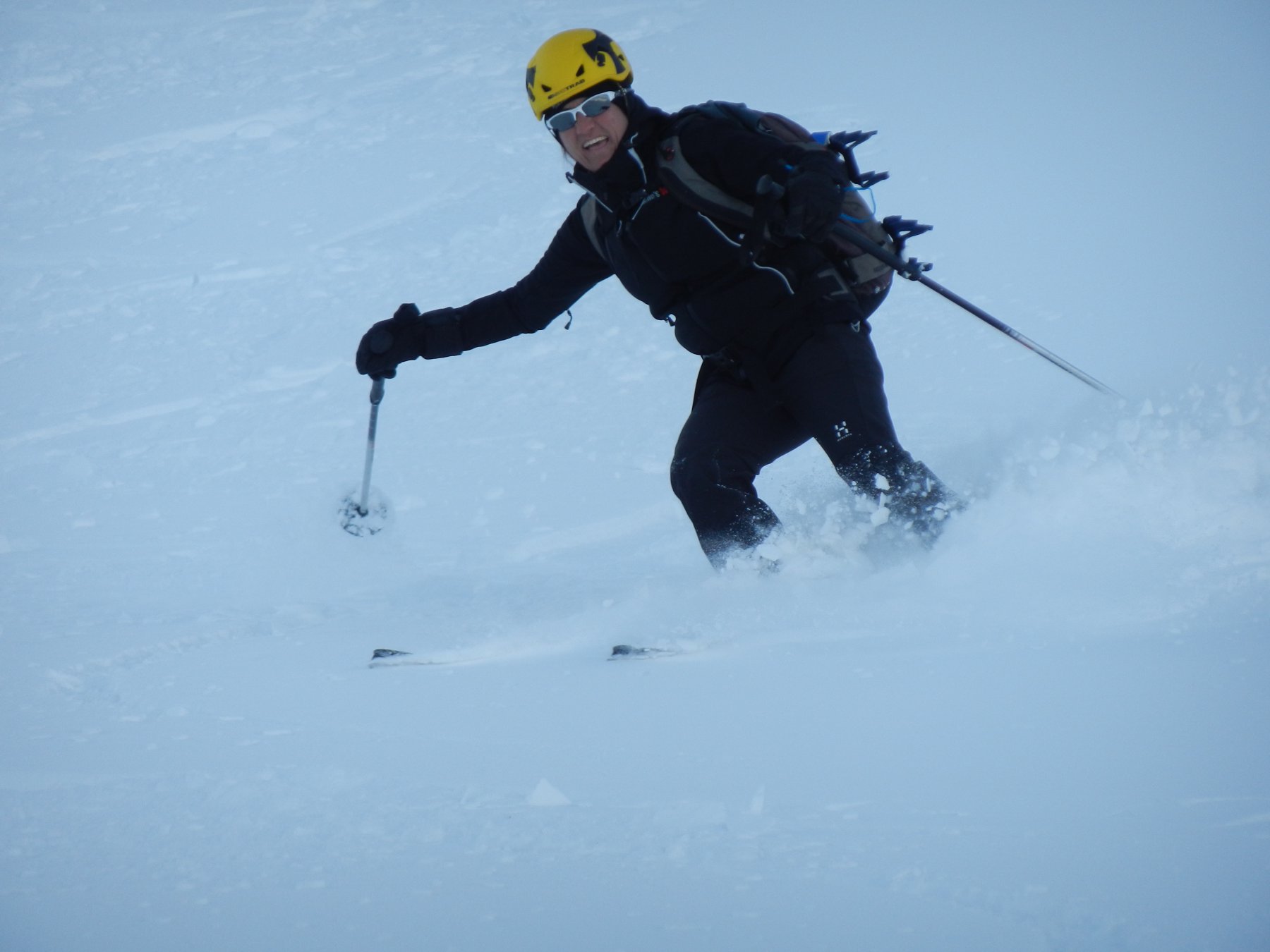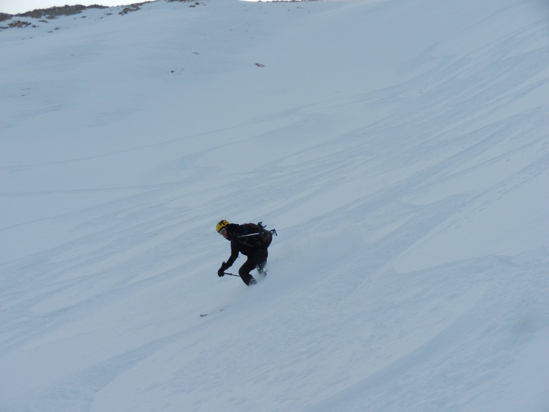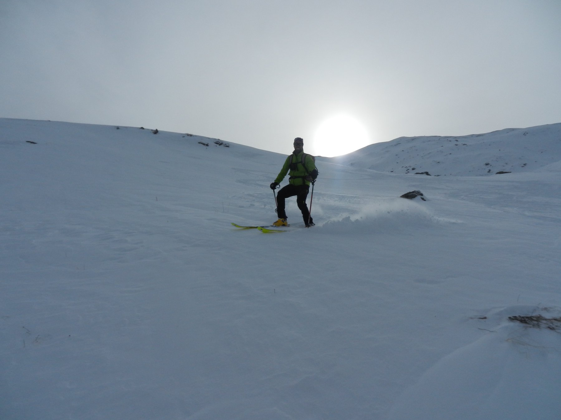 I 10cm di neve fresca caduti ieri non hanno migliorato la situazione ma reso l’ambiente più invernale. Partiti dal lago sci ai piedi ci siamo dedicati a vari ripelli sul versante nord da circa 2400 in vetta dove vi era un buon fondo e si poteva fare qualche bella serpentina. Nell’ultima discesa ci siamo tolti gli sci a 150m dal lago per l’assenza di fondo comunque c’è chi è sceso fino al colle o al lago sci ai piedi.