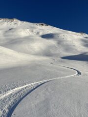 Sceso sul pendio ovest (lato Francia), in condizioni oniriche; toccata una sola pietra, ma per sconsideratezza.