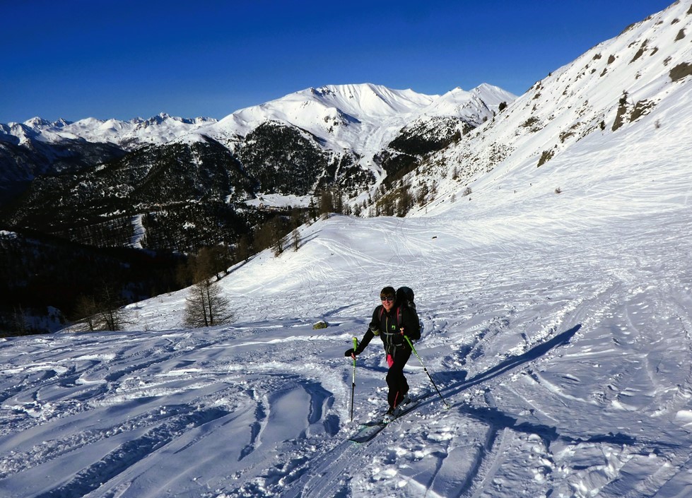 Partenza da Claviere paese per la pista di fondo, salita nel bosco su bella traccia con quattro dita di farina ed anche più in alto, dove l’ambiente è davvero bello nonostante i pendii siano ormai ultra tracciati.