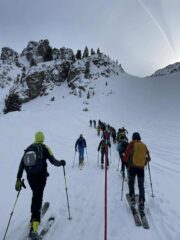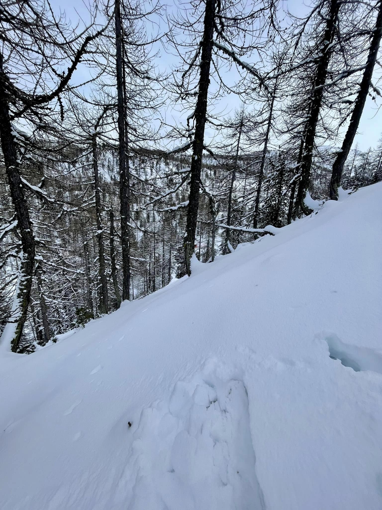 Saliti seguendo uno degli itinerari tracciati apposta per scialpinisti, grossomodo come descritto qui nell’itinerario, raggiunto la partenza della nuova cabinovia Rocher de l’Aigle e proseguito nel bosco lato pista uscendo poi poco sotto il colletto raggiunto sempre bordo pista con uno/due tagli. Discesa per il versante italiano su bei pendii con neve ancora polverosa e molti tratti intonsi, poi ingresso nel bosco con un po’ di ravanage perr raggiungere le piste di rientro a Claviere.