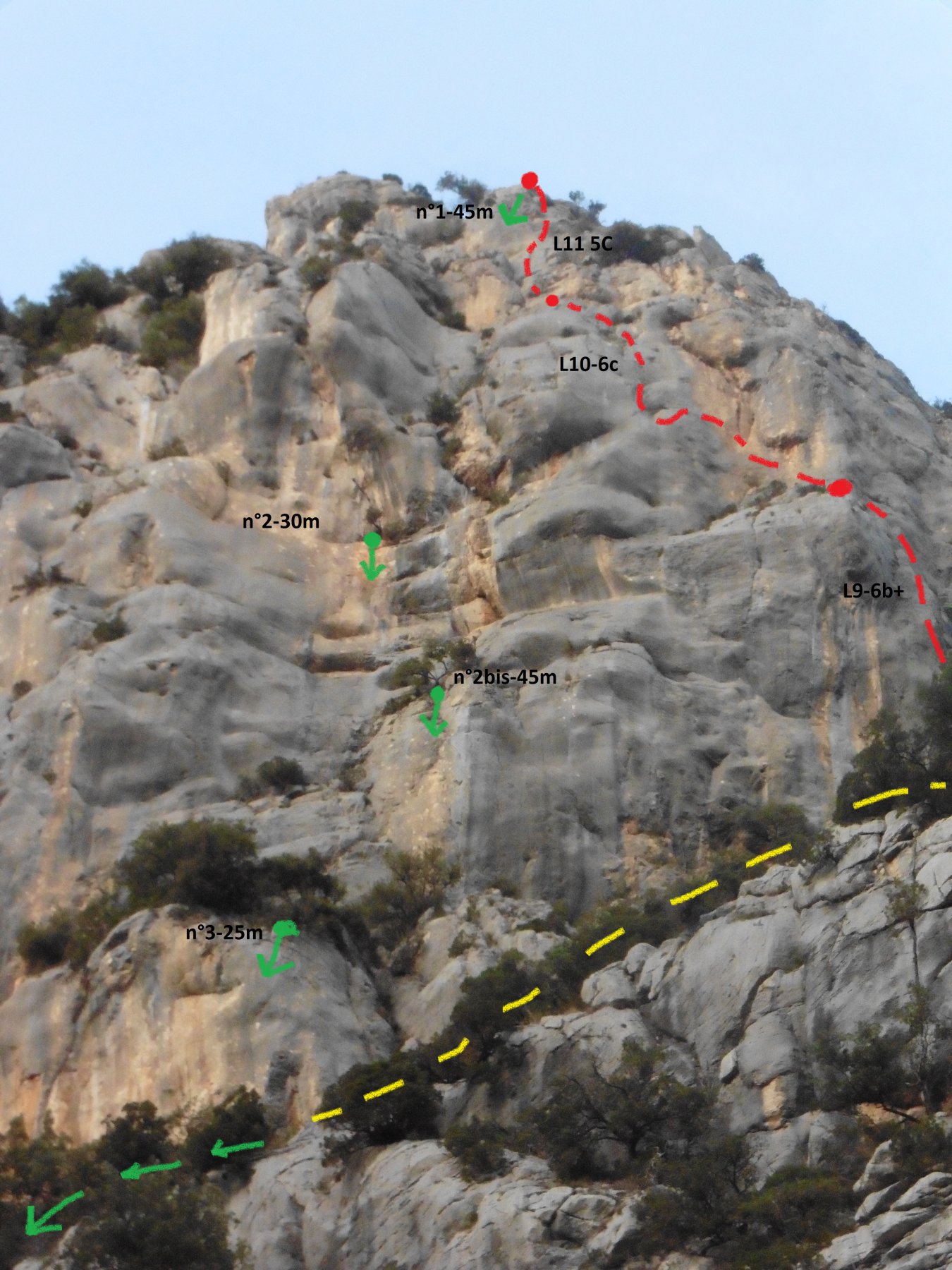 Soste da collegare (tranne l'ultima da cui ci si cala) , protezioni mobili inutili. (6c max, 6b obbl ,S1+)