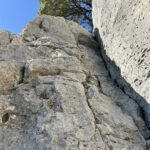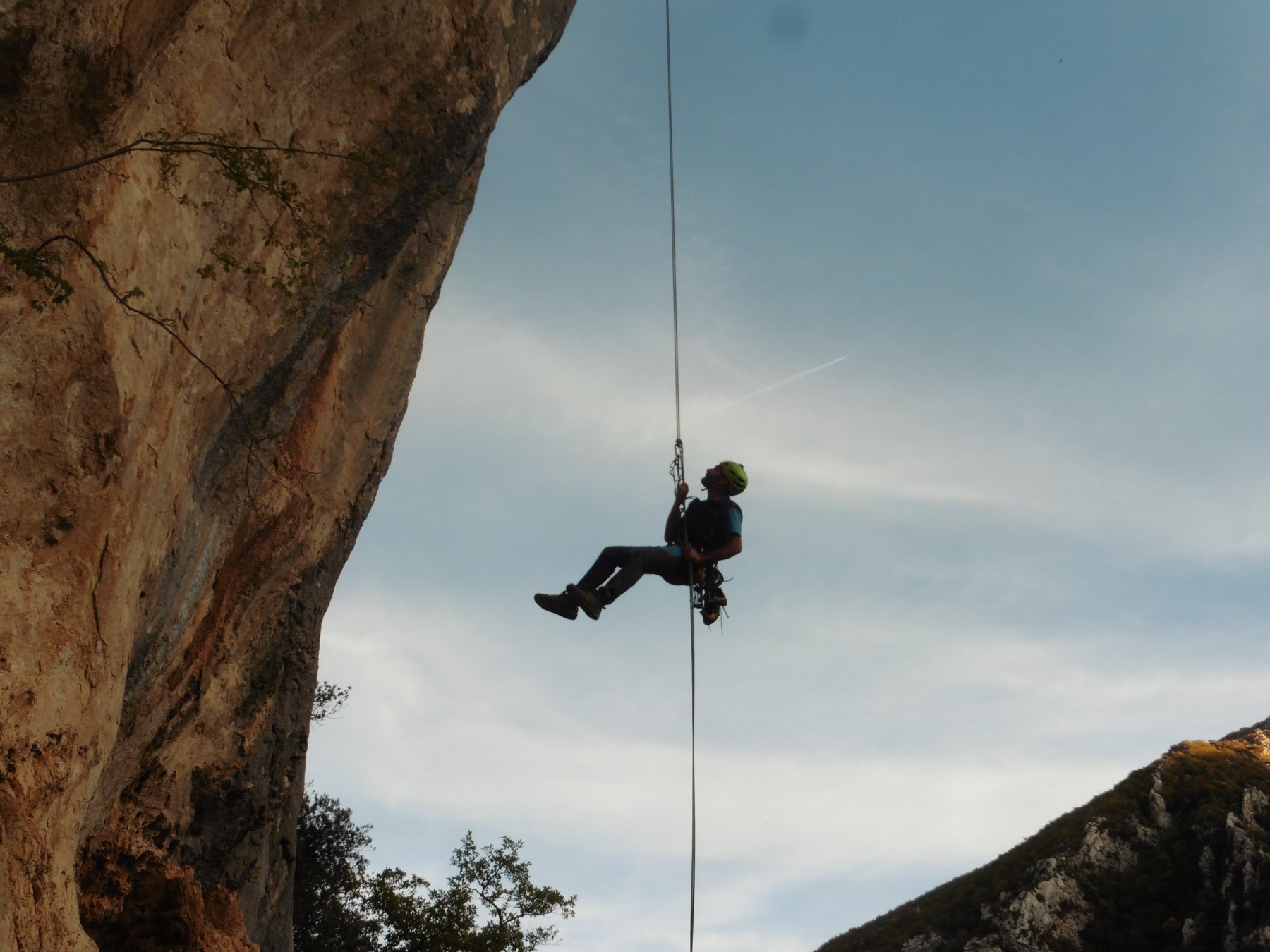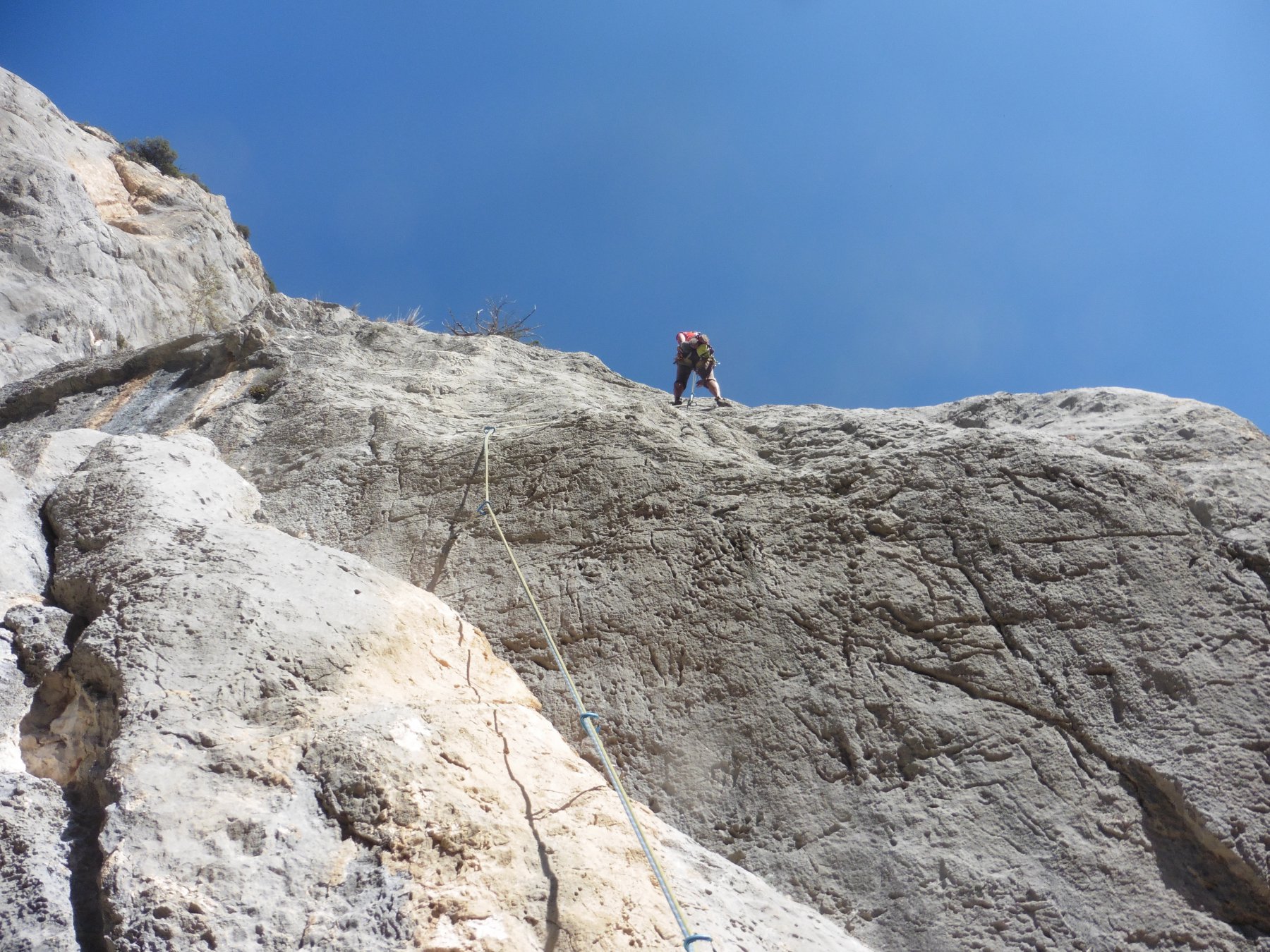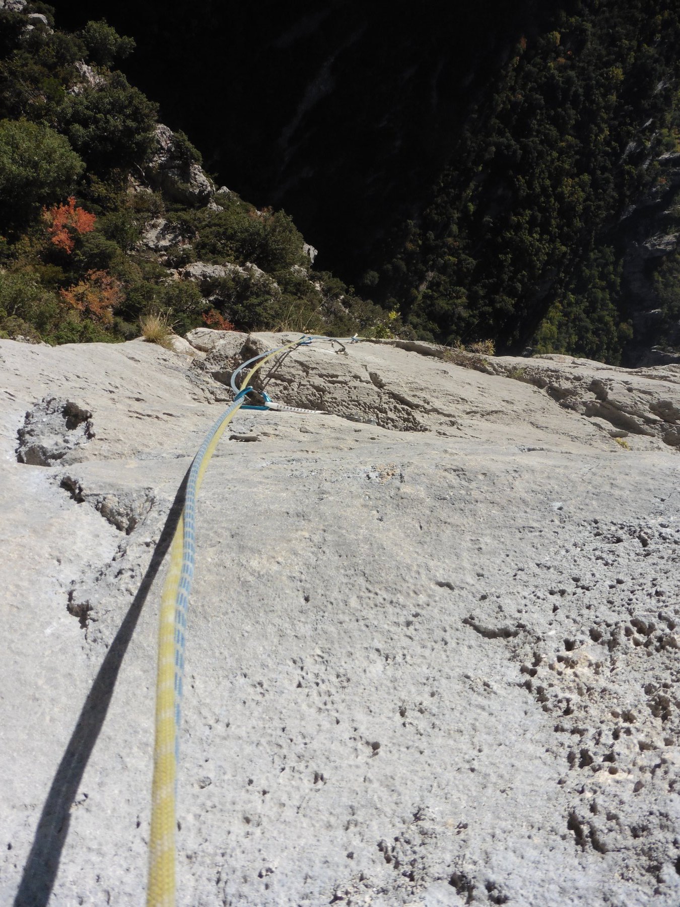 vie di scampo facili durante alla salita: fino all’inizio del 4 tiro ci si può calare senza problemi con una sola doppia, poi giunti alla sosta alla fine del 6 tiro si può scendere a piedi per il bosco sospeso