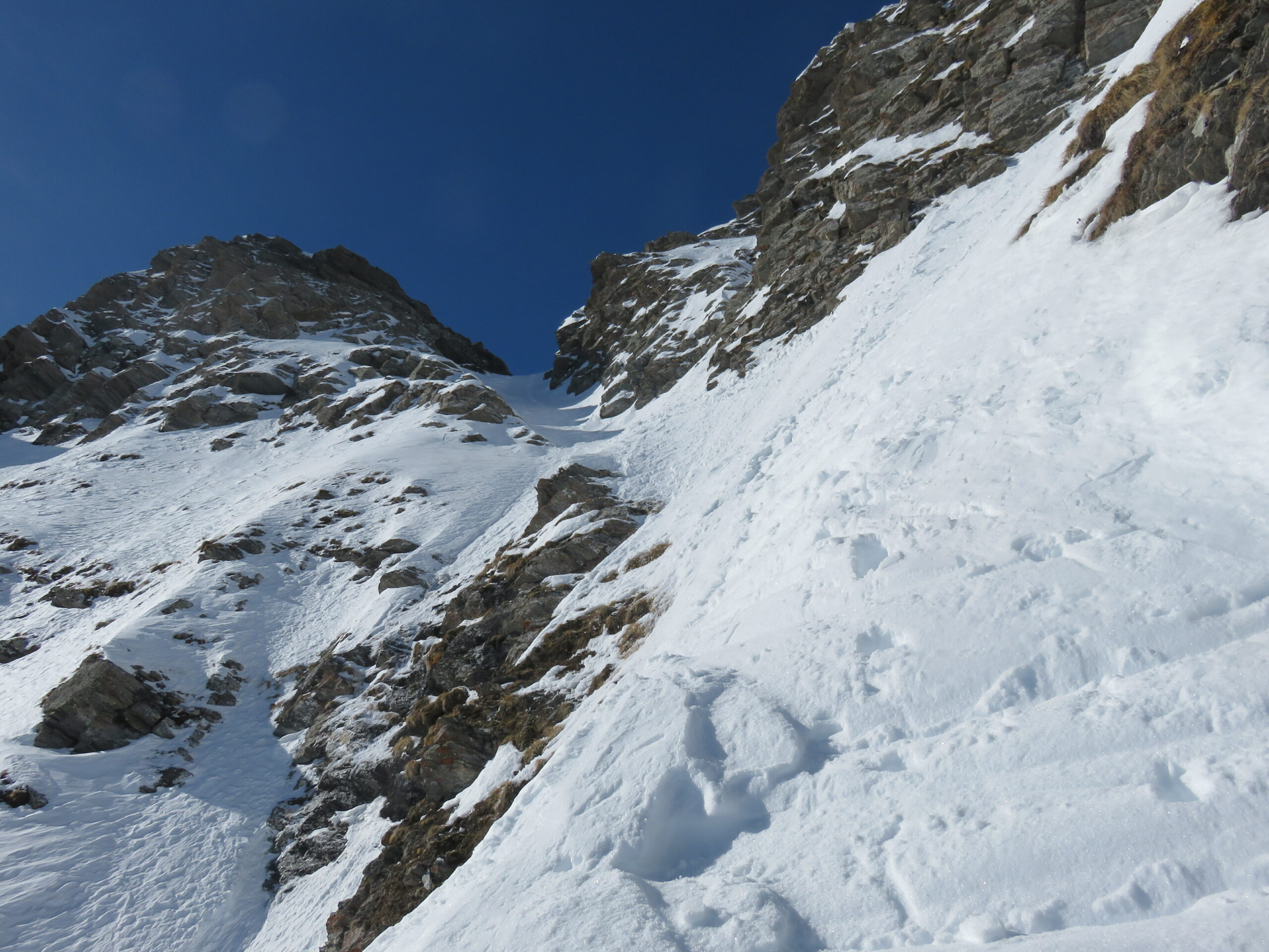 Partenza sci a spalle verso le 6:15 da Giordano (le pelli si possono comodamente lasciare a casa). Il primo salto del canalone ovviamente quest’anno è scoperto e senza ghiaccio, l’abbiamo evitato a dx tramite un camino di roccia marcia con uscita delicata. Si prosegue su neve ripida e ghiaccio bucato (tratti a 60°) fino alla base della cascata, ovviamente allo stato liquido ed evitata “comodamente” a dx per teppe ripide e roccette (che si imboccano una decina di metri prima della cascata). Occhio a non salire troppo e trovare il posto giusto per rientrare nel canale. Neve un po’ irregolare ma portante fino all’interruzione successiva, in ghiaccio cottissimo ed evitata tramite comoda cengia e un po’ di tepping sulla sx. Il traverso per rientrare nel canale a monte del salto è comodo e pressoché tutto innevato. Si prosegue nell’infinito canale su neve portante con un velo di ventata riportata. Man mano che le pendenze si raddrizzano la neve diventa più faticosa, per tratti un po’ meno portanti alternati a cemento. Stando nel canale principale si trovano ancora due saltini di ghiaccio facile e divertente e poi finalmente si arriva alla rampa: molto scenografica! Prima parte facile, la seconda parte in traverso per entrare nel canale finale invece presenta un tratto a 50° con neve non portante. Canale finale su una vecchia placca a vento stabilizzata. Per roccette e lingue di neve in 5-10min si arriva alla agognata croce di vetta. Due foto veloci e poi Marco inizia la sua discesa a piedi dalla cresta NE mentre io torno al deposito sci, via i ramponi e si scende.