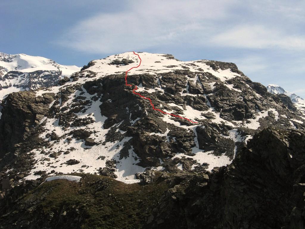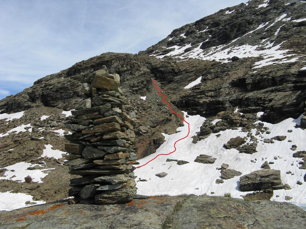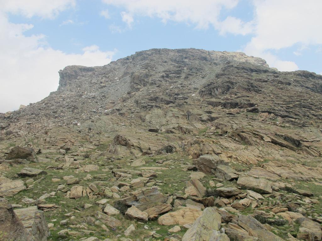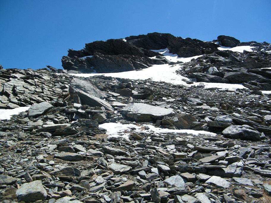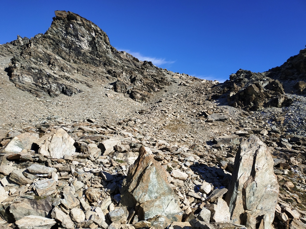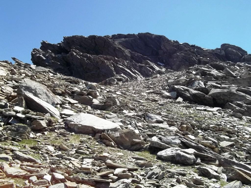 Qui si potrebbe sia passare all’estremità destra di questa parete salendo per un pendio di detriti e pietrame instabile, ma il percorso più logico e divertente è di proseguire sul bordo sinistro, facendosi aiutare dai numerosi ometti, piegando leggermente a sinistra sino a raggiungere una specie di crestone roccioso che precipita su un canalone rivolto a O-SO. Si sale fra pietroni e placche rossastre sino ad una fascia di placche più articolate ma sempre ben appigliate; poco oltre si arriva alla base di un camino roccioso che andrà risalito, superando per gradoni alcuni passaggi di facile arrampicata di I+ molto appigliati e assolutamente non esposti. Usciti dal camino si apre dinanzi l’ampio e facile pendio conclusivo, ometti segnalano il percorso migliore tra la pietraia sempre agevole, finchè il pendio spiana e si raggiunge la piatta cima 3022 m.