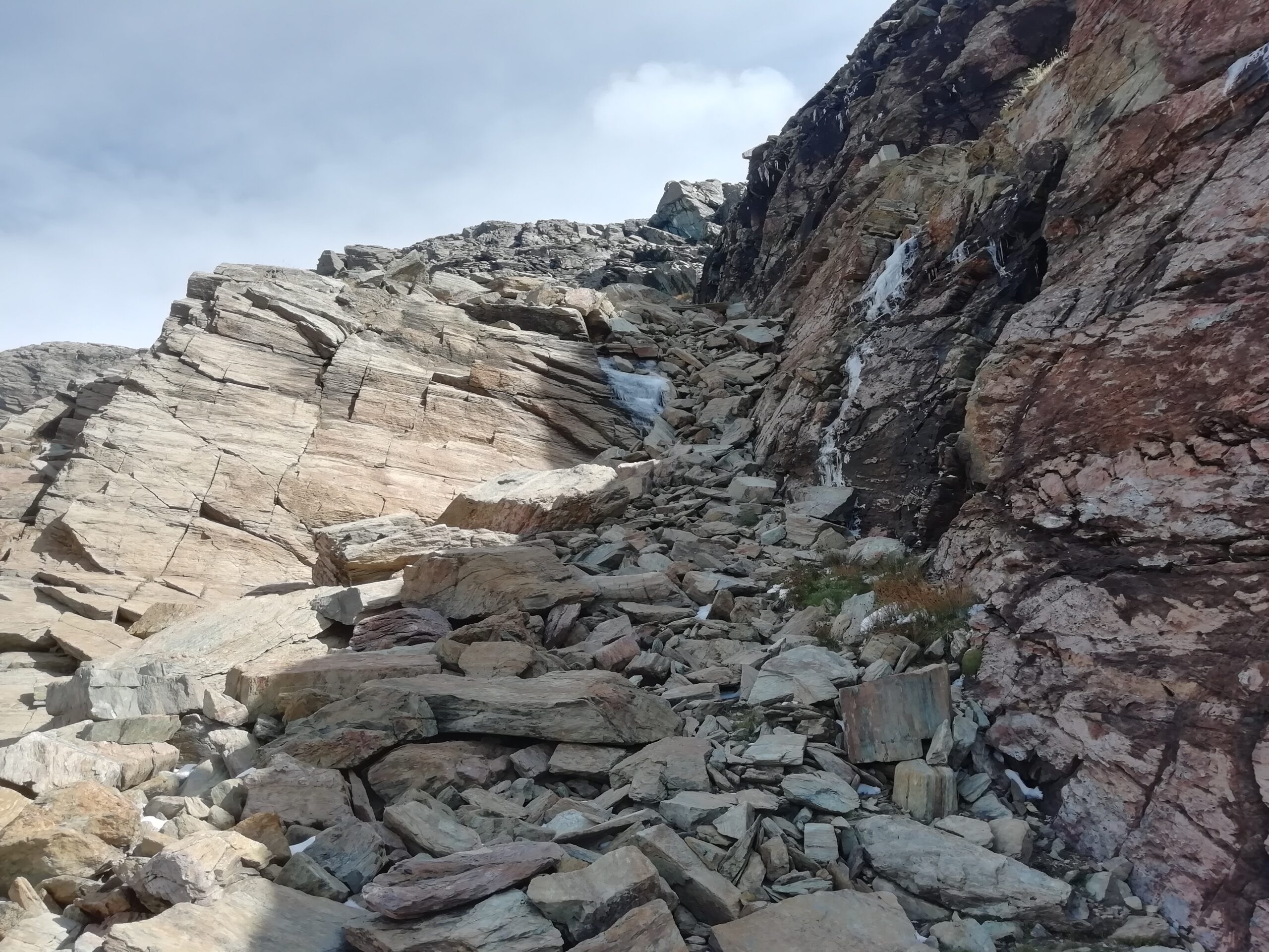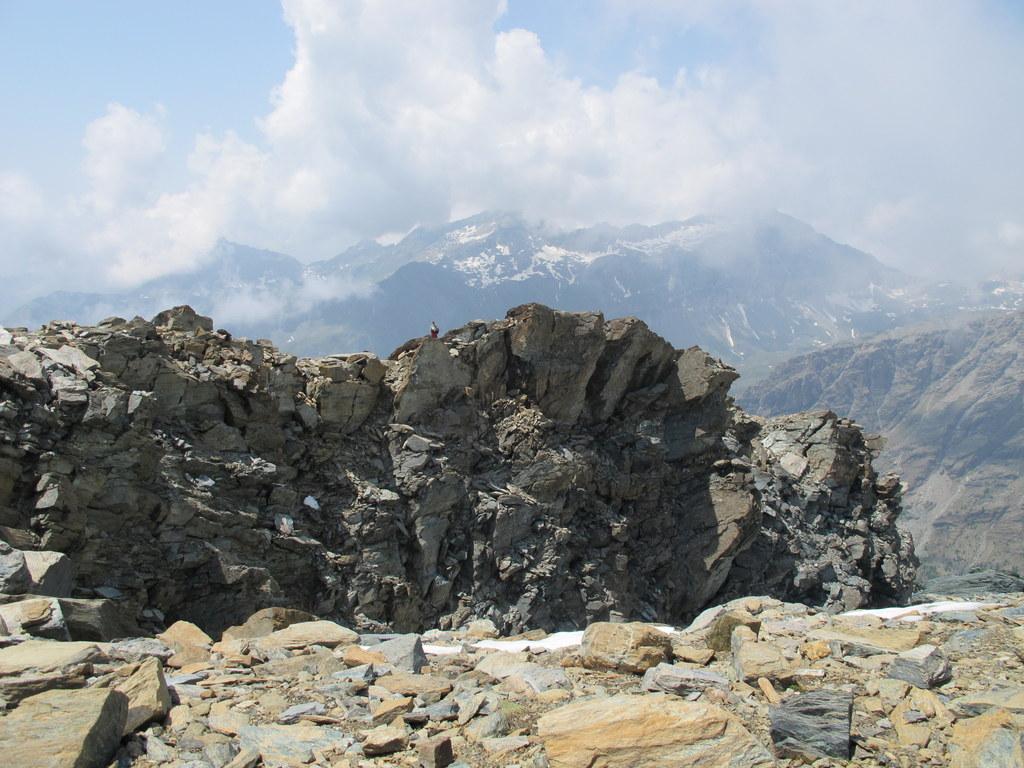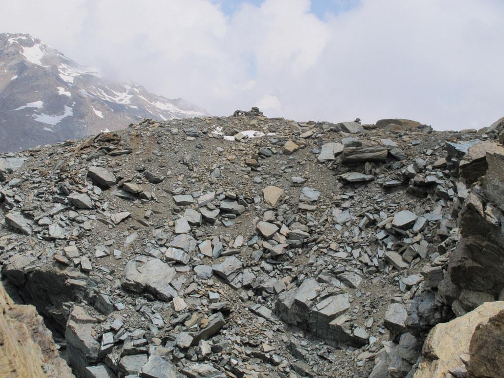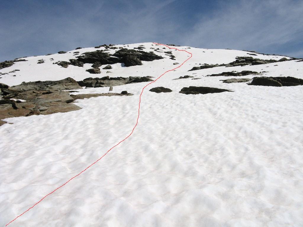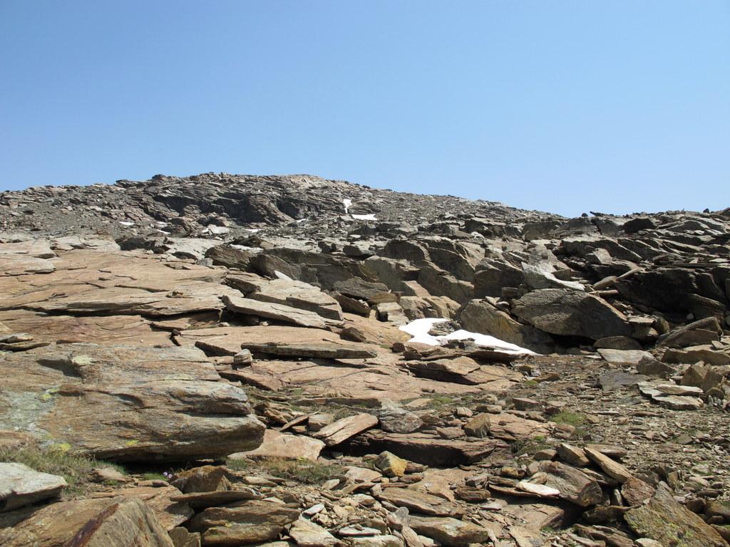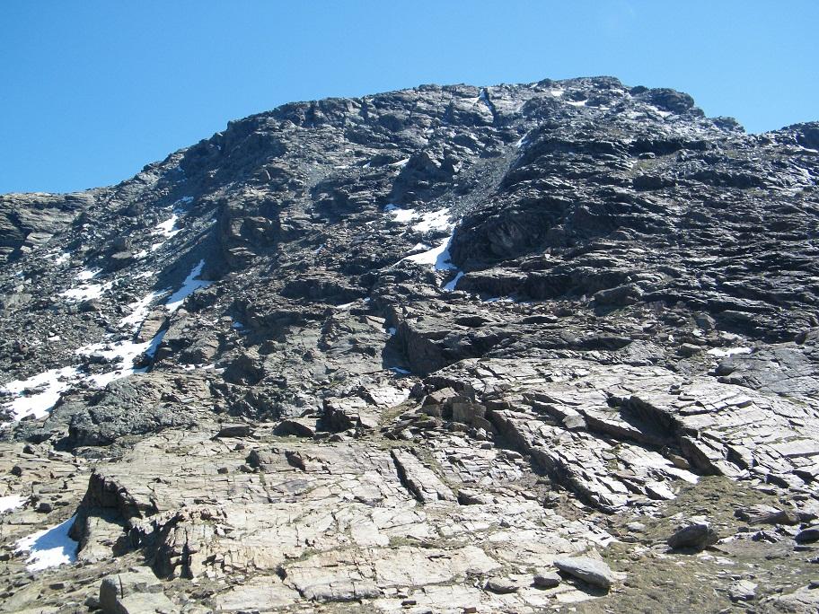 Qui si potrebbe sia passare all’estremità destra di questa parete salendo per un pendio di detriti e pietrame instabile, ma il percorso più logico e divertente è di proseguire sul bordo sinistro, facendosi aiutare dai numerosi ometti, piegando leggermente a sinistra sino a raggiungere una specie di crestone roccioso che precipita su un canalone rivolto a O-SO. Si sale fra pietroni e placche rossastre sino ad una fascia di placche più articolate ma sempre ben appigliate; poco oltre si arriva alla base di un camino roccioso che andrà risalito, superando per gradoni alcuni passaggi di facile arrampicata di I+ molto appigliati e assolutamente non esposti. Usciti dal camino si apre dinanzi l’ampio e facile pendio conclusivo, ometti segnalano il percorso migliore tra la pietraia sempre agevole, finchè il pendio spiana e si raggiunge la piatta cima 3022 m.