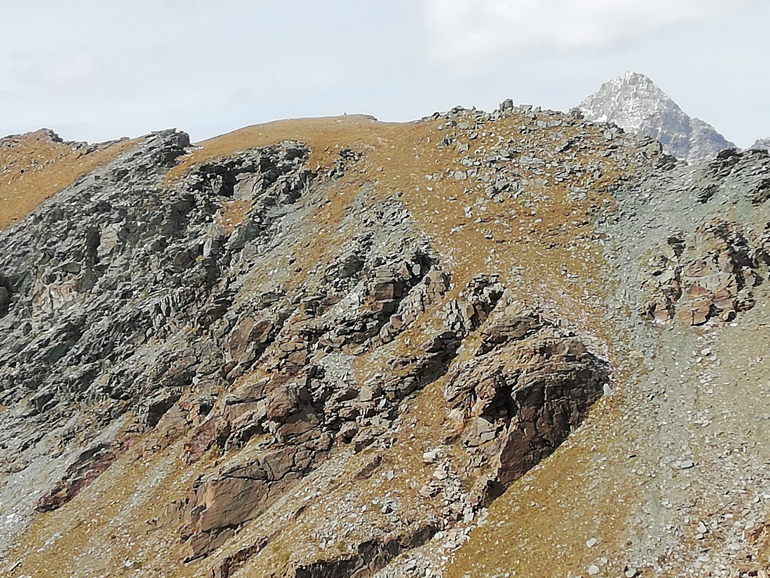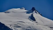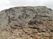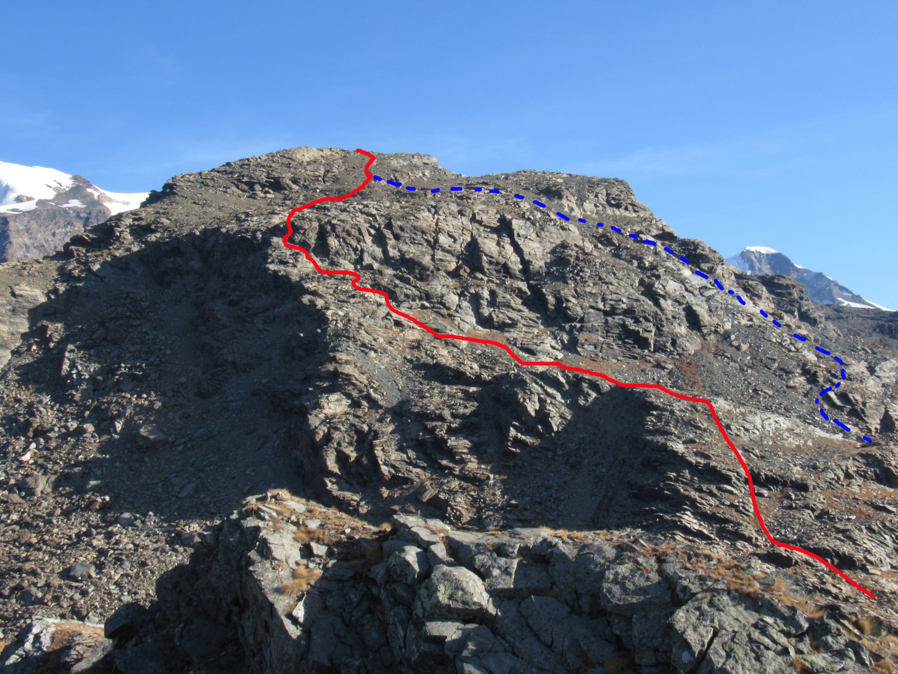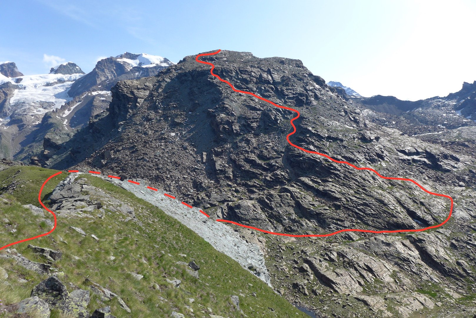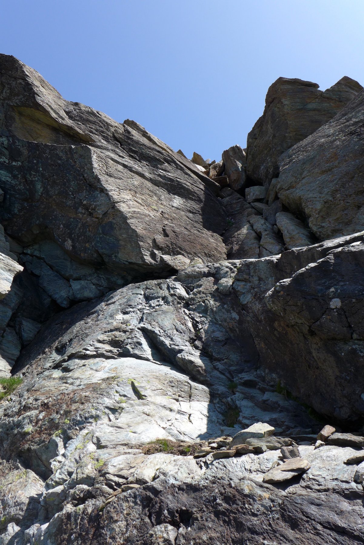 Qui si potrebbe sia passare all’estremità destra di questa parete salendo per un pendio di detriti e pietrame instabile, ma il percorso più logico e divertente è di proseguire sul bordo sinistro, facendosi aiutare dai numerosi ometti, piegando leggermente a sinistra sino a raggiungere una specie di crestone roccioso che precipita su un canalone rivolto a O-SO. Si sale fra pietroni e placche rossastre sino ad una fascia di placche più articolate ma sempre ben appigliate; poco oltre si arriva alla base di un camino roccioso che andrà risalito, superando per gradoni alcuni passaggi di facile arrampicata di I+ molto appigliati e assolutamente non esposti. Usciti dal camino si apre dinanzi l’ampio e facile pendio conclusivo, ometti segnalano il percorso migliore tra la pietraia sempre agevole, finchè il pendio spiana e si raggiunge la piatta cima 3022 m.