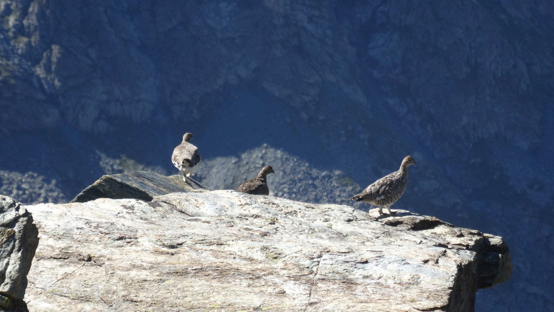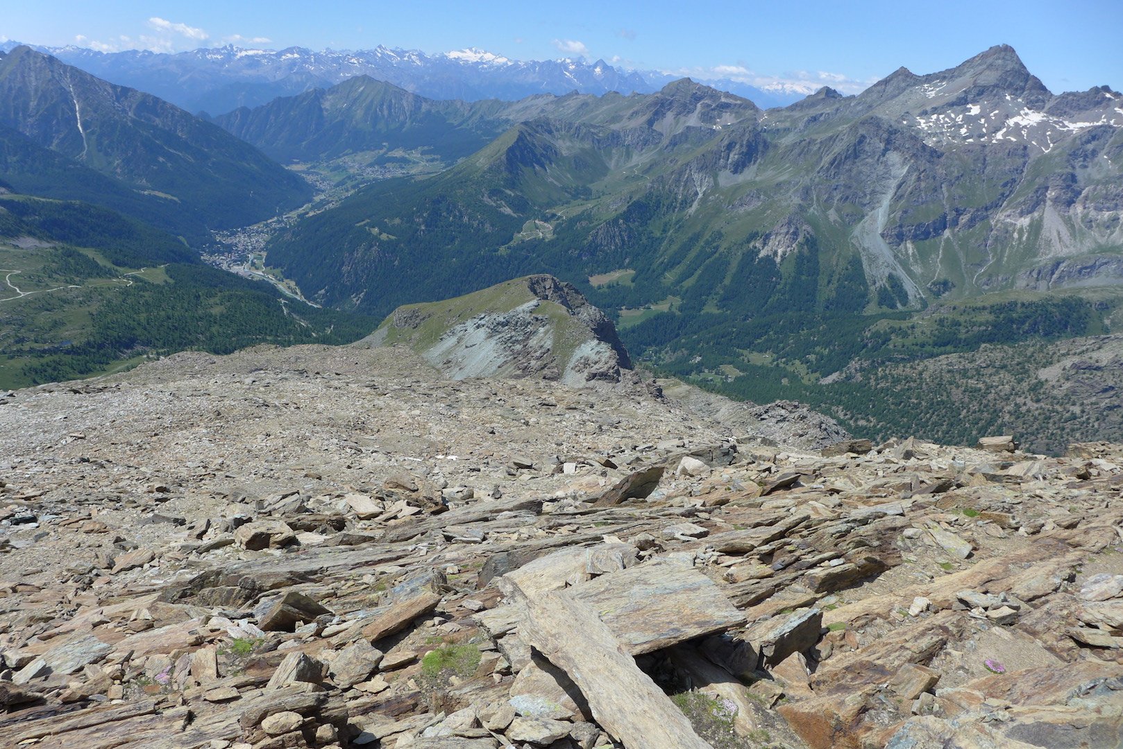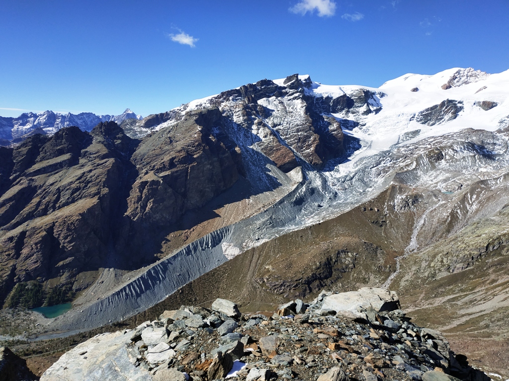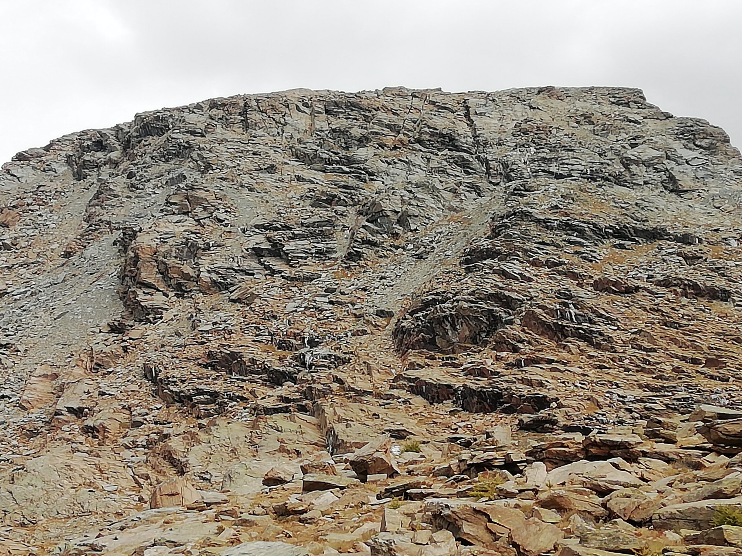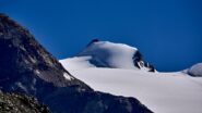 Qui si potrebbe sia passare all’estremità destra di questa parete salendo per un pendio di detriti e pietrame instabile, ma il percorso più logico e divertente è di proseguire sul bordo sinistro, facendosi aiutare dai numerosi ometti, piegando leggermente a sinistra sino a raggiungere una specie di crestone roccioso che precipita su un canalone rivolto a O-SO. Si sale fra pietroni e placche rossastre sino ad una fascia di placche più articolate ma sempre ben appigliate; poco oltre si arriva alla base di un camino roccioso che andrà risalito, superando per gradoni alcuni passaggi di facile arrampicata di I+ molto appigliati e assolutamente non esposti. Usciti dal camino si apre dinanzi l’ampio e facile pendio conclusivo, ometti segnalano il percorso migliore tra la pietraia sempre agevole, finchè il pendio spiana e si raggiunge la piatta cima 3022 m.
