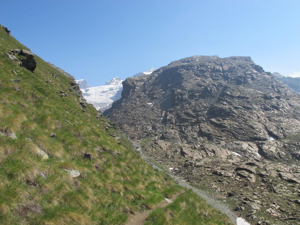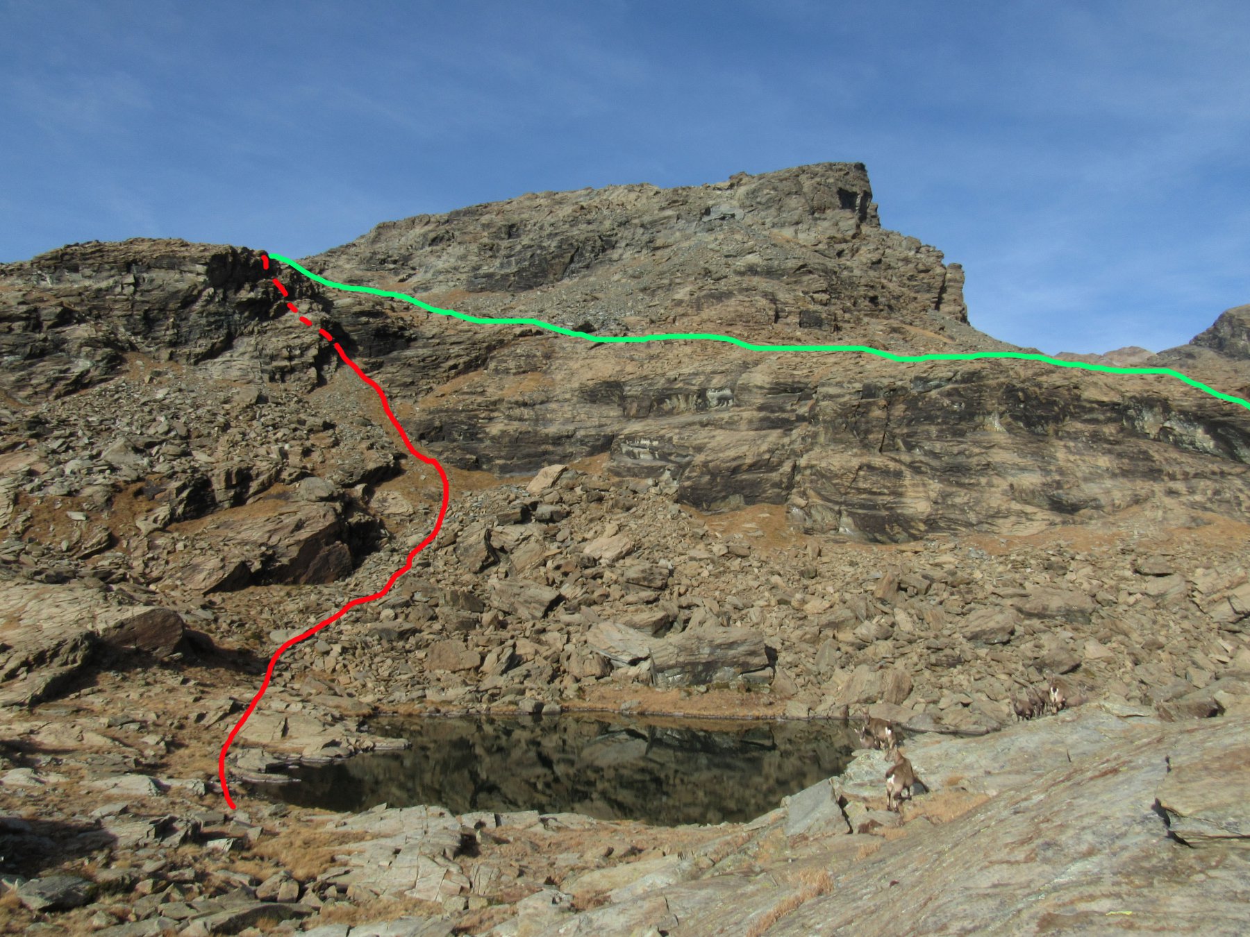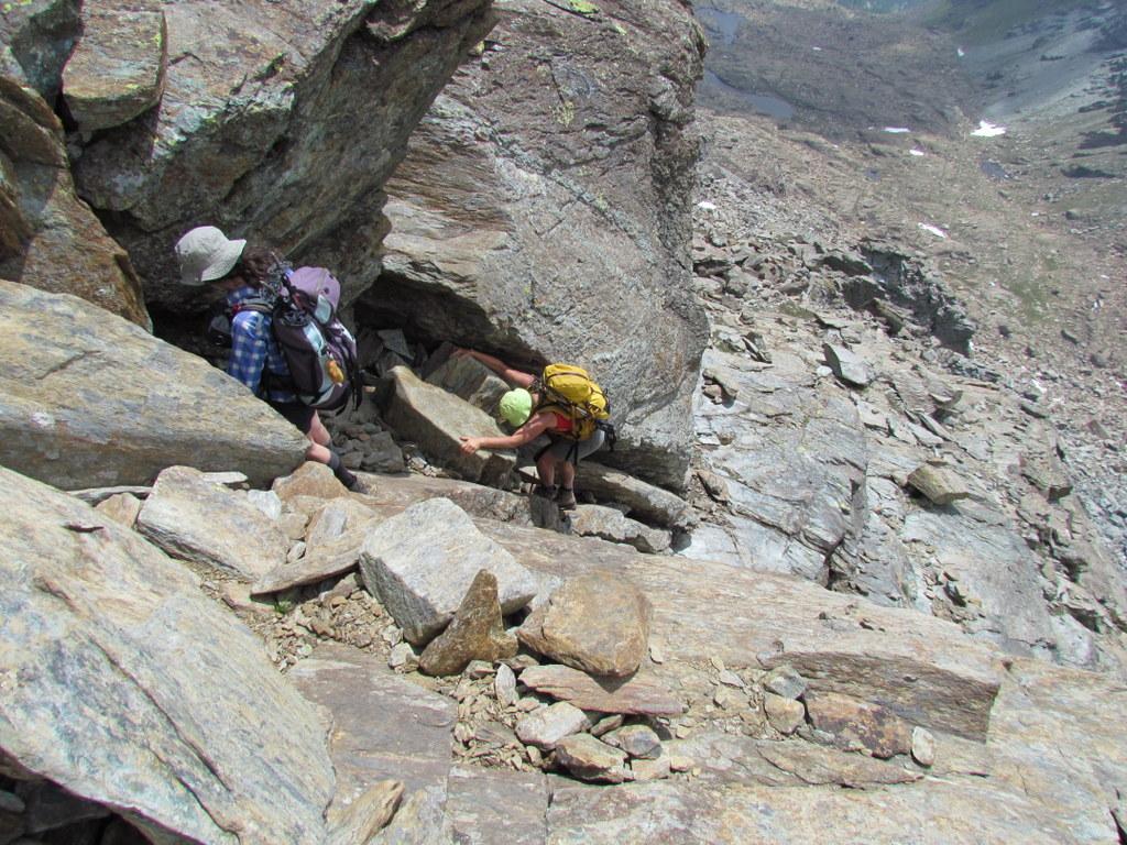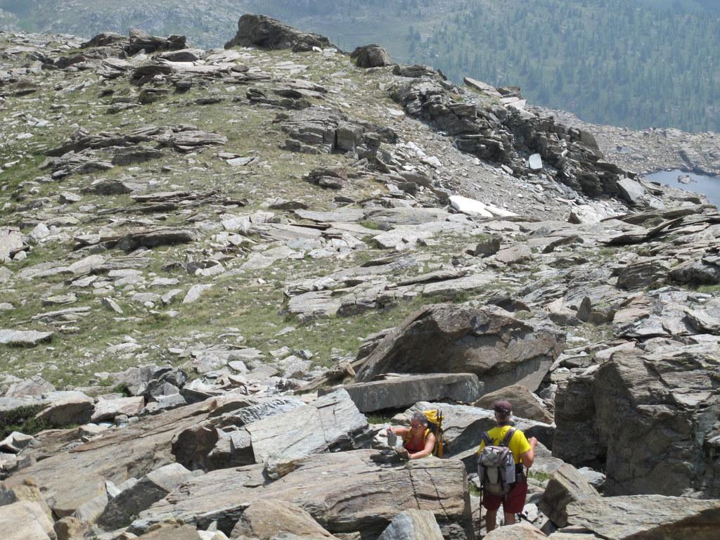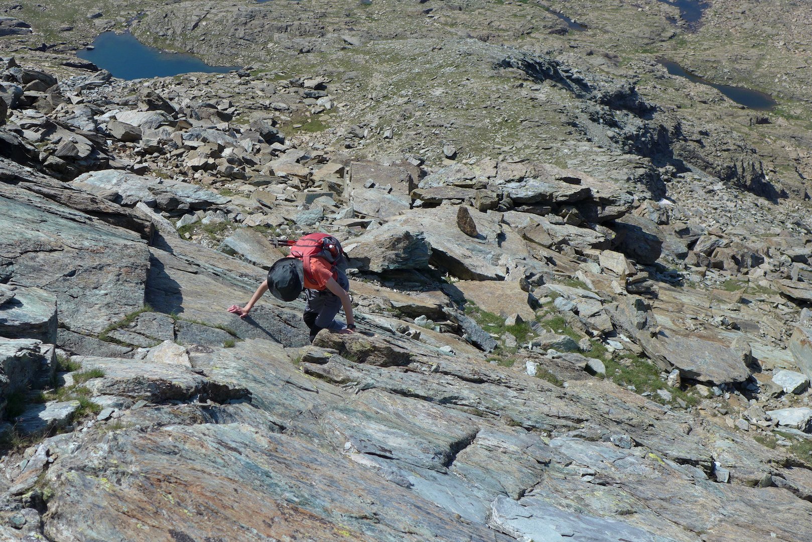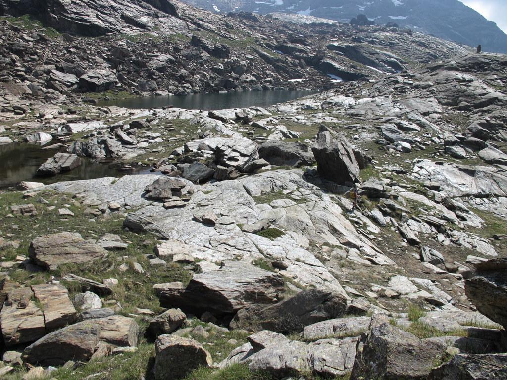 Si lasciano i laghi a destra ben distanti per puntare alla prima fascia di rocce montonate e placche, che si salgono con molta facilità senza percorso obbligato fino a raggiungere un ampio terrazzo erboso sotto la bastionata rocciosa che sorregge il pendio finale.