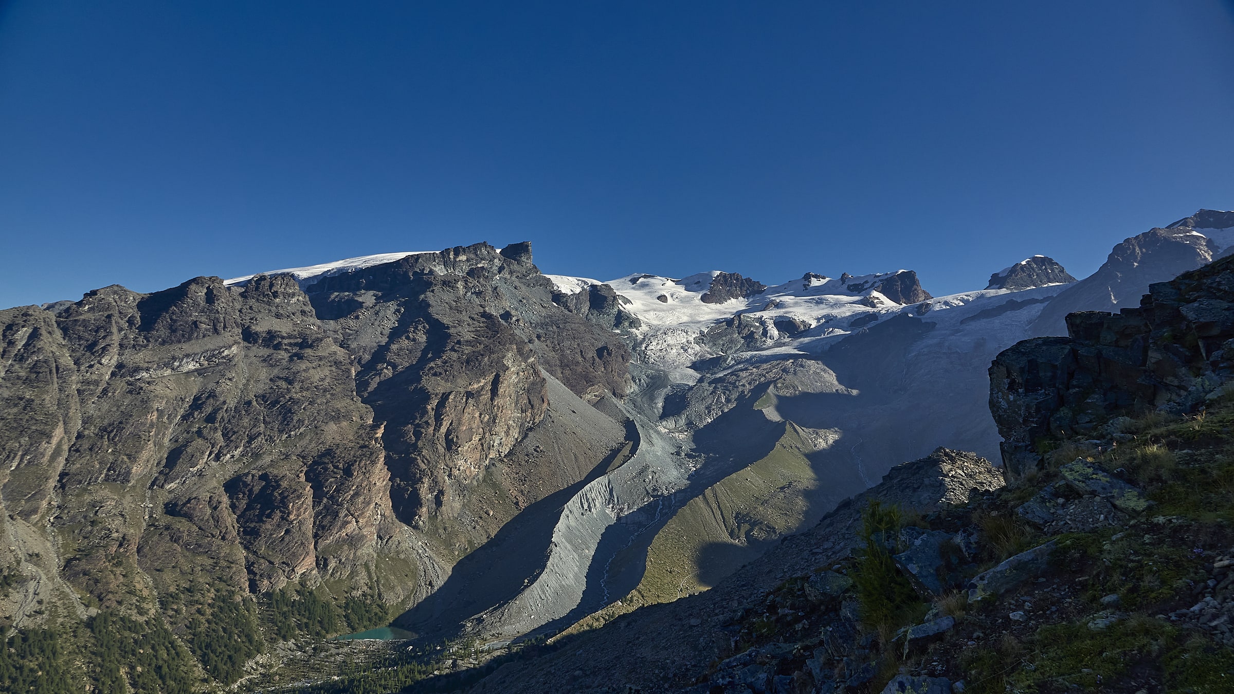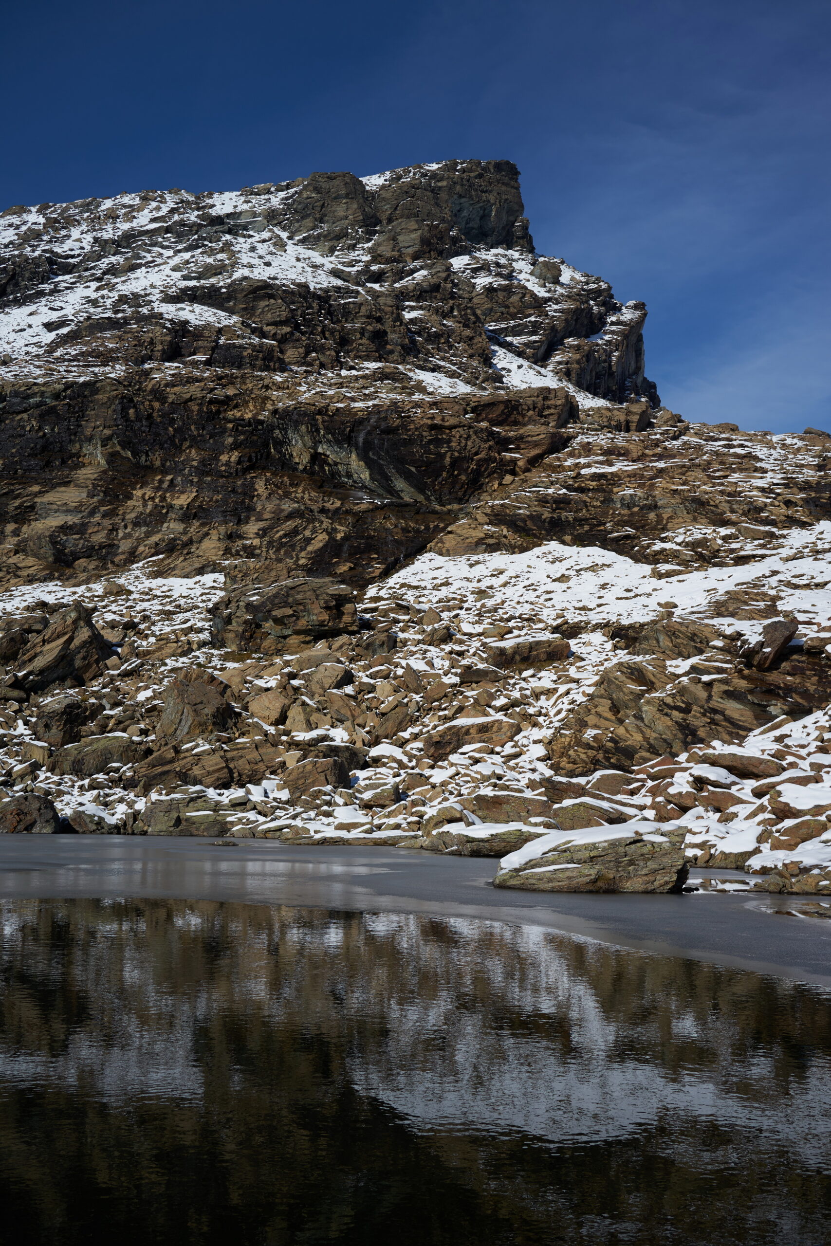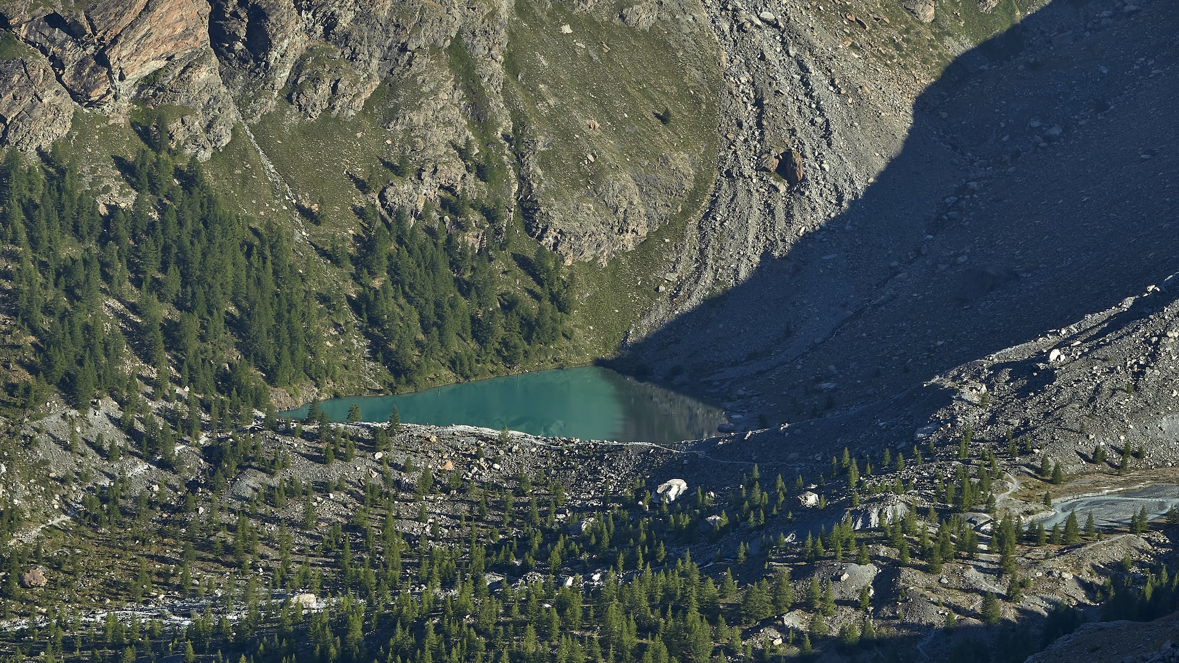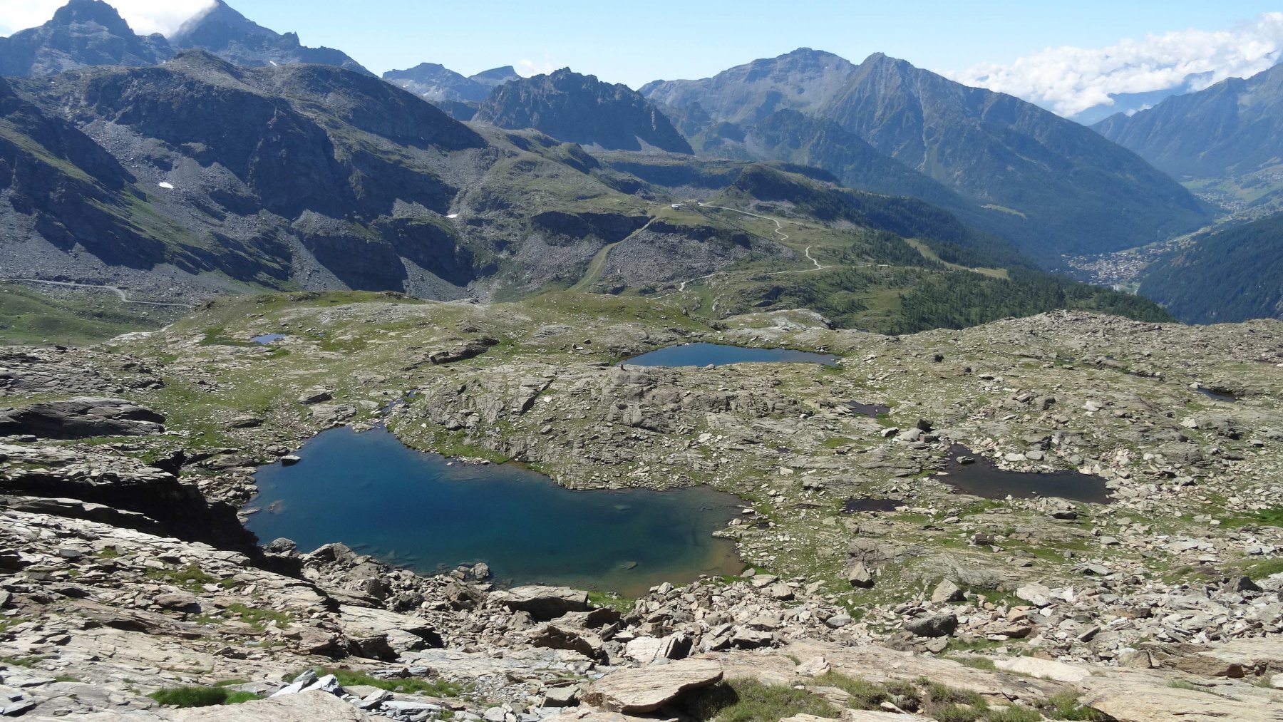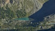 Si lasciano i laghi a destra ben distanti per puntare alla prima fascia di rocce montonate e placche, che si salgono con molta facilità senza percorso obbligato fino a raggiungere un ampio terrazzo erboso sotto la bastionata rocciosa che sorregge il pendio finale.