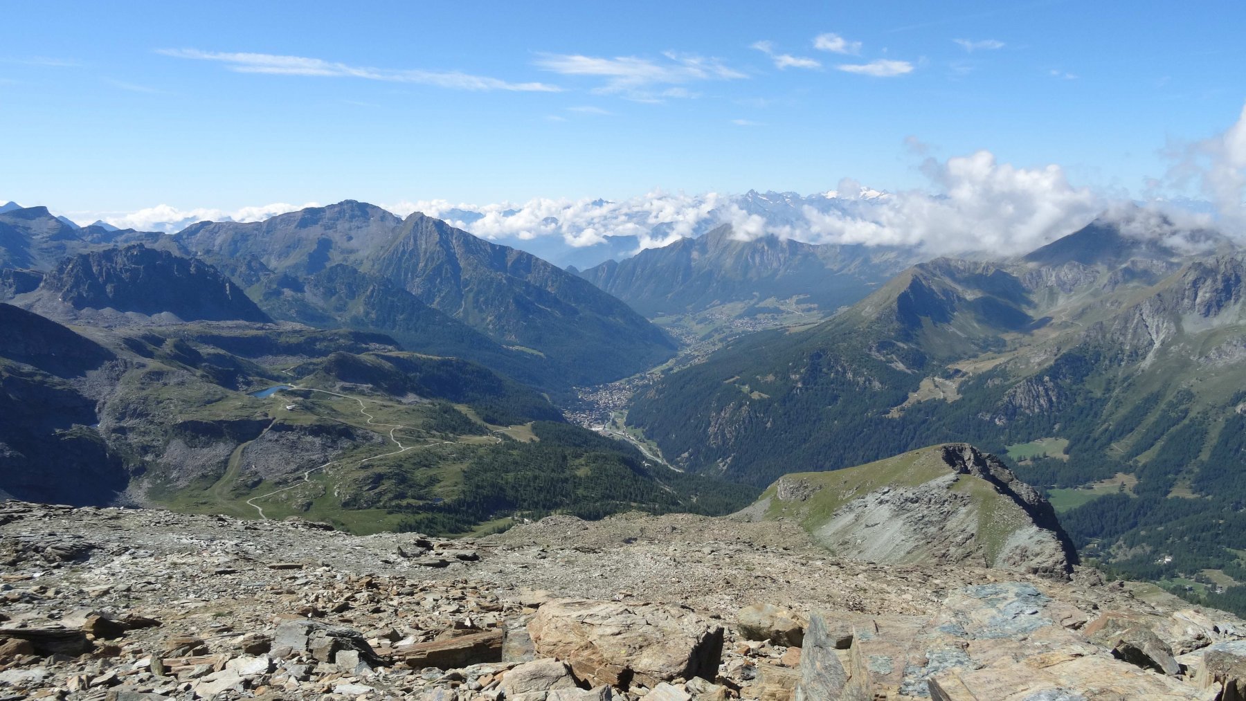 A questo punto si hanno due possibilità: scendere di 50 m sotto la cima sul pendio sud per rintracciare il sentiero 8D e dirigersi verso i laghi, oppure proseguire sul crinale erboso verso est e poi verso nord, seguendo una traccia ed ometti che poi invitano a scendere un pendio di erba e detriti, raggiungendo la valletta alla base del Monte Rosso di Verra. Questa seconda opzione è la più diretta e anche consigliabile.