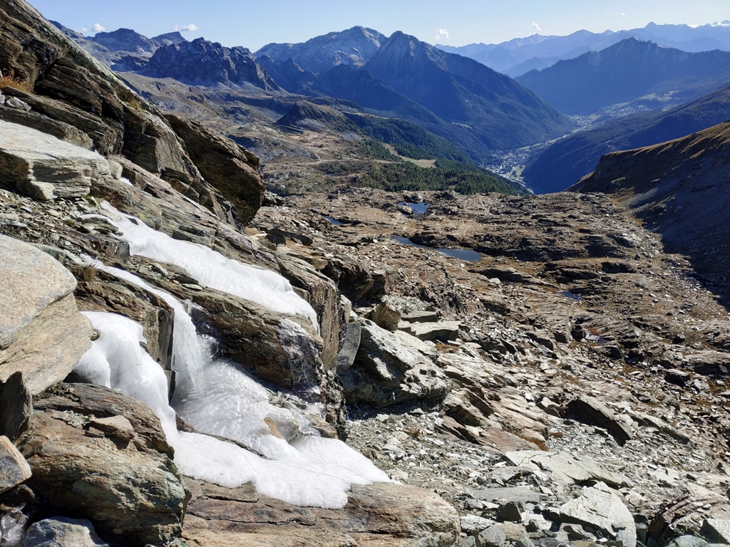 Per la discesa conviene percorrere lo stesso itinerario (quindi ritornando dal camino) fino al terrazzo erboso di quota 2700 m circa, dove se si vuol passare dai bellissimi laghi di Resy (scelta consigliabile) occorre poi proseguire verso sinistra, finchè il percorso sembra sbarrato da una fascia rocciosa. Si individua invece uno stretto canalino incassato tra due fasce rocciose, e lo si scende rapidamente per ghiaia e poi per pietrame sino al primo dei laghi 2531 m. Raggiunto il grosso ometto di pietre si prosegue a destra, rintracciando il sentiero 8D che riporta verso il Palon di Resy. Una breve risalita di circa 70 m di dislivello porta sotto la cima del Palon al bivio già incontrato all’andata, quindi non resta che seguire il sentiero 8C fino a Resy e poi il 9 fino a Saint Jacques.