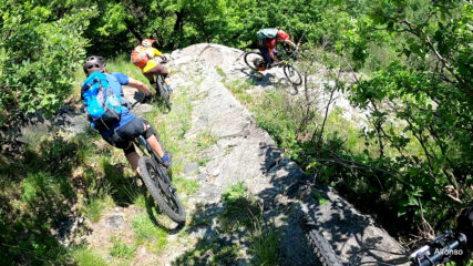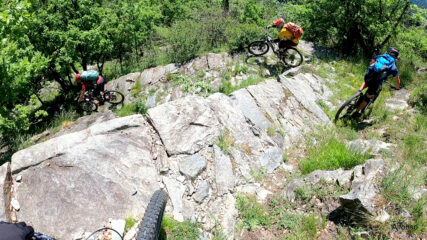 Questa volta da Fornelle siamo scesi per il sentiero 3: è un pò sporco e rovinato dai cinghiali, ma divertente e tecnico il giusto (OC-S3 direi) con qualche passaggino più ardito che abbiamo fatto a piedi. Giunti sulla strada c’è un divieto con indicazione di sentiero interrotto per frana. Carta alla mano abbiamo cambiato al volo e raggiunta la fraz. Champurney alla cappelletta degli alpini abbiamo ripiegato sul 3A. Altrettanto tecnico con qualche passaggio a piedi e alcuni alberi caduti. Proseguito oltre Prè, il sentiero lastricato è stupendo, ma a tratti sporco e con vegetazione rigogliosa. Ci sono un paio di passaggi con alberi caduti; giunti al bivio con il 3B per provare a ritornare sul 3, un cartello di divieto ci ha fatto desistere e abbiamo continuato sul 3A fino ad Arnad con difficoltà leggermente più abbordabili (S2). Con Ti, Lelloz, Bacche e Paolino