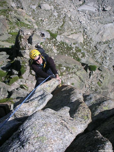 Effettuata una combinazione della prima parte della Piege e poi sempre dritto fino ad uscire sulla sommità per la fessura di dx: 6 tiri su difficoltà continue di 6a-6a+ pressochè interamente da proteggere, molto bello e sostenuto il 4° su una serie di lame e diedri. Doppie da dimenticare 3 su 4 incastrate. Con Enrico e Marco
