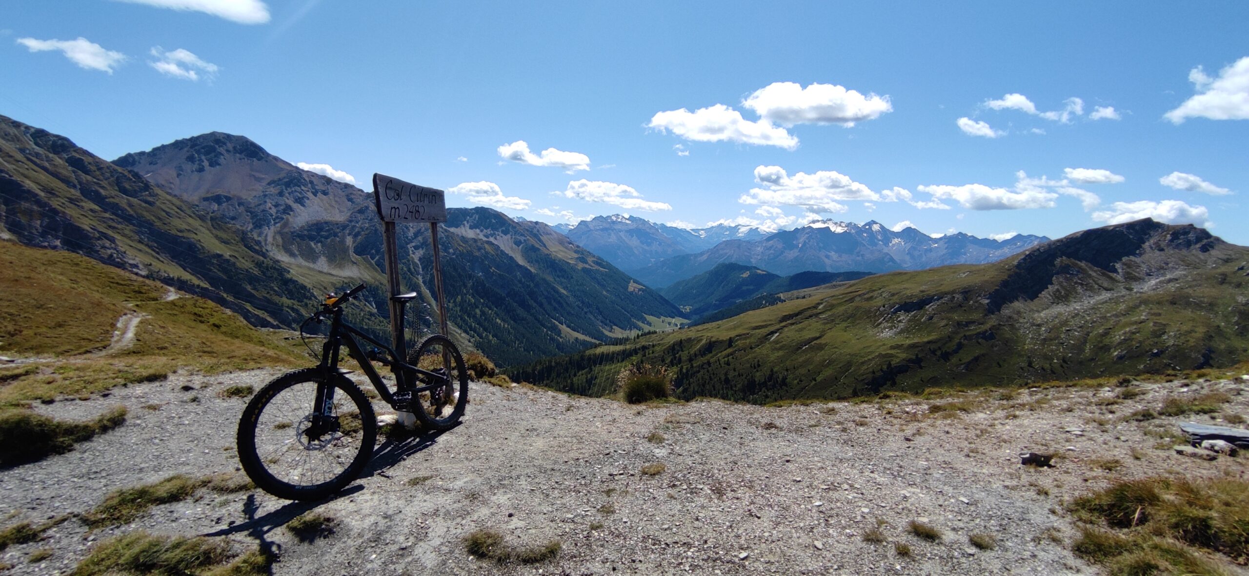 Il sentiero sempre evidente facente parte del TMF sale comodo e permette di spingere la bici per lunghi tratti fino poco sotto il colle,ove una pietraia obbliga a caricare la bici in spalle.