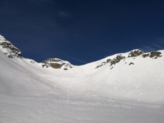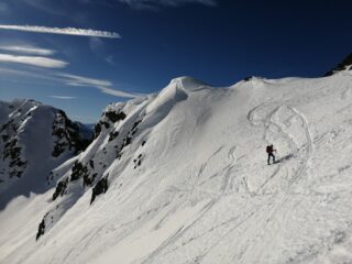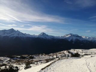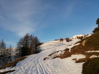 Partenza e arrivo sci ai piedi, ancora per poco. Pianoro con pochissima neve ma si passa. Per non togliere gli sci occorre salire come per la Leysser, tornando poi sulla poderale. Questa è tutta un traverso su firn, scivolosa la mattina col rigelo. Passando accanto alle inquietanti sculture lignee, finalmente parte il pendio che sempre più ripido porta al colle. Ultimi 50 m con buona pendenza, tanto quanto la dorsale. Volendo si arriva in cima con gli sci. Panorama inverosimile. Discesa moooolto attenta sulla dorsale in neve dura [esposizione], poi dal colle tutto semplice su materia prima morbida. Alcuni tratti ventati, ma comunque mai croste o sfondamenti. Qualche numero per evitare di togliere gli assi ma neve simil pista dopo incrocio con traccia Leysser. Consigliata