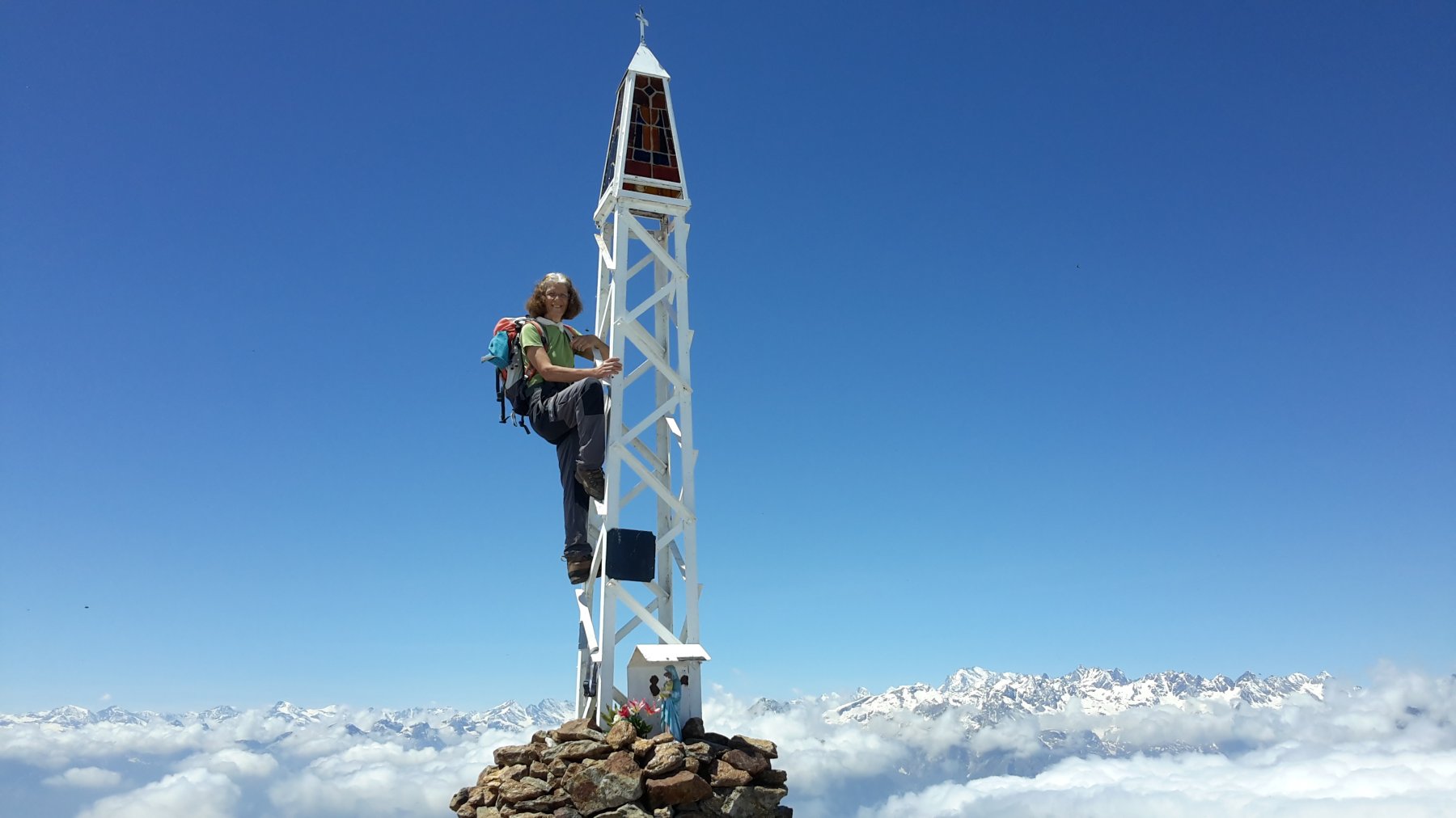 Arrivati in valle Sacra la nebbia era presente fitta sopra i 1500/1600 metri. Lasciata l’auto sopra l’Alpe Frera siamo entrati nella cortina grigia. Sempre bello il bivacco Fornetto, oggi solo per noi. Salendo dopo il bivacco, il sentiero presenta fissurazioni anche importanti e preoccupanti ed a tratti è franato. A 100 metri dalla cima usciti dalla nebbia, il sole ci ha premiati. Sotto di noi panorama come dall’aereo con vista sulle cime più importanti. Incontrato solo due diversamente giovani (come noi) con cane, che si erano fermati a mezz’ora sotto il Fornetto. In discesa a Pian delle nere c’era tutto il mondo nei pratoni di narcisi. Con Gigi e Daniela, a distanza regolamentare…