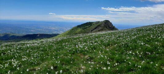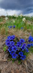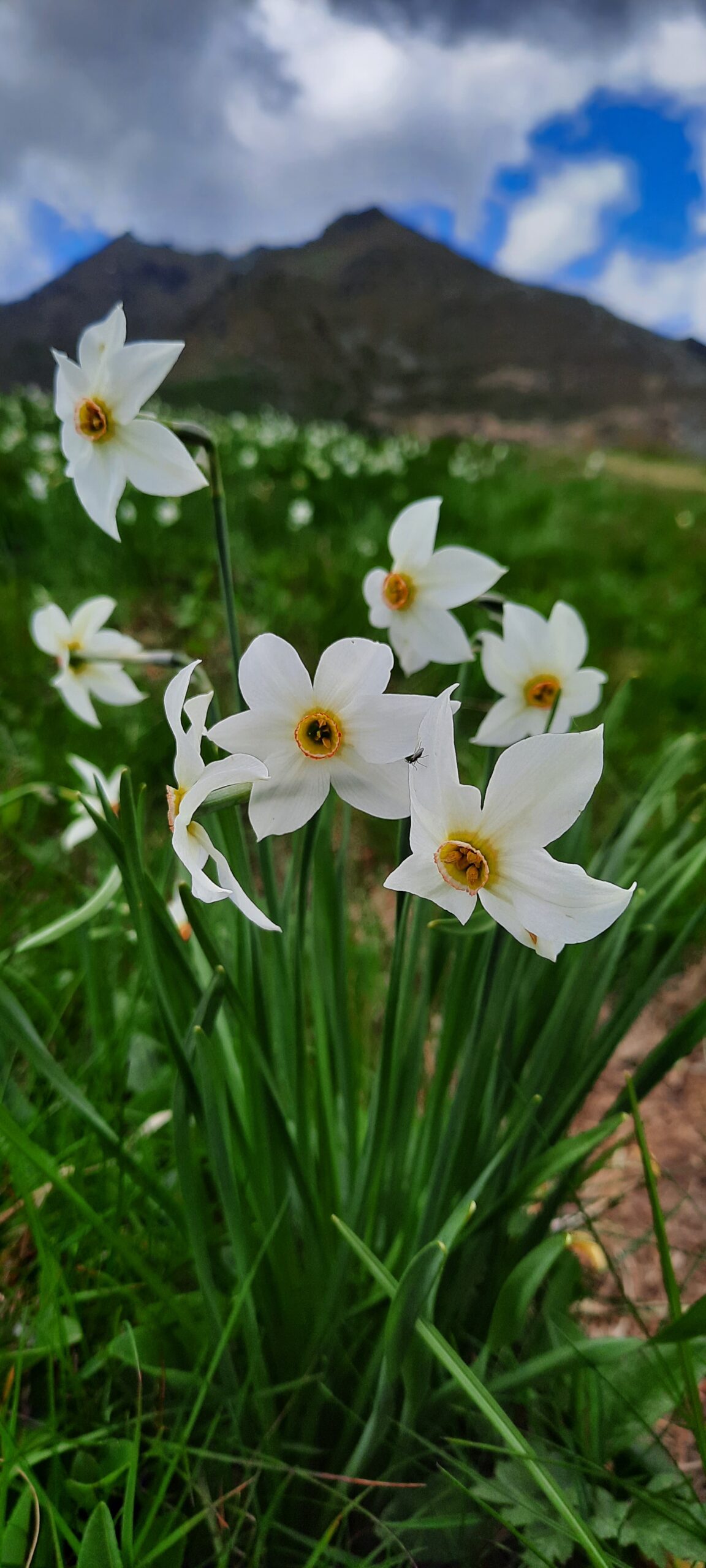Salite dal Pian delle Nere per vedere la fioritura dei narcisi e sgrancirci le gambe, ci siamo incamminate verso il rifugio Fornetto, senza l’ambizione di raggiungerlo visto che avevamo solo il pomeriggio a disposizione. Ci siamo fermate all’Alpe Pistone, deliziate dalle fioriture di narcisi, genziane di Koch e calte palustri e dai giochi di luce delle nuvole che giravano nel cielo.